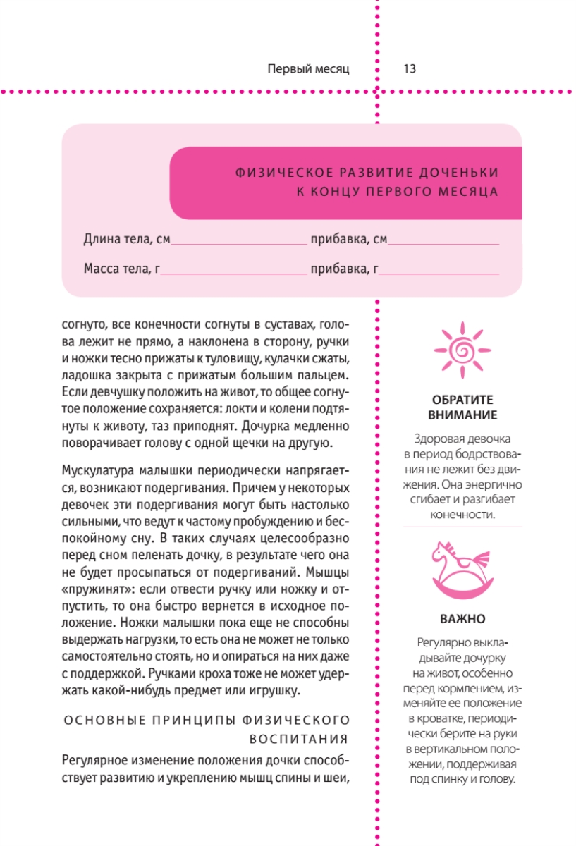 Наш дневник поможет разобраться в том, что происходит с вашей доченькой в первый год ее жизни. Вы научитесь не паниковать, если малышка расплакалась, не бояться кишечных колик и режущихся зубок. Будете радоваться первой улыбке и заливистому смеху вашей девочки, станете замирать от счастья, услышав первое слово и увидев первые шаги. В дневнике специально предусмотрены странички для записи, чтобы вы могли фиксировать все достижения вашей малышки, контролировать ее рост и развитие. Эта книга — уникальный советчик и помощник, а в дальнейшем — семейная реликвия и бесценные воспоминания.