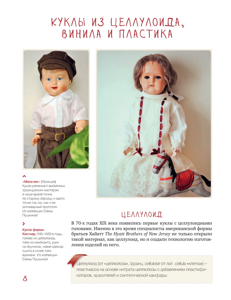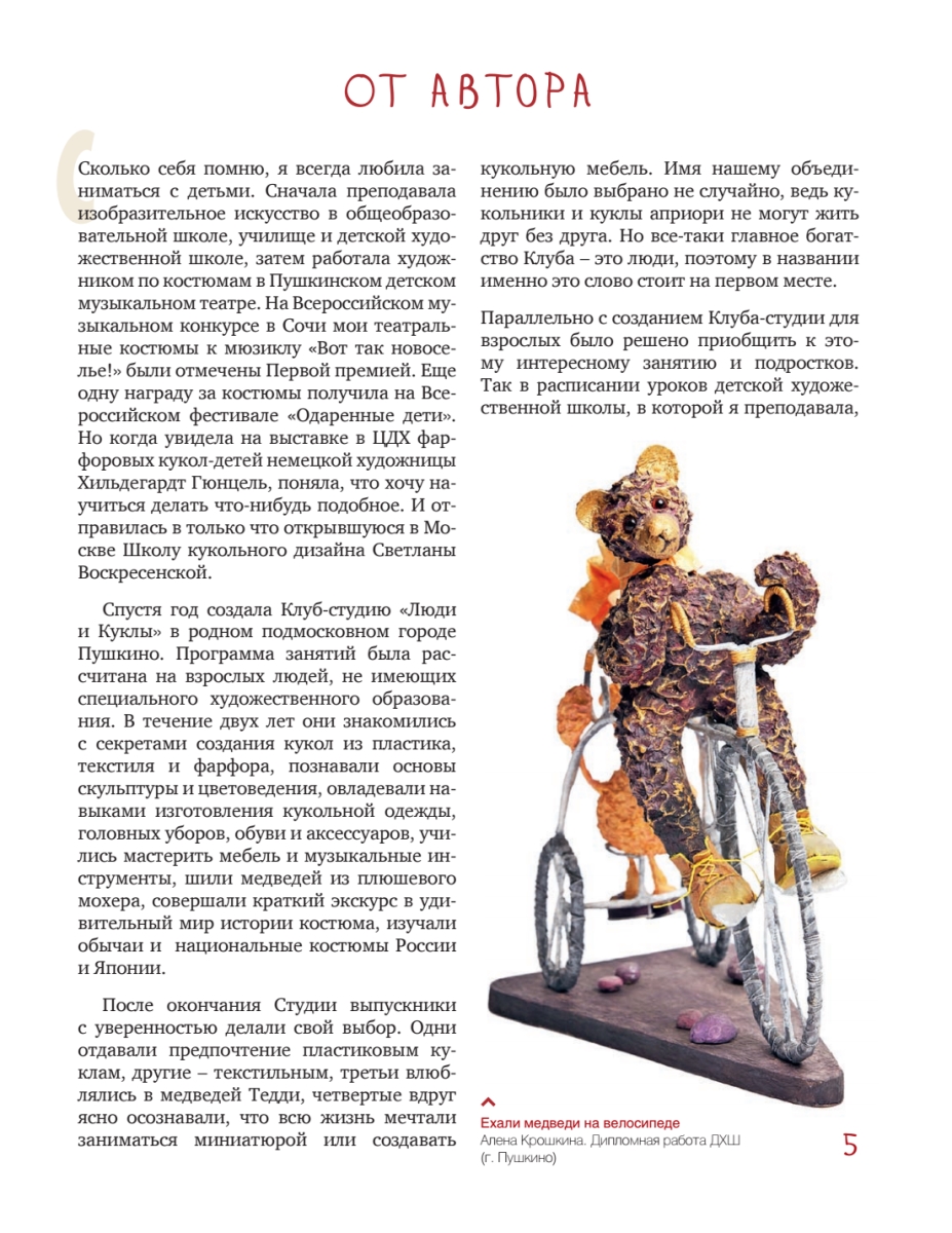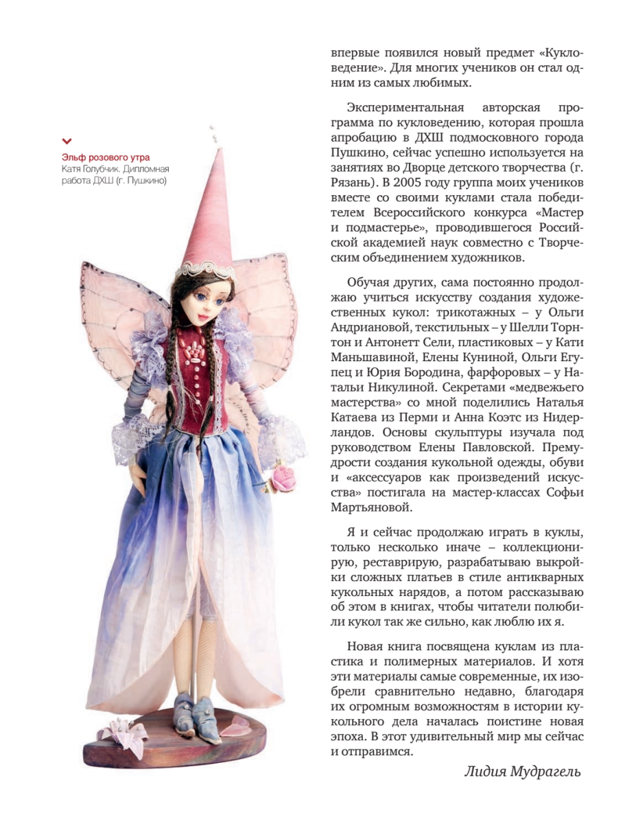 Книга посвящена изготовлению , коллекционированию и реставрации авторских, винтажных, коллекционных и современных кукол из полимерных материалов. Автор рассказывает об их истории, известных коллекциях и мастерах-кукольниках, о приемах создания (лепка, парики, роспись лица), реставрации винтажных кукол в домашних условиях, информирует об огромном разнообразии современных материалов – самоотвердевающих, литьевых и термопластиках, которые теперь доступны любому желающему сделать куклу своими руками. Так же в книге читатель найдет советы «В помощь начинающему мастеру» - основы практической анатомии в переложении для кукол и подробные рекомендации по лепке куклы. Текст книги богато иллюстрирован фотографиями коллекционных художественных кукол, пошагового описания процессов изготовления и реставрации, схемами, авторскими рисунками. Следуя рекомендациям автора, вы сможете не просто узнать много интересного и полюбоваться неповторимыми куклами известных мастеров, но и положить начало собственной коллекции, создав свою первую авторскую куклу.