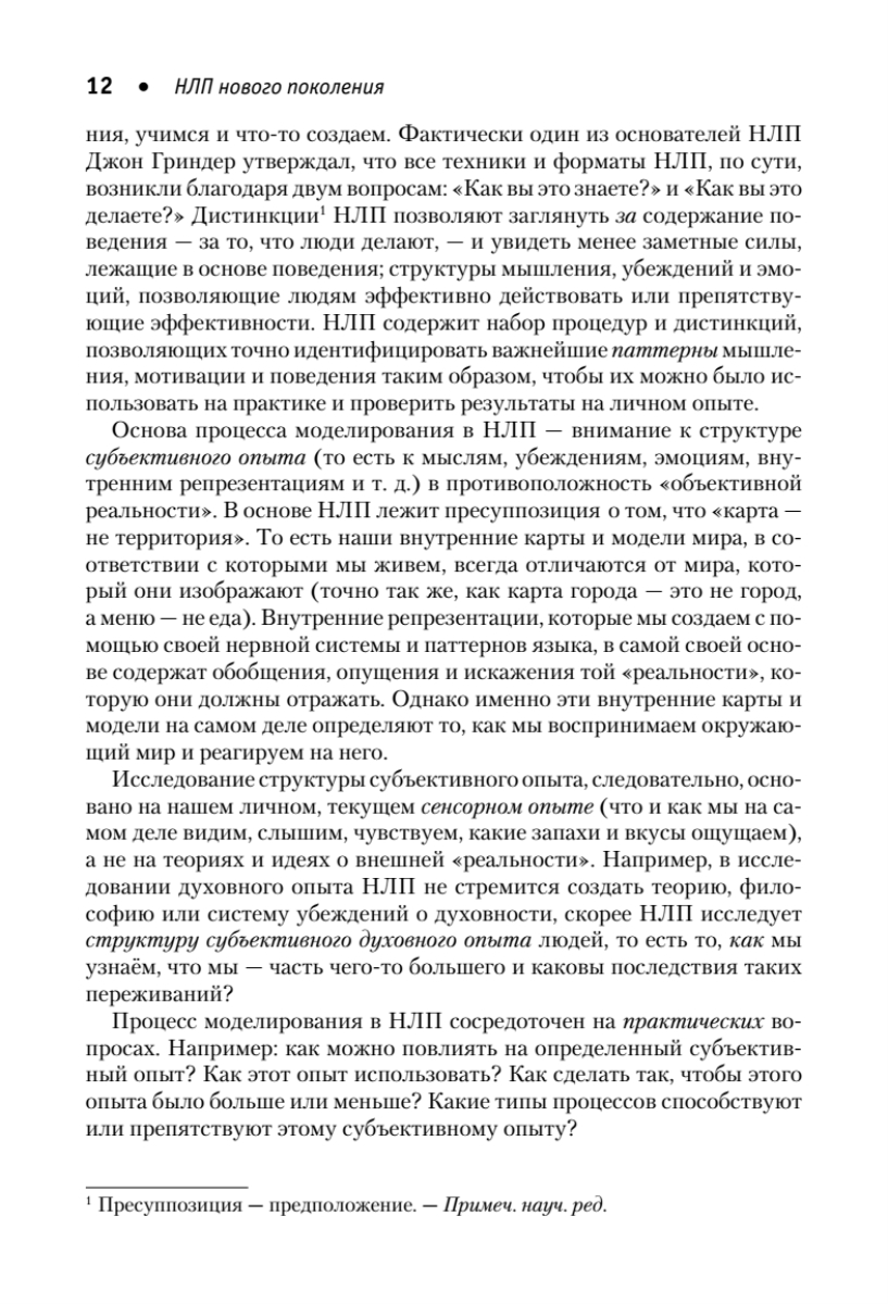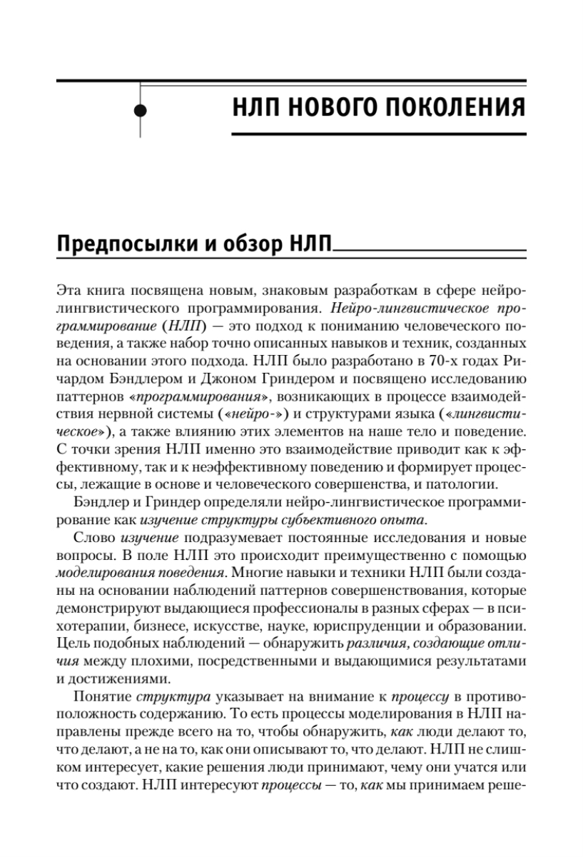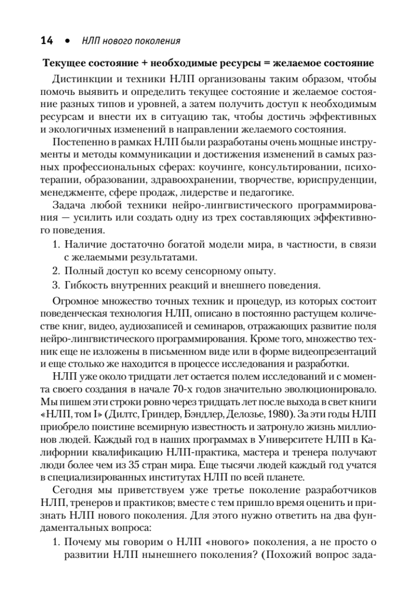 Эта книга посвящена новейшим значительным достижениям в области нейро-лингвистического программирования. Прочитав ее, вы научитесь простым и действенным методам успешной коммуникации, быстрого решения проблем и креативного ответа на нестандартные вызовы современной жизни. Новое поколение НЛП, развившее уникальные методики и основанное на взаимодействии не одного, а трех разумов, находит свое применение в таких разных областях, как коучинг, психологическое консультирование, психотерапия, педагогика, здравоохранение, бизнес, юриспруденция и многие другие. НЛП — это эффективное средство формирования лидерских и управленческих навыков, ускоренного обучения, разрешения конфликтов, повышения мотивации, стимулирования креативности, лечения психических расстройств. Издание адресовано широкому кругу специалистов, работающих в системе «человек—человек», а также всем интересующимся.