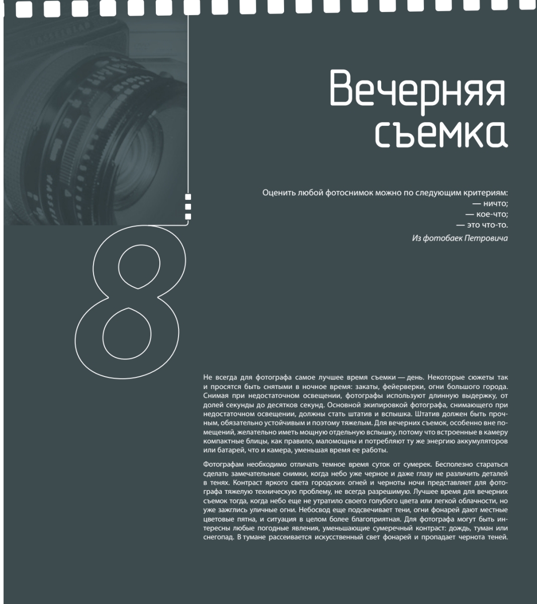 Новое издание книги известного фотографа Александра Беленького рассказывает об основах фотографического творчества. Более чем двадцатилетний опыт работы в газетах и журналах двух столиц и зарубежных изданиях позволил автору просто и понятно описать технические приемы, наиболее часто используемые фотографами в работе. Помимо разделов о композиции и выразительных средствах фотографии большое внимание уделяется способам фотосъемки в таких жанрах, как портрет, пейзаж, спортивная и театральная съемка. Подробно описываются приемы работы со светом: вечерние съемки, солнце в кадре, применение вспышек. Книга иллюстрирована фотографиями автора и его известных коллег.