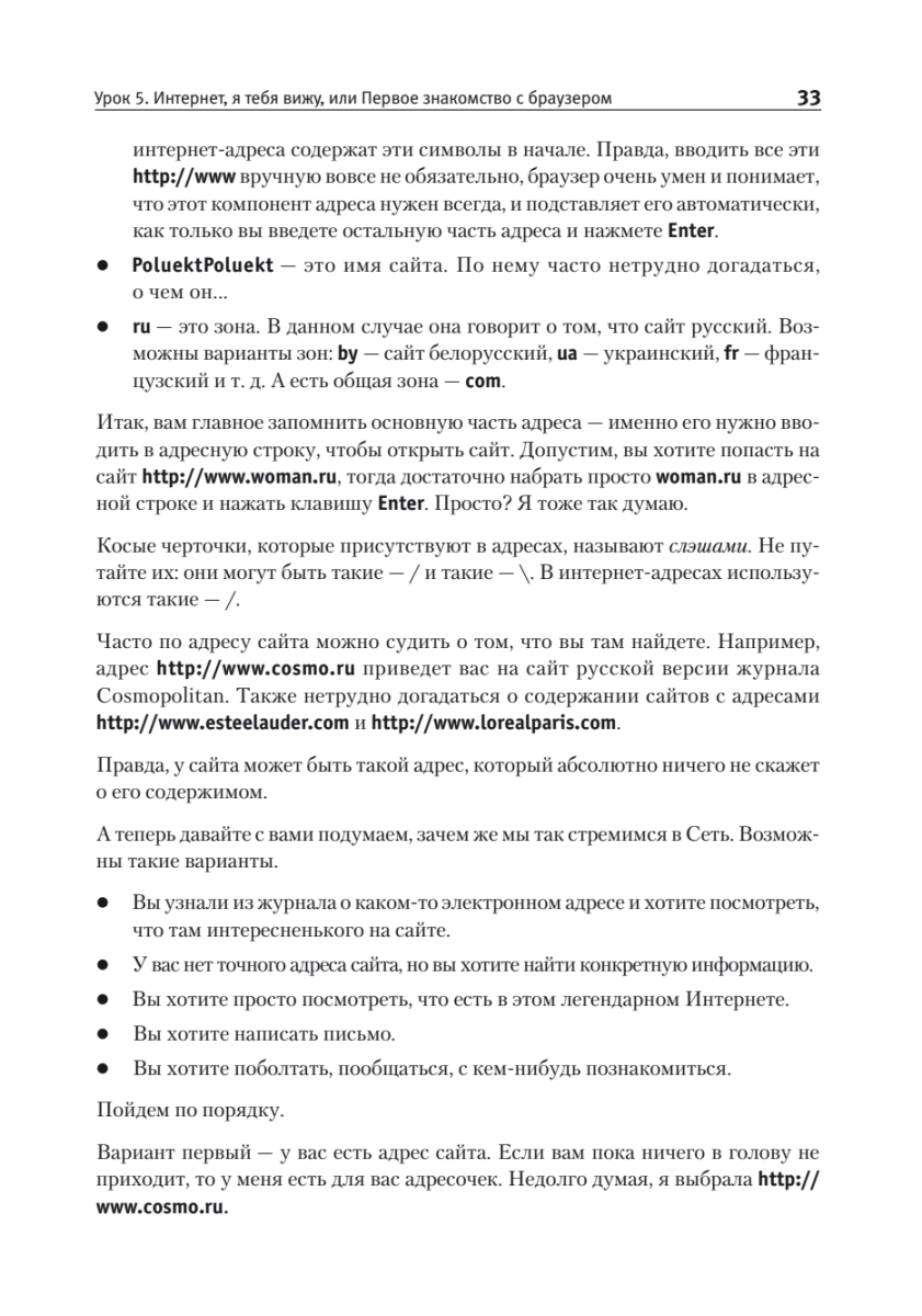 Книга написана специально для женщин в легкой и доступной форме. Из 23 уроков вы узнаете, что такое Интернет, как в него попасть и как с ним обращаться. Вы познакомитесь со всем многообразием возможностей, которые предоставляет Всемирная паутина: научитесь искать и находить нужную информацию, общаться и знакомиться в Интернете, создавать свой блог (а заодно узнаете, что это такое) и просто свободно «плавать» на просторах Глобальной сети. Автор рассказывает также, как создавать и настраивать почтовый ящик, получать и отправлять письма. Не оставлена без внимания и тема безопасности во Всемирной паутине.Самоучитель будет полезен не только женщинам, но и мужчинам, которые помогают окружающим их дамам в нелегком (на первый взгляд) деле освоения Интернета.P.S. Вы спросите, чем второе издание самоучителя отличается от предыдущего? Ну, если честно, первая книга была настолько популярной, что ее давным-давно раскупили и просили еще. Поэтому мы решили издать такую же, но только гораздо лучше! В новом самоучителе описываются более новые технологии, программы и системы (Windows 7, например), о которых вы пока мало знаете и которые скоро с легкостью освоите.