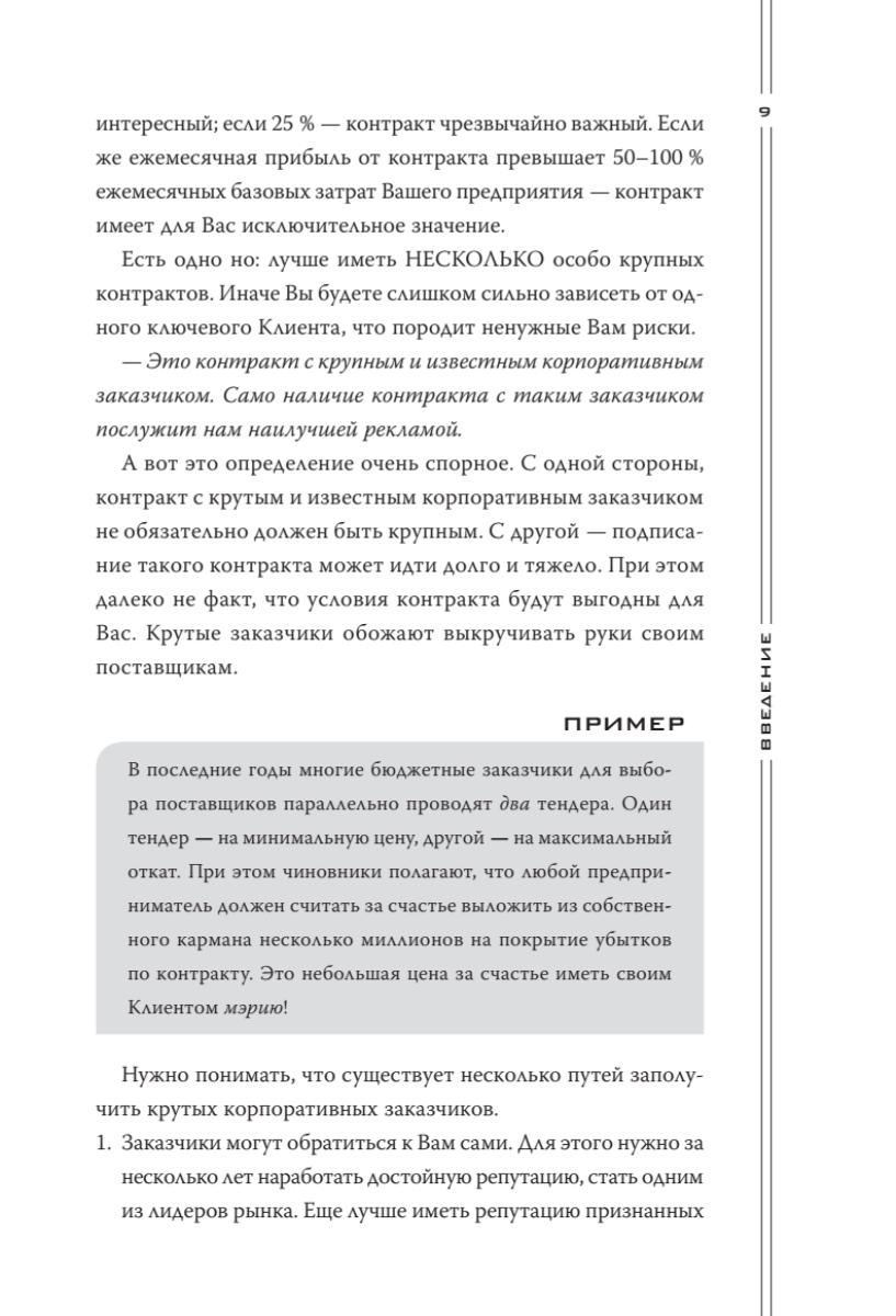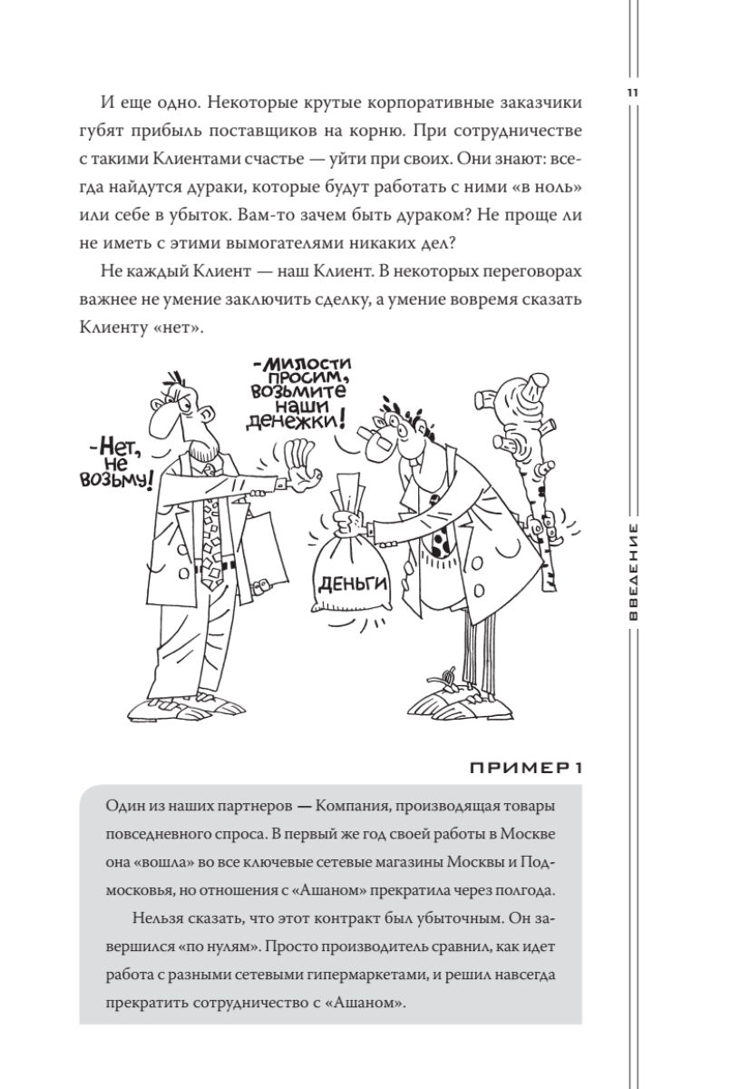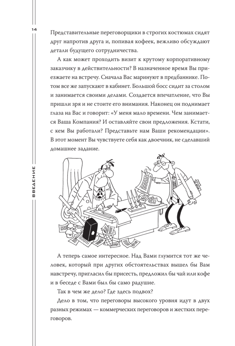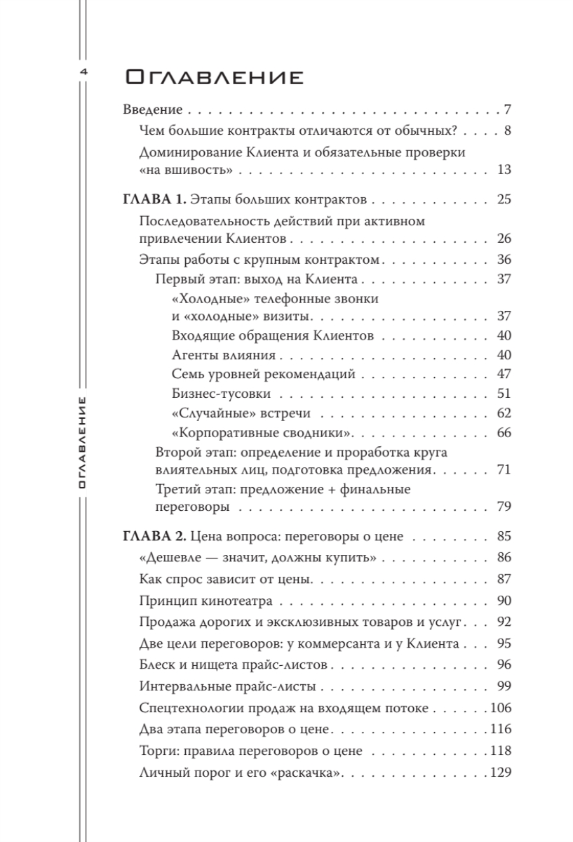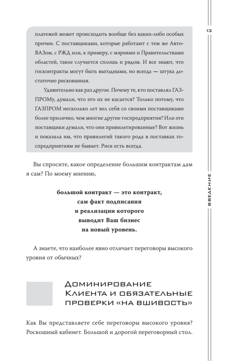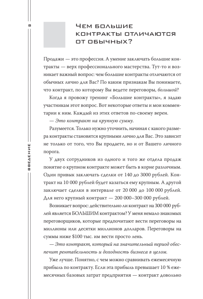 В книге автор отразил ключевую, наиболее эксклюзивную часть личного опыта, который он приобрел за двадцать два года непрерывных переговоров и продаж. Также в книгу вошел опыт многих участников тренингов «Большие контракты» — руководителей продаж, директоров и владельцев различных бизнесов России и СНГ. Опыт самых сильных переговорщиков-практиков — и больше ничего! Книга адресована всем, кто участвует в переговорах и продажах любого уровня: от директоров компаний, руководителей и собственников бизнеса (для которых она будет полезнейшим руководством к действию) - до начинающих менеджеров по продажам (пусть знают, куда им расти!).
