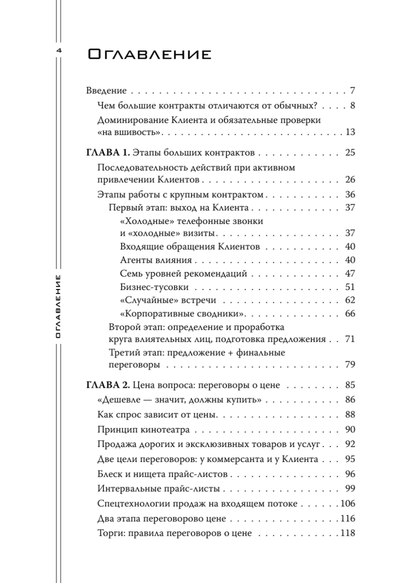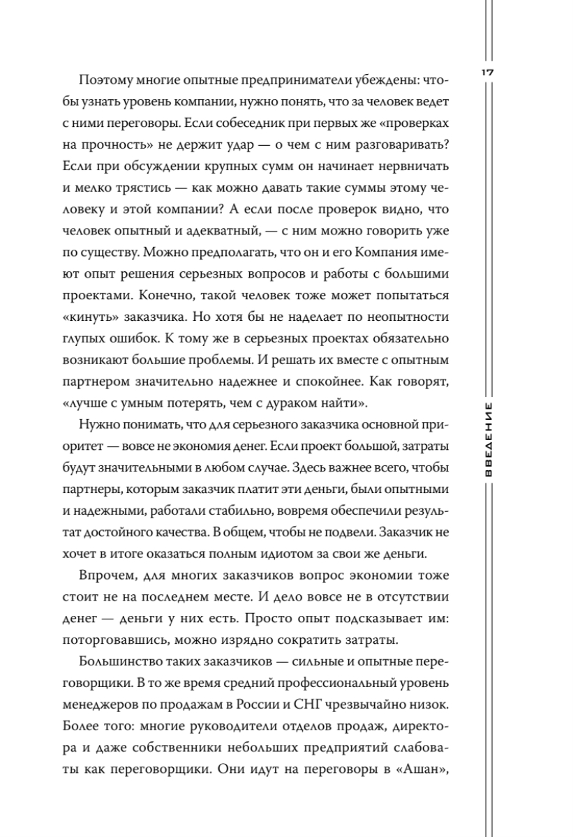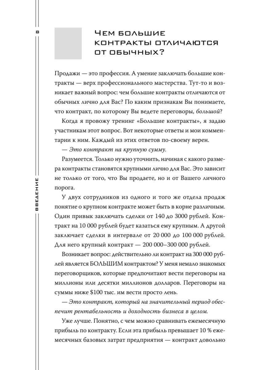 В книге автор отразил ключевую, наиболее эксклюзивную часть личного опыта, который он приобрел за девятнадцать лет непрерывных переговоров и продаж. Также в книгу вошел опыт многих участников тренингов «Большие контракты» - руководителей продаж, директоров и владельцев различных бизнесов России и СНГ. Опыт самых сильных переговорщиков-практиков – и больше ничего!