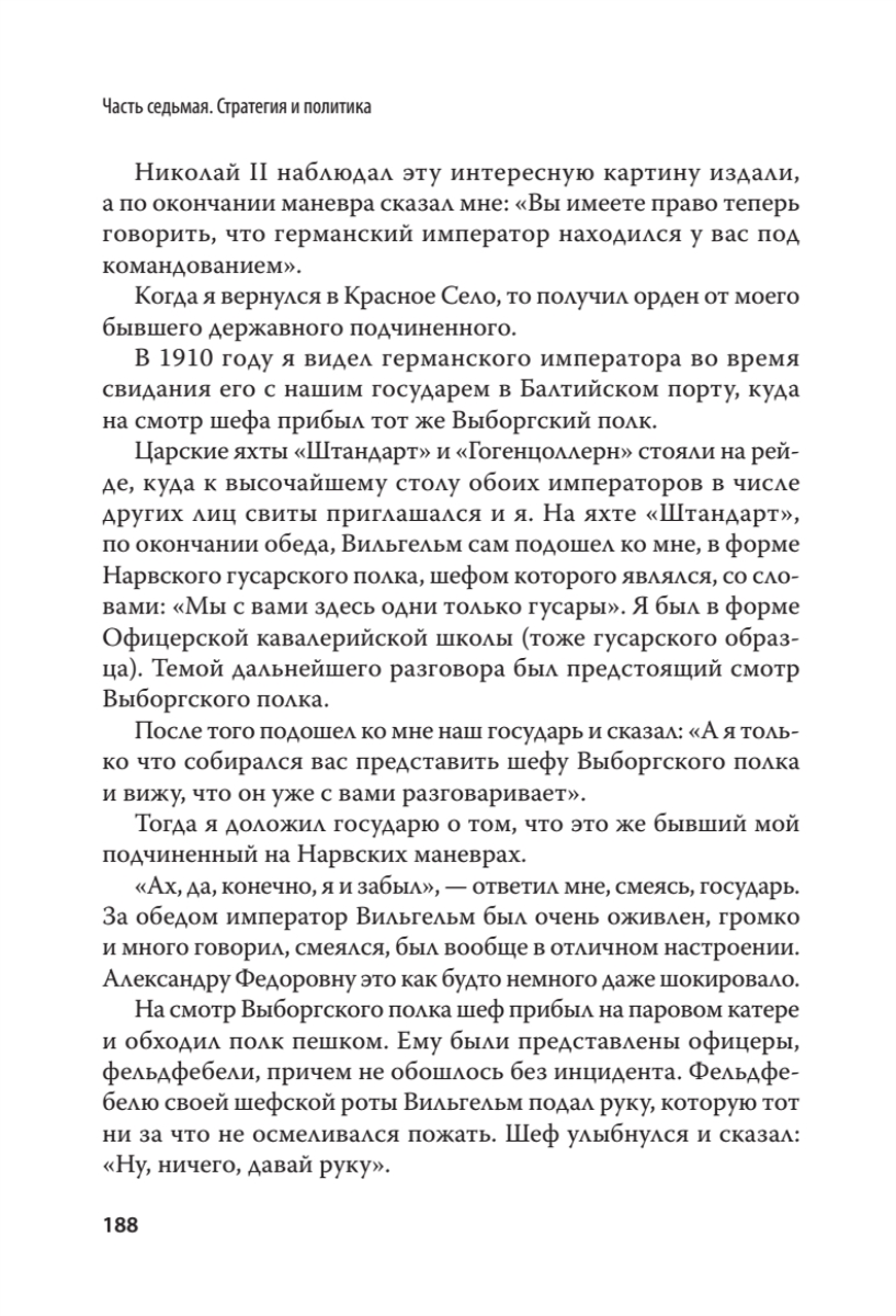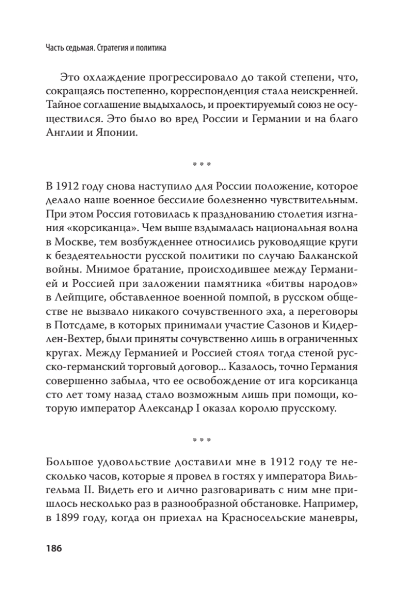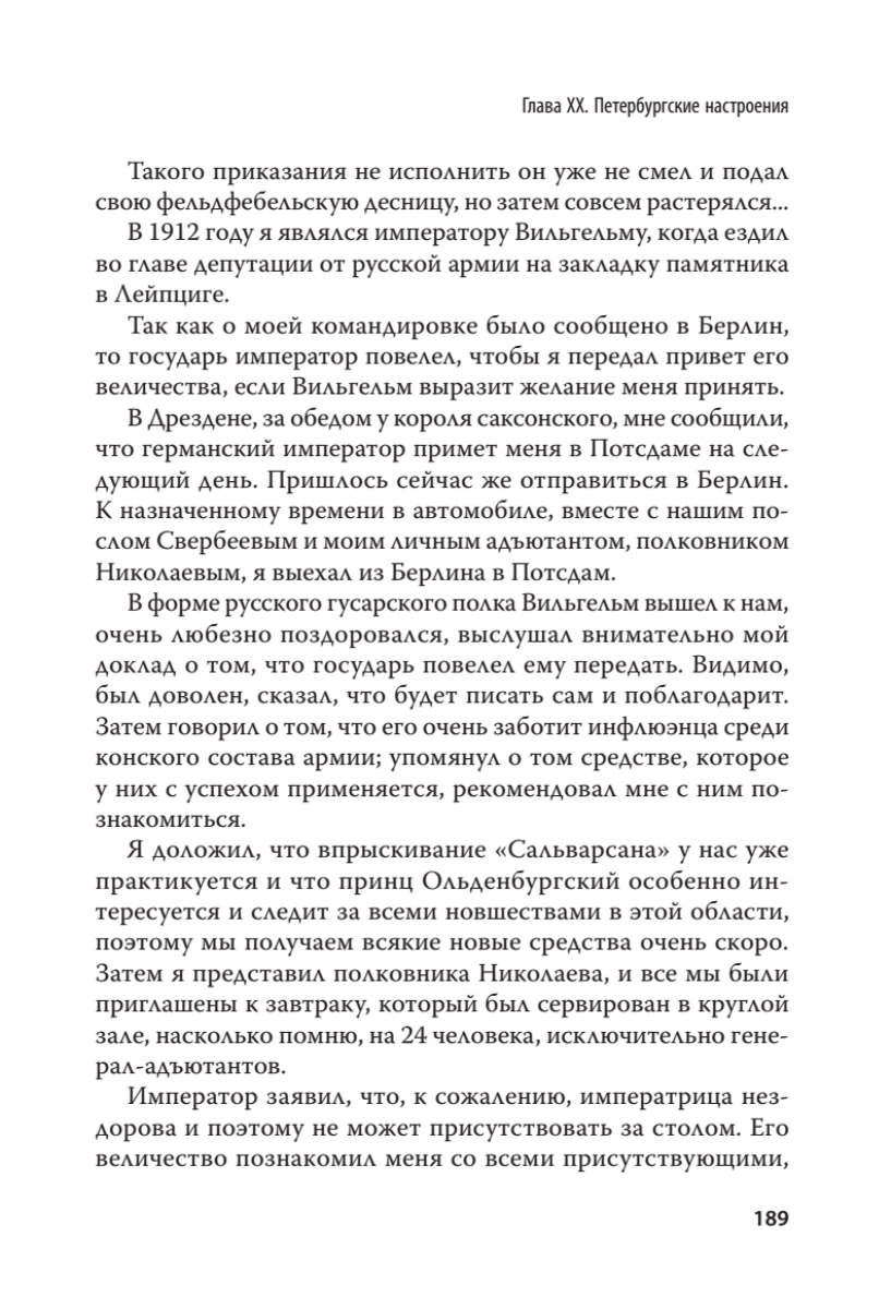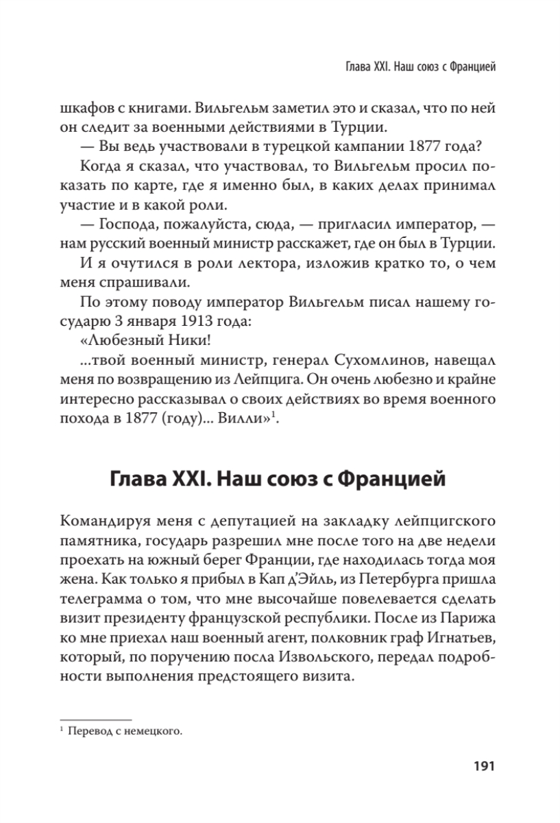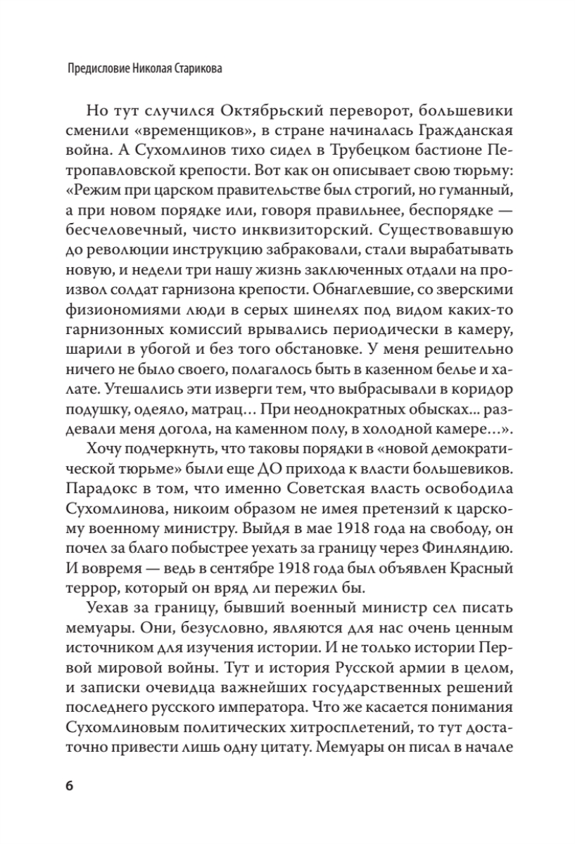 Царский военный министр, которого судил царь, посадил Керенский, а освободил Ленин.Под руководством Владимира Александровича Сухомлинова Россия вошла в Первую мировую войну, чтобы исчезнуть в ее пламени и хаосе революции. А сам он закончил свою карьеру презираемым арестантом, подвергнутым в обществе остракизму. “Никогда Россия не была так хорошо подготовлена к войне, как в 1914 году» - написал в своей книге В. А. Сухомлинов.Освобожденный большевиками, он очень вовремя уехал за рубеж, чтобы оставить нам свои мемуары, которые в России практически не издавались.Мемуары Сухомлинова — это воспоминания офицера и военного министра о русской армии. Это воспоминания царского слуги о государе и власти. Это мемуары “узника совести” о тюрьме, от которой его не уберегли ни чины, ни заслуги.Военных сажали и осуждали задолго до 1937 года. Когда Сухомлинова арестовали, Сталин еще сидел в своей сибирской ссылке.Уверен, что мемуары Сухомлинова добавят много новой информации для вашего понимания истории нашей Родины.Составьте свое собственное мнение…