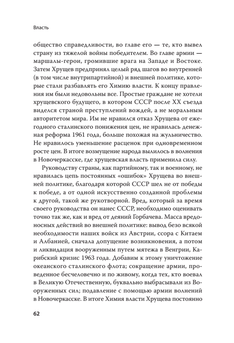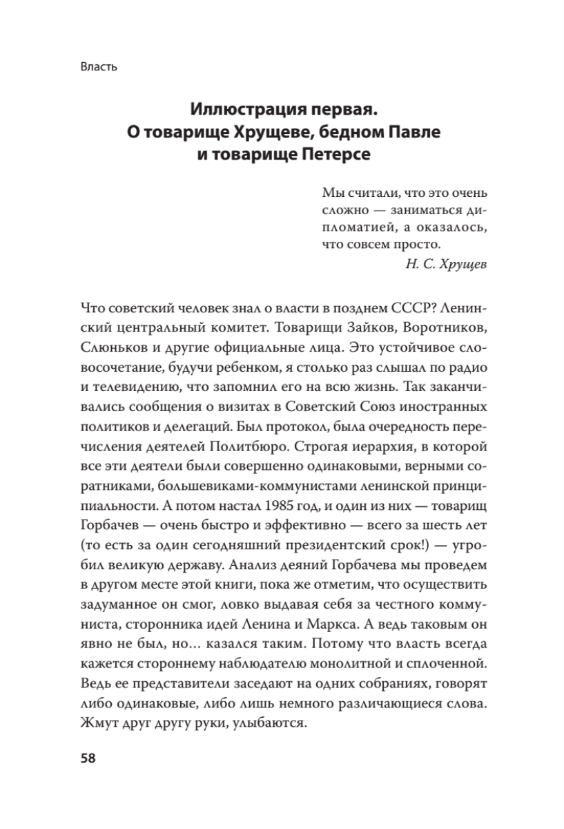 Власть. Что такое власть? Как ее получить и как ее можно потерять? Из чего она состоит и как она исчезает? Почему одного политика люди уважают и слушают, а другого презирают и выгоняют?Ответы на эти и многие другие вопросы — в новой книге Николая Старикова, автора 14 бестселлеров (в том числе «Геополитика. Как это делается», «Национализация рубля — путь к свободе России», «Шерше ля нефть» и др.).• Что такое Физика, Химия и Метафизика власти.• Почему, имея внешние признаки власти, ее регалии, можно не иметь реальной власти.• Нарушая какие правила, Хрущев и Горбачев свою власть разрушали и размывали.• Соблюдая какие принципы, Путин российскую власть приобрел и укрепил.В книге масса исторических примеров. Неизвестные факты. Но главное не это.Главное — власть. И понимание того, как она устроена.Это нужно знать всем, ведь от власти зависит жизнь каждого.Сомневаетесь? Посмотрите на Украину…