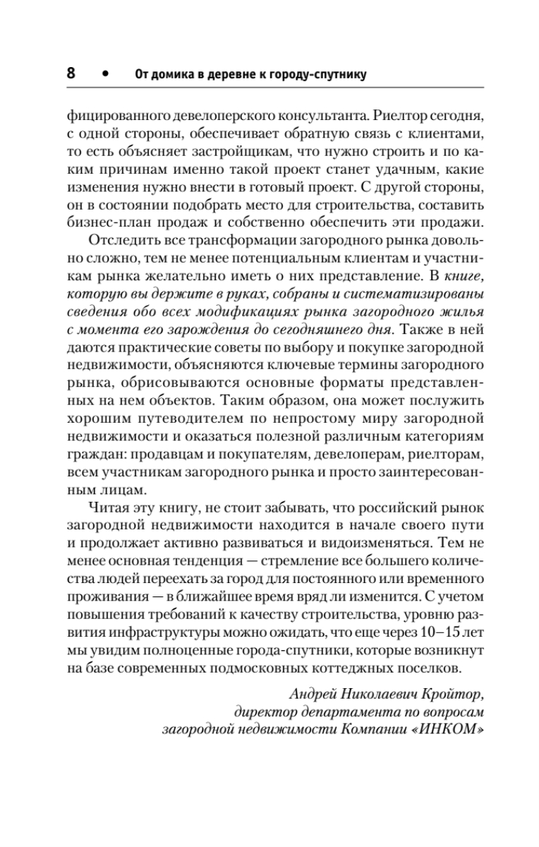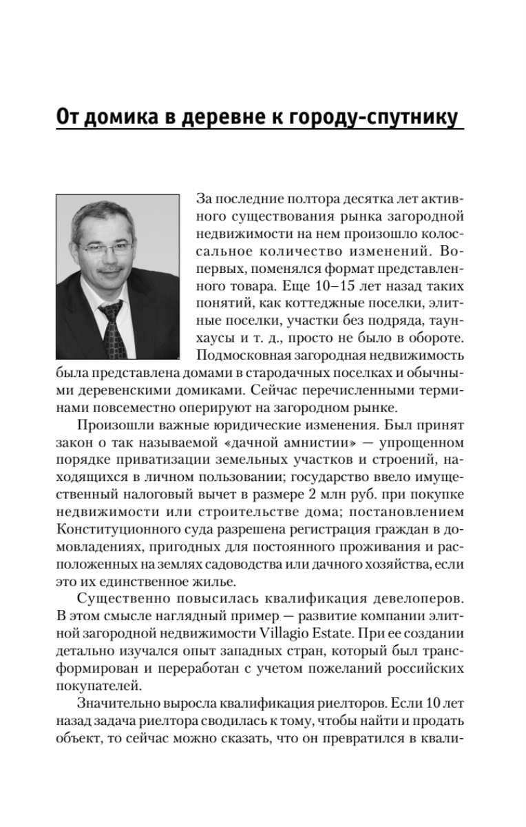 Еще десять—пятнадцать лет назад подмосковная недвижимость ассоциировалась с деревенскими домиками и участками в старых дачных поселках. С тех пор рынок загородного жилья радикально изменился. Появились новые виды собственности, повысился уровень качества загородной жизни, расширился выбор объектов. Ориентироваться в обновленном рынке стало сложнее. Вместе с тем все больше жителей столицы стремятся перебраться в пригород для постоянного или временного проживания.Издание знакомит читателей с историей рынка загородного жилья с момента его зарождения до сегодняшнего дня. В нем вы найдете объяснение ключевых терминов, описание основных видов собственности. Специалисты корпорации «ИНКОМ-недвижимость» дадут практические советы по выбору и покупке жилья, поделятся знаниями о правилах безопасности и юридических тонкостях заключения сделок.Книга может быть полезна планирующим покупку или продажу загородного жилья, а также профессиональным девелоперам и риелторам.