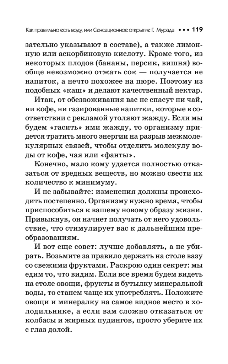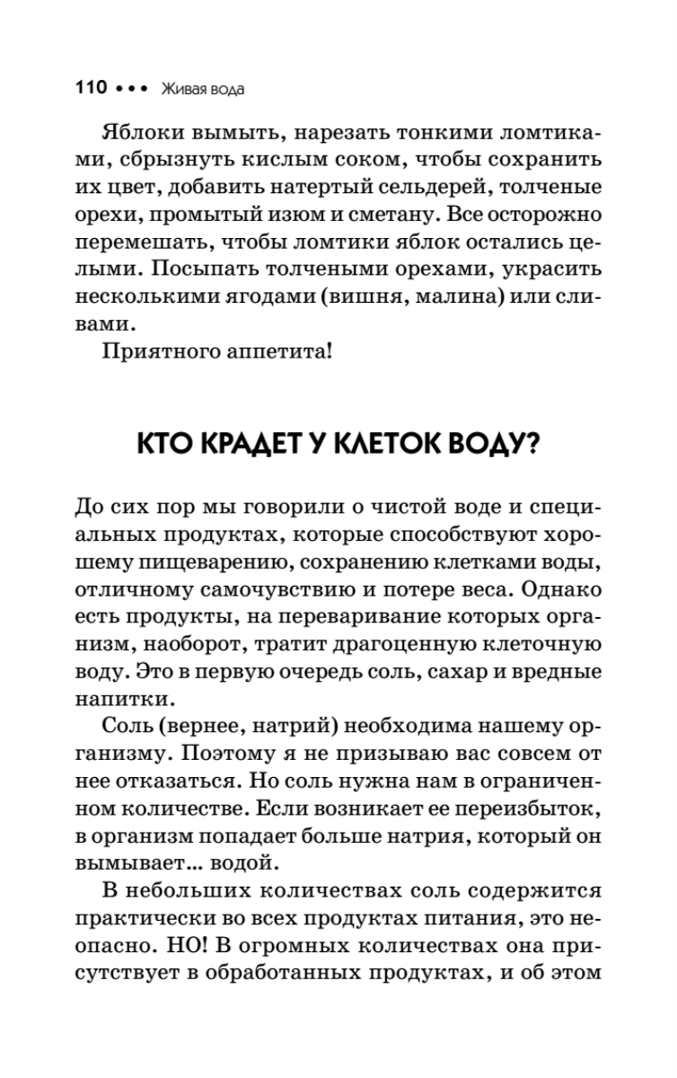 Изнуряете себя диетами, а лишние килограммы не желают вас покидать?Закупаете омолаживающие кремы и коллагеновые комплексы, но морщинки и не думают разглаживаться?Пьете витамины – а здоровья так и нет?Не отчаивайтесь! Рациональное питание, забота о внешнем виде и витамины сделают свое доброе дело. Надо лишь понять, как правильно пользоваться всеми этими средствами.Вода – один из важнейших факторов оздоровления и омоложения. Но не бездумно выпитые литры вернут вам здоровье и молодость. Если хотите сбросить десяток лет и избавиться от лишних округлостей, позаботьтесь о том, чтобы ваши клетки удерживали воду. Ее нужно не просто правильно пить, но и правильно есть! И тогда вобравшие в себя живительную влагу клетки подарят вам прекрасный внешний вид и отменное здоровье.