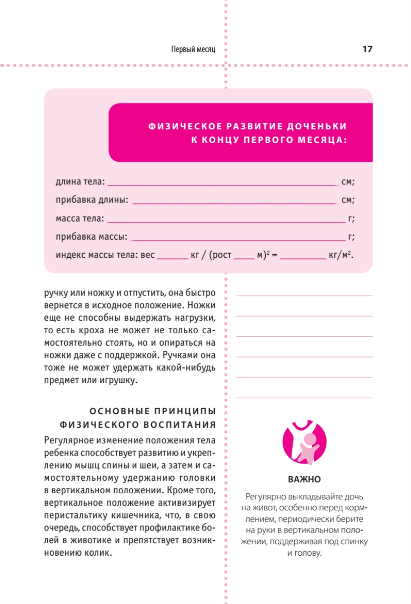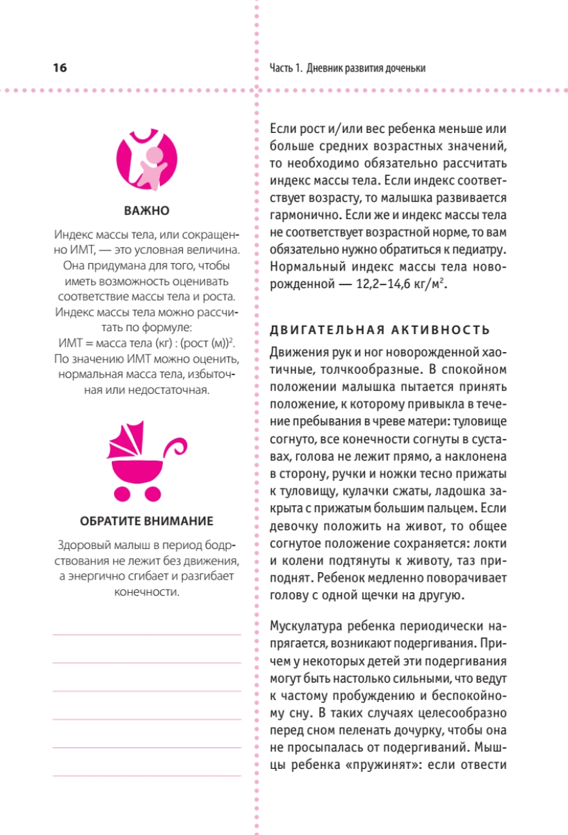 Наш дневник поможет разобраться в том, что происходит с вашей доченькой в первый год ее жизни. Вы научитесь не паниковать, если малышка расплакалась, не бояться кишечных колик и режущихся зубок. Будете радоваться первой улыбке и заливистому смеху вашей девочки, станете замирать от счастья, услышав первое слово и увидев первые шаги. В дневнике специально предусмотрены странички для записи, чтобы вы могли фиксировать все достижения вашей малышки, контролировать ее рост и развитие. Эта книга — уникальный советчик и помощник, а в дальнейшем — семейная реликвия и бесценные воспоминания.