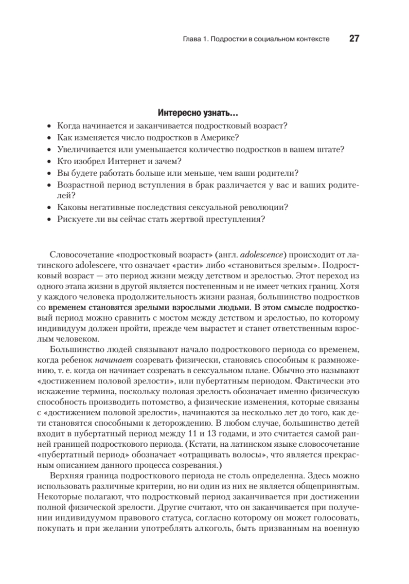Учебное пособие объективно отражает современный мировой уровень развития психологии пубертатного возраста — одного из сложнейших и социально значимых разделов возрастной психологии. Превращение ребенка во взрослого — сложный и драматический процесс, на ход которого влияет огромное количество разнообразных факторов: от генетики и физиологии до политики и экологии. Эта книга, выдержавшая за рубежом 12 изданий, дает в распоряжение отечественного читателя огромный теоретический, экспериментальный и методологический материал, наработанный западной психологией, медициной, социологией и антропологией, в талантливом и стройном изложении Ф. Райса и К. Долджин, лучших представителей американской гуманитарной науки. Рекомендуется студентам гуманитарных специальностей, психологам, педагогам, социологам, юристам и социальным работникам.