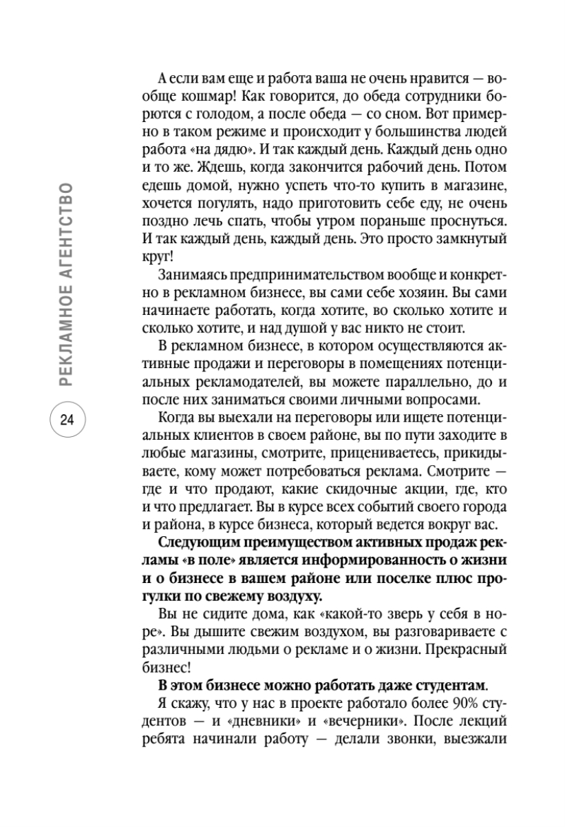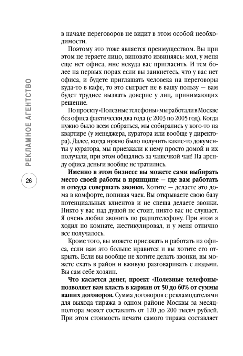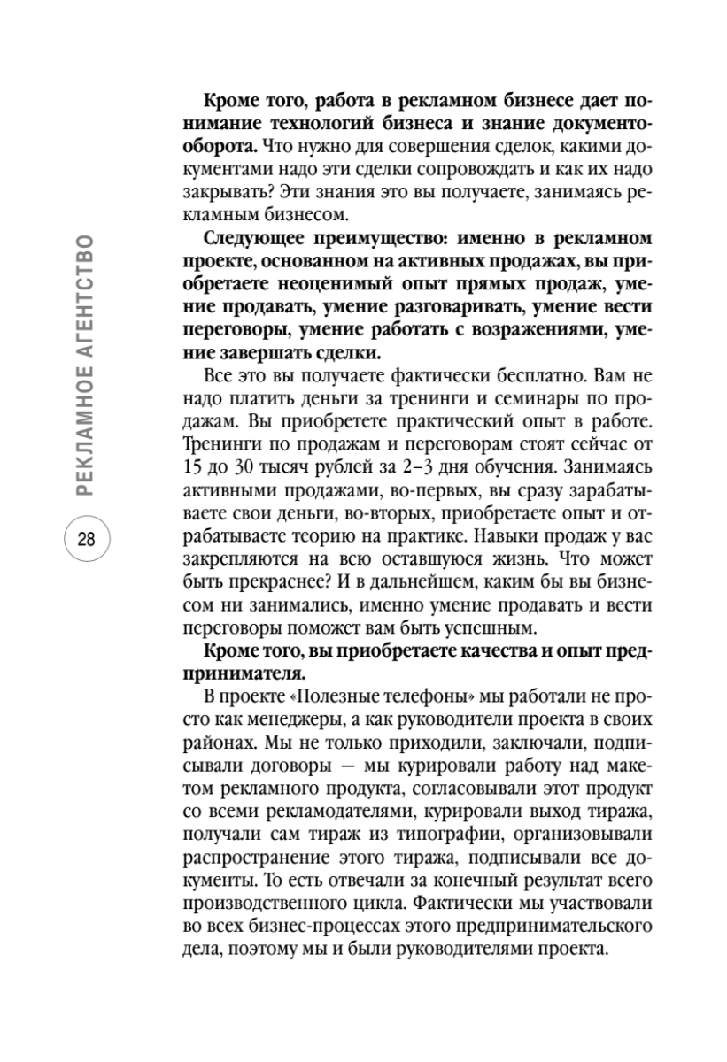 Как открыть рекламное агентство и преуспеть? Из книги вы узнаете, как открыть рекламную компанию и организовать высокоэффективный отдел продаж в любом городе с минимальными рисками, вообще не обладая ни опытом, ни знаниями, ни связями, ни первоначальным капиталом. В издании подробно описано, как грамотно выбрать и протестировать идею рекламного носителя или услуги, как просчитать возможные доходы и расходы, срок окупаемости и прибыль, как зарегистрировать фирму, где брать клиентов, как вести активные продажи, как и где нанимать и обучать менеджеров продаж, как их контролировать и мотивировать. Весь материал построен на основе непосредственного многолетнего практического опыта автора, изложен в легкой форме в виде пошаговых инструкций, рекомендаций и домашних заданий. Для роста вашего бизнеса рассматриваются ключевые вопросы увеличения прибыли, делегирования задач и автоматизации, чтобы бизнес работал с минимальным вашим участием. Даются ссылки на дополнительные материалы по теме. Книга станет настольной для начинающих предпринимателей, рекламных агентств и фирм, занимающихся активными продажами в секторе B2C, которые найдут в ней много полезных приемов и фишек для ведения своего бизнеса.