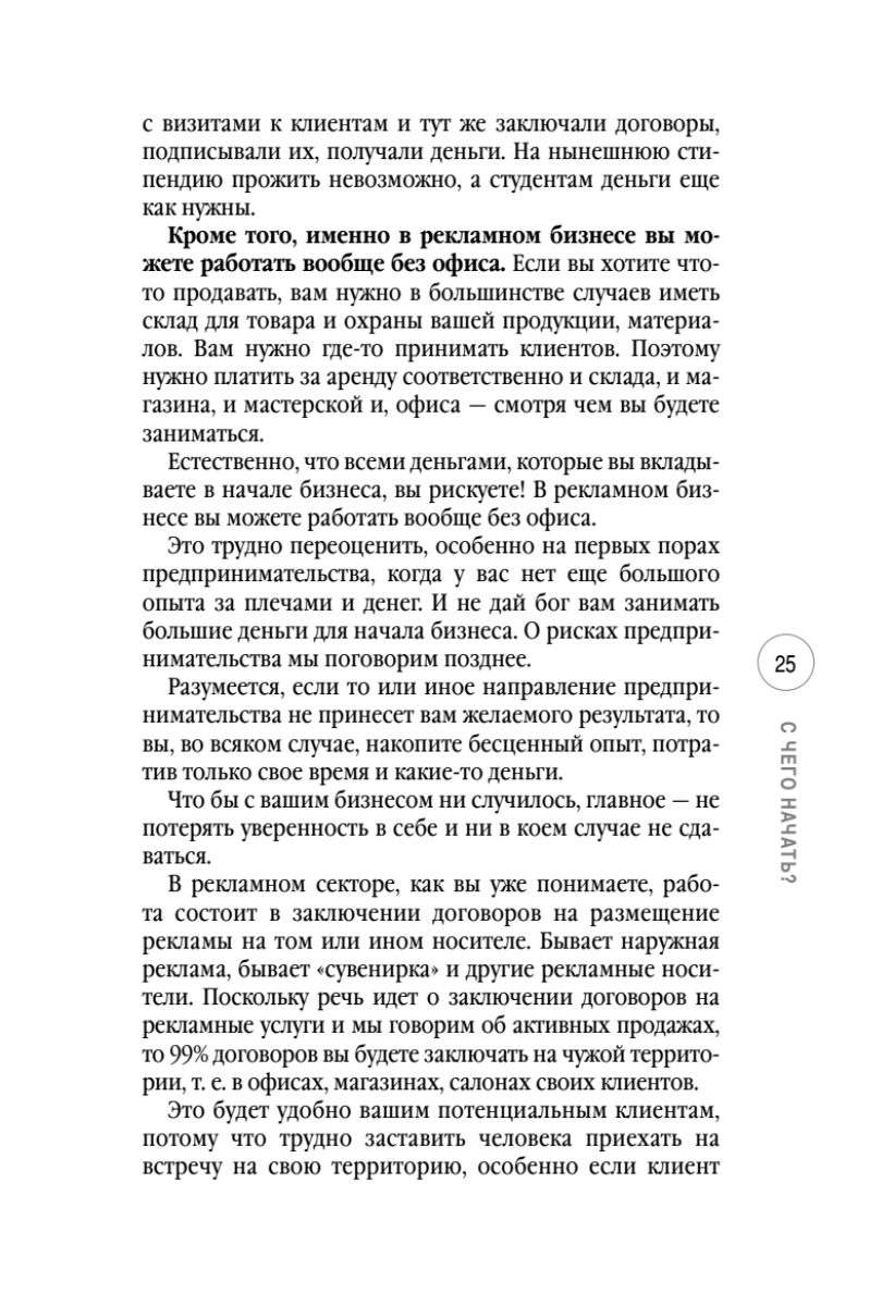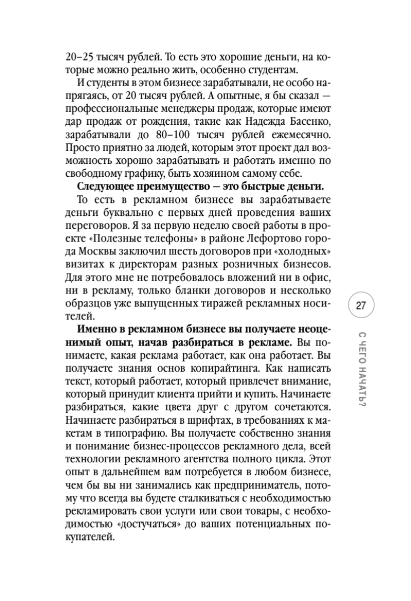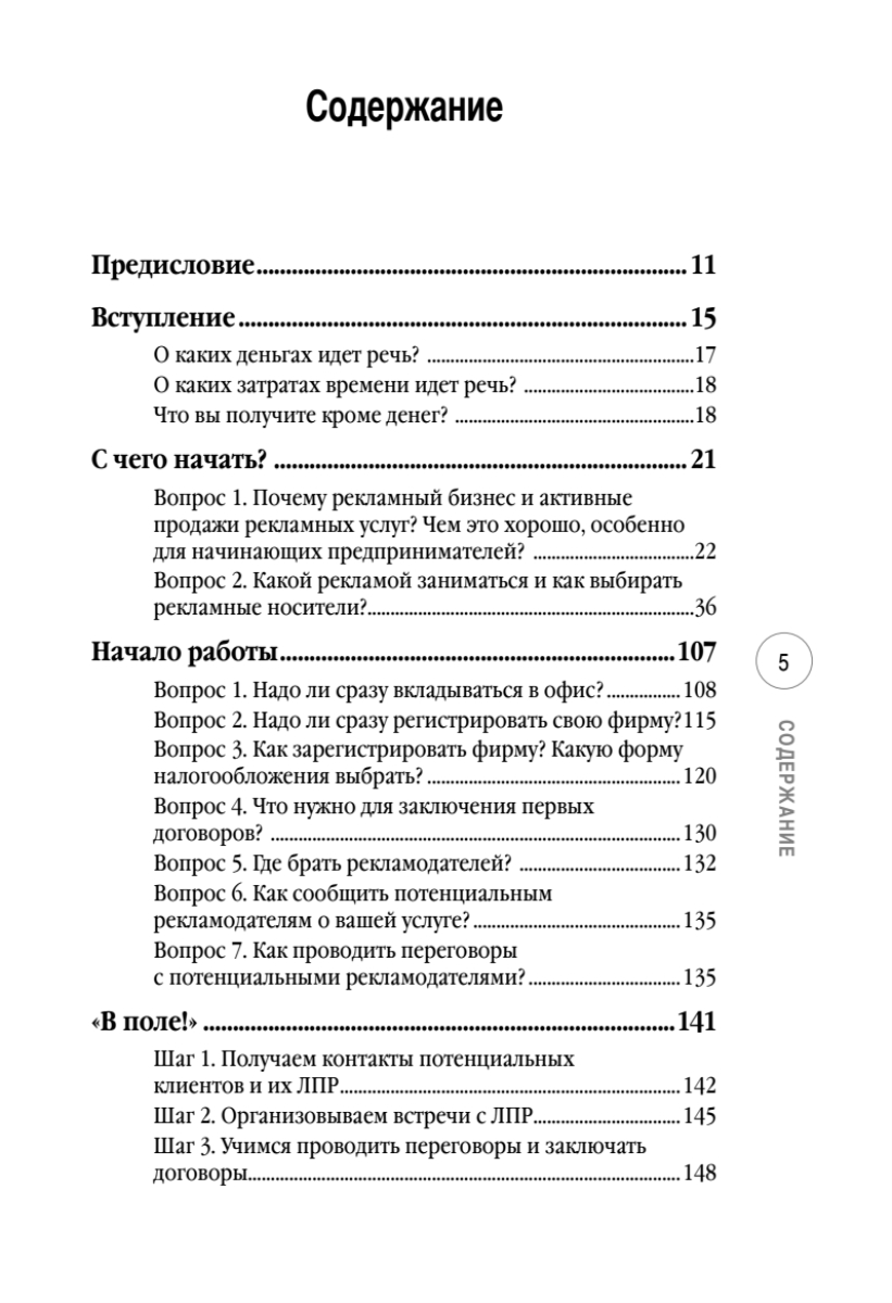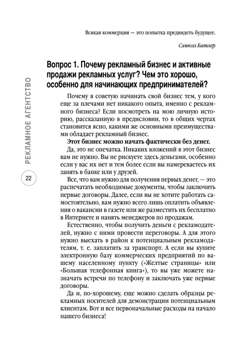 Как открыть рекламное агентство и преуспеть? Из книги вы узнаете, как открыть рекламную компанию и организовать высокоэффективный отдел продаж в любом городе с минимальными рисками, вообще не обладая ни опытом, ни знаниями, ни связями, ни первоначальным капиталом. В издании подробно описано, как грамотно выбрать и протестировать идею рекламного носителя или услуги, как просчитать возможные доходы и расходы, срок окупаемости и прибыль, как зарегистрировать фирму, где брать клиентов, как вести активные продажи, как и где нанимать и обучать менеджеров продаж, как их контролировать и мотивировать. Весь материал построен на основе непосредственного многолетнего практического опыта автора, изложен в легкой форме в виде пошаговых инструкций, рекомендаций и домашних заданий. Для роста вашего бизнеса рассматриваются ключевые вопросы увеличения прибыли, делегирования задач и автоматизации, чтобы бизнес работал с минимальным вашим участием. Даются ссылки на дополнительные материалы по теме. Книга станет настольной для начинающих предпринимателей, рекламных агентств и фирм, занимающихся активными продажами в секторе B2C, которые найдут в ней много полезных приемов и фишек для ведения своего бизнеса.