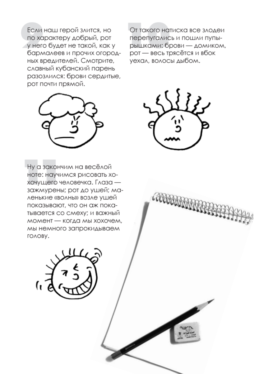 Малыши любят, когда им рисуют. А что делать, если вы не умеете?Ребята постарше любят рисовать сами, но у них не всегда получается. А если научить некому?Из этой книги вы узнаете, что нарисовать человечка, смешную мордочку или Деда Мороза можно, пользуясь простой схемой, — буквально за десять — двадцать секунд. И УМЕТЬ РИСОВАТЬ для этого вовсе не обязательно: каждый способен провести чёрточку. Главное — знать, где и как. Попробуйте — и убедитесь сами! Возьмите ручку, листок бумаги и просто повторяйте за нами. Забудьте слова «правильно», «красиво» и тому подобную ерунду. Если вам кажется, что вы нарисовали что-то не так, а малыш доволен и улыбается, — значит, всё в порядке: вы ведь для него рисуете, а не для себя.Всё у вас получится!