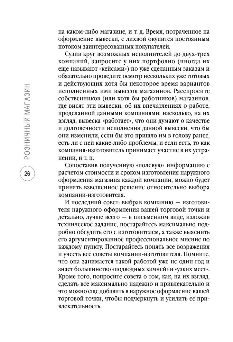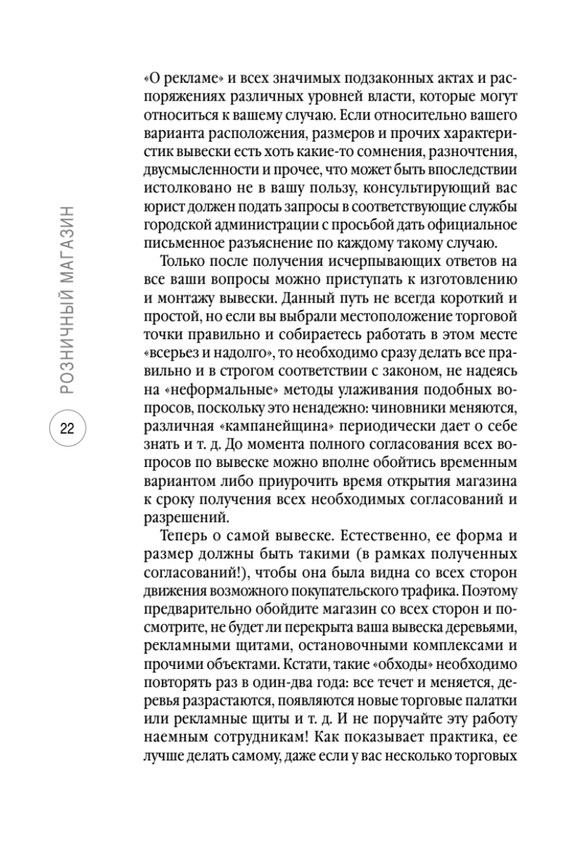 Автор рассматривает самые важные вопросы открытия розничного магазина: расположение торговой точки, ее оформление, показатели эффективности работы магазина, реклама и маркетинг, подбор персонала, управление магазином, подбор и закупка товара, техники успешных продаж.