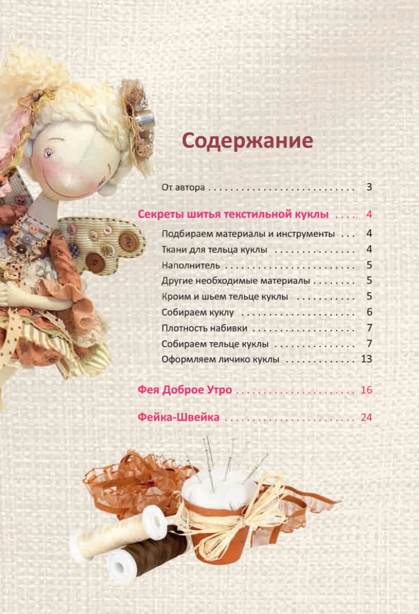 Фея Доброе Утро — такая улыбчивая и доверчивая — предложит вам с утра чашечку кофе, прогонит остатки сна. В своей смешной пижамке и с бигуди в непослушных волосах она сделает добрым даже самое хмурое утро! А Фейка-Швейка — заветная мечта любой рукодельницы, неугомонное создание и мастерица на все руки — расшевелит, вовремя подсунет нужный лоскуток, поможет найти подходящий обрезочек ленточки или кружева, подскажет яркий образ. А когда-то и спрячет ваши любимые ножницы – чтобы не сильно «зафеячились» и не забывали о родных и близких.