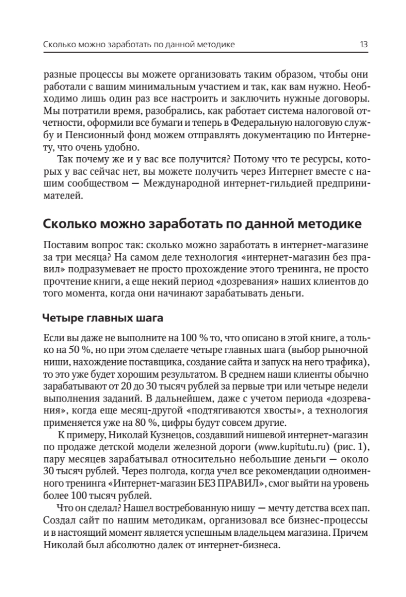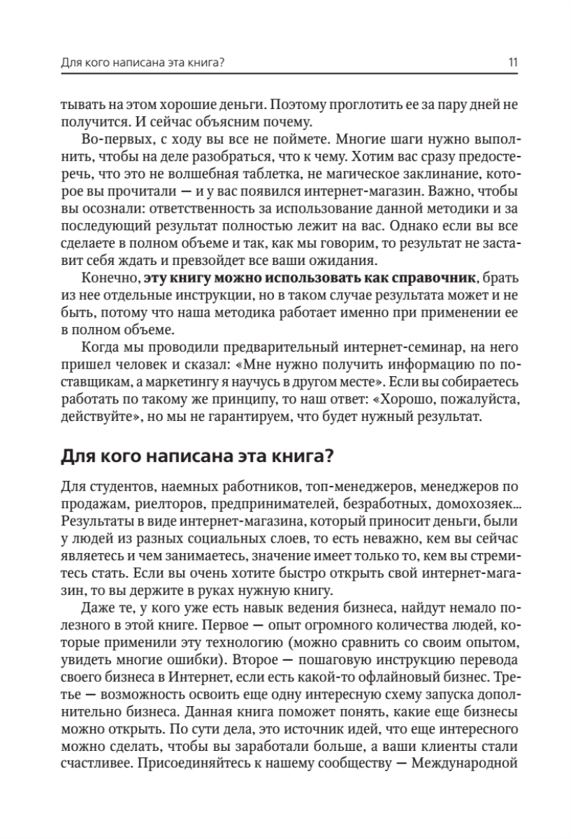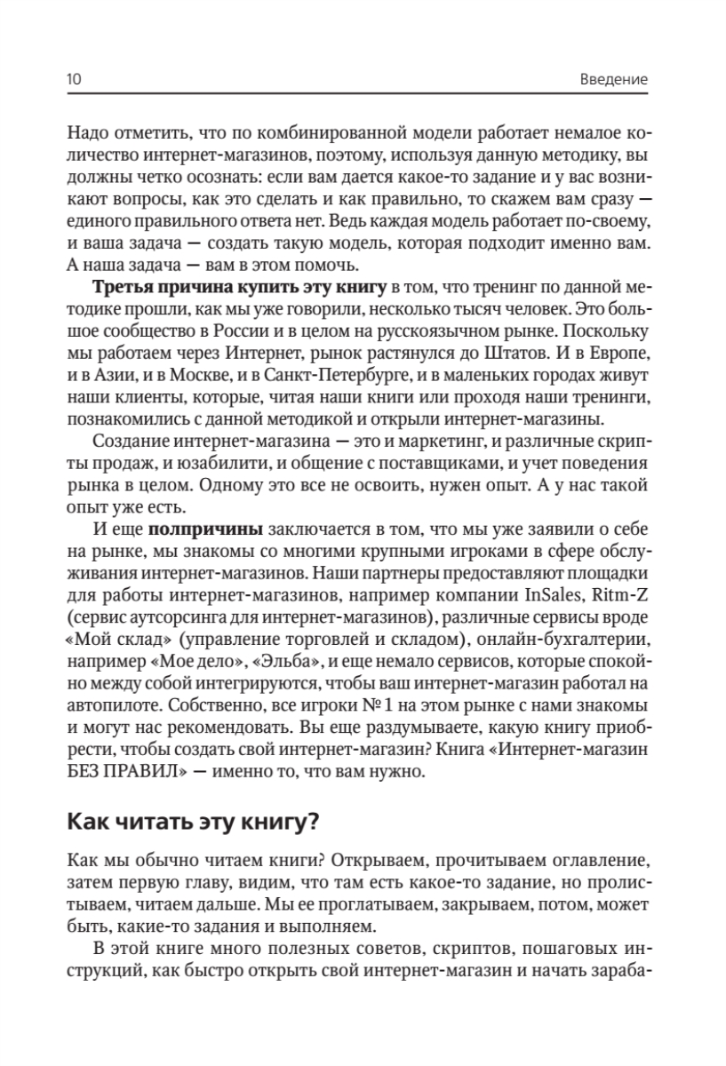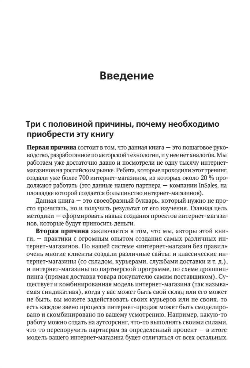 В этой книге авторы специально для вас, уважаемые читатели, изложили собственный опыт и опыт нескольких сотен своих учеников, с которыми они уже создали больше 500 интернет-магазинов в России. Описание технологии разбито на простые и понятные этапы, которые проходит абсолютно любой успешный магазин. Вы познакомитесь с основными принципами, позволяющими построить свой бизнес наиболее быстро и с вложениями, которые может позволить себе даже студент. Количество открывающихся интернет-магазинов постоянно растет, в то время как на рынке отсутствует комплексное, разработанное практиками бизнеса и профессионалами пособие, доступное широкой аудитории. Данная книга — это своеобразный бумажный вирус, который овладевает умами. Процесс запуска успешного интернет-магазина изложен настолько подробно, что после прочтения книги невозможно просто жить с этим знанием. С ним придется что-то делать.