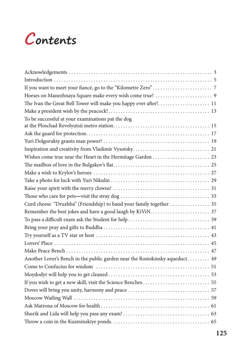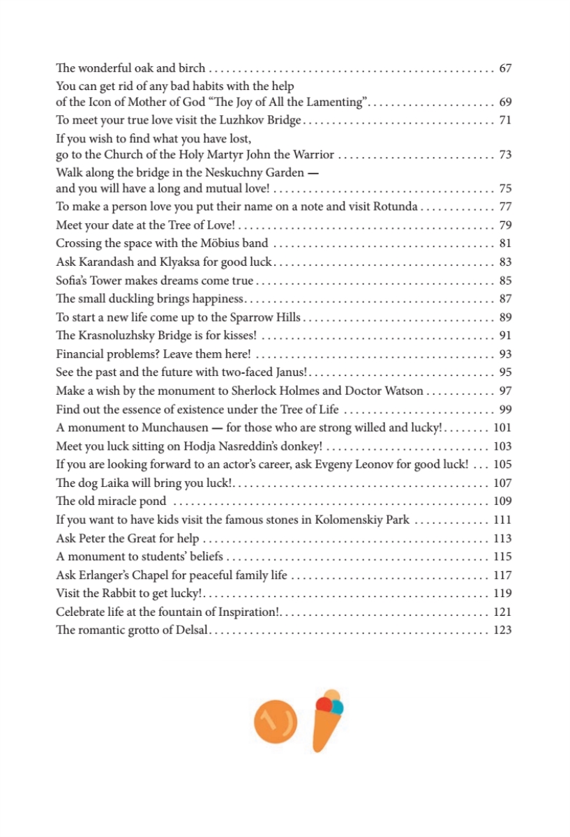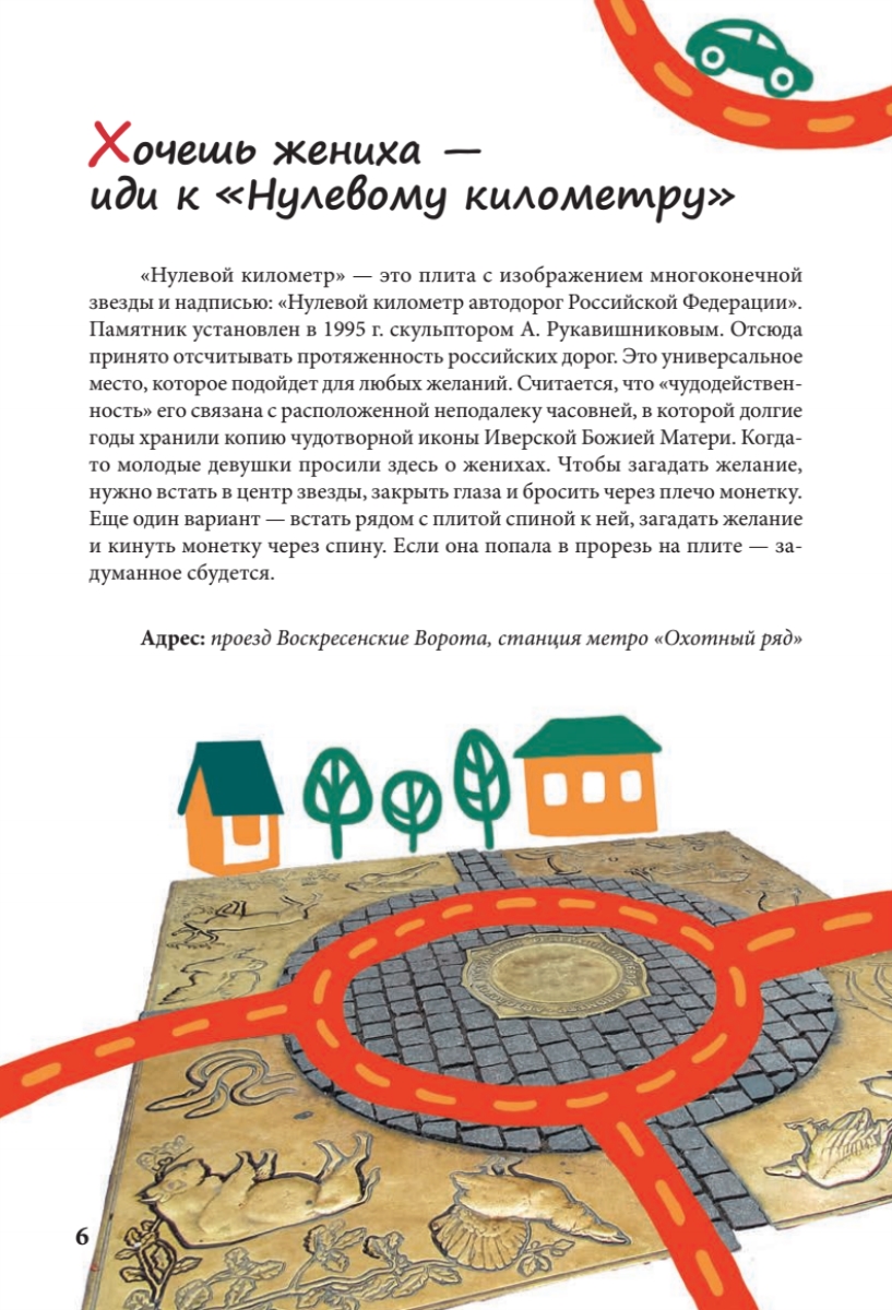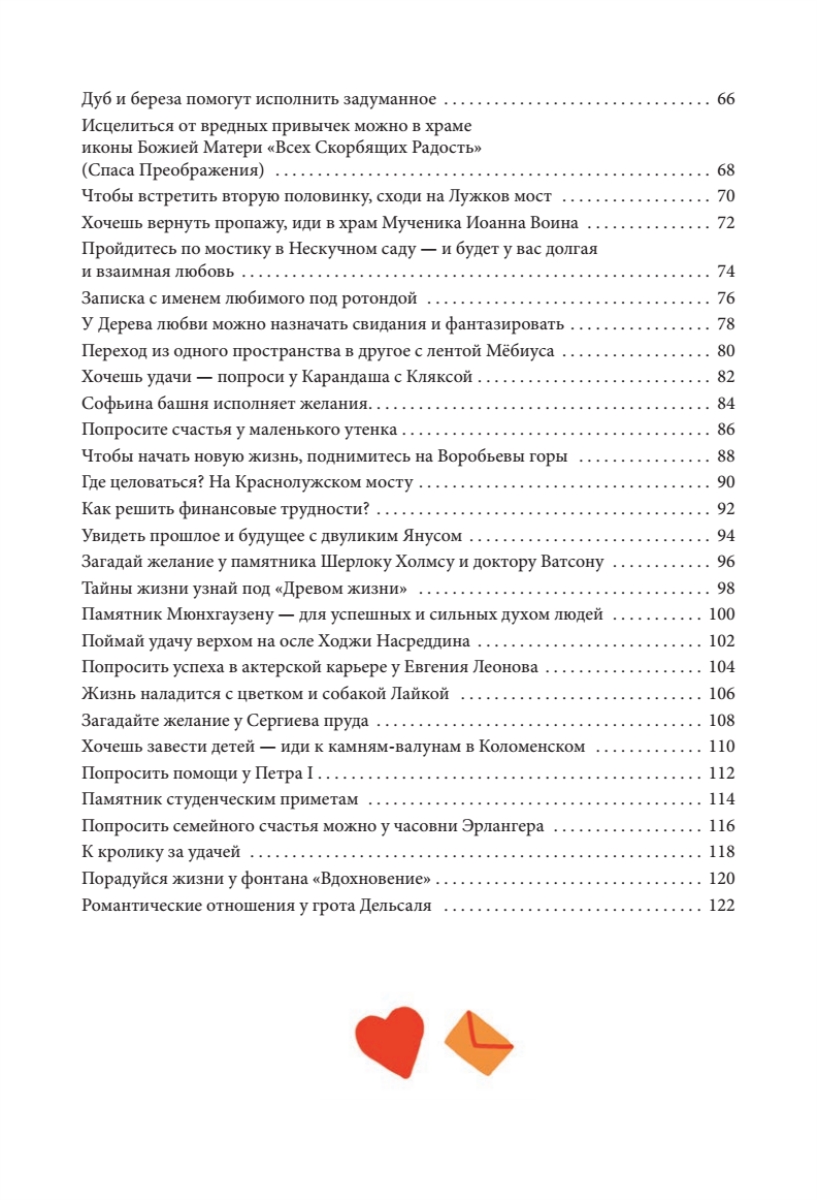 Перед вами необычный путеводитель: он расскажет вам о волшебных и таинственных уголках Москвы, где сбываются самые сокровенные желания. Вы узнаете, какие памятники славятся способностью исполнять мечты, а также о том, что нужно сделать, чтобы желание сбылось непременно. Иногда, чтобы мечта осуществилась, необходимо совершить определенный ритуал. Если вы хотите побывать в этих местах и испытать магию столицы на себе — приглашаю в путешествие!This unusual city guidebook will tell you about the most mysterious and magical places of Moscow. These places and monuments are known for their capacity to make the strongest dreams come true. Sometimes you will have to carry out a specific ritual to make sure your wish comes to life. Welcome to out secret mystery tour! The city magic will work for you to make all your wishes come true, and you will have lots of fun in any case!
