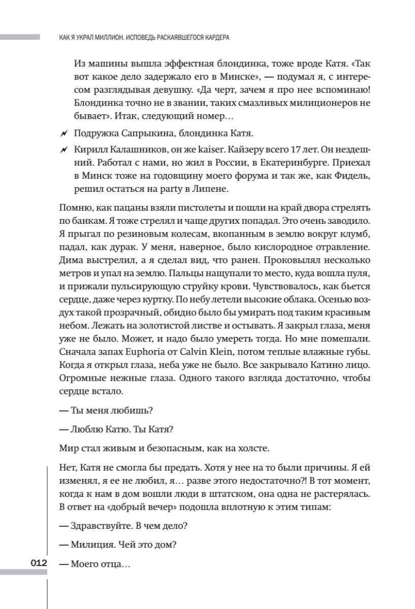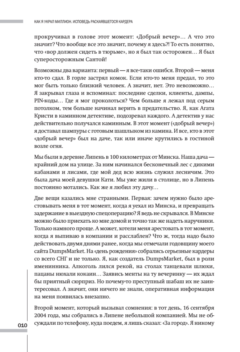 Во время процесса Сергей Павлович признал свою вину лишь в подготовке к изготовлению поддельных карточек (конкретно – в продаже дампов, то есть информации, записанной на магнитную полосу кредитки), за что отбывал наказание ранее. Однако судьи заявили, что в США, спецслужбы которых объявили Policedog’а в розыск, ему бы грозило несколько пожизненных сроков. И белорусский приговор был оставлен без изменений. Сейчас осуждённый находится в колонии. Там он и решил написать книгу «Как я украл миллион» – и раскаяться в своих мошенничествах. Такова преамбула.