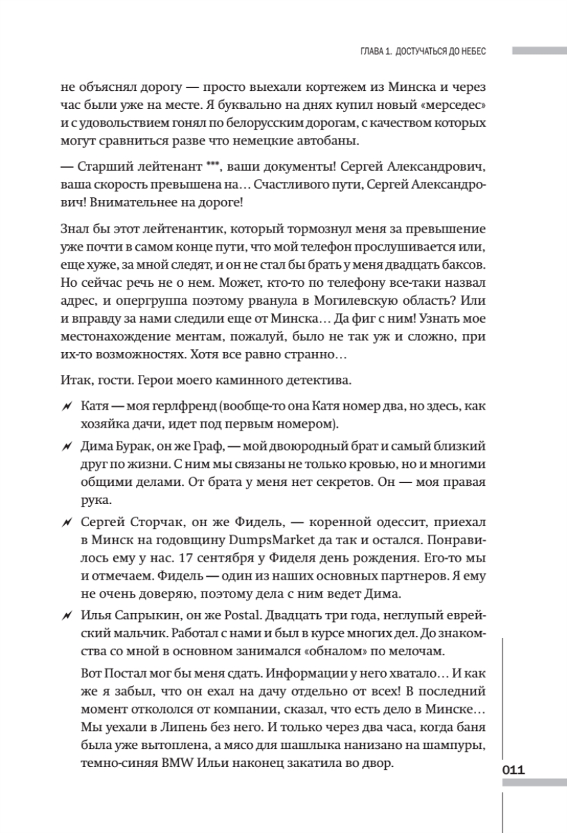 Эта книга, как утверждает надпись на обложке, является «историей громкого преступления». Она написана от лица белорусского кардера (вора, специализирующегося на хищении денег с платёжных карт) Сергея Павловича. В 2009 году он был приговорён в Минске к 10 годам колонии строгого режима. Молодому человеку пришлось отвечать по целому ряду обвинений. Это и «повторное хищение имущества с использованием компьютерной техники», и «приготовление к хищению имущества», и «сбыт поддельных банковских пластиковых карточек», и «приготовление к сбыту поддельных пластиковых карточек». А довеском к этому «букету» стало «хранение и распространение порнографии». В СМИ писали, что Policedog (наиболее известный ник Павловича) – член группировки, которая действовала в Беларуси, Украине, России, США, Испании, Израиле, Румынии и ещё ряде стран. И украли ребятки далеко не миллион, и даже не 10…