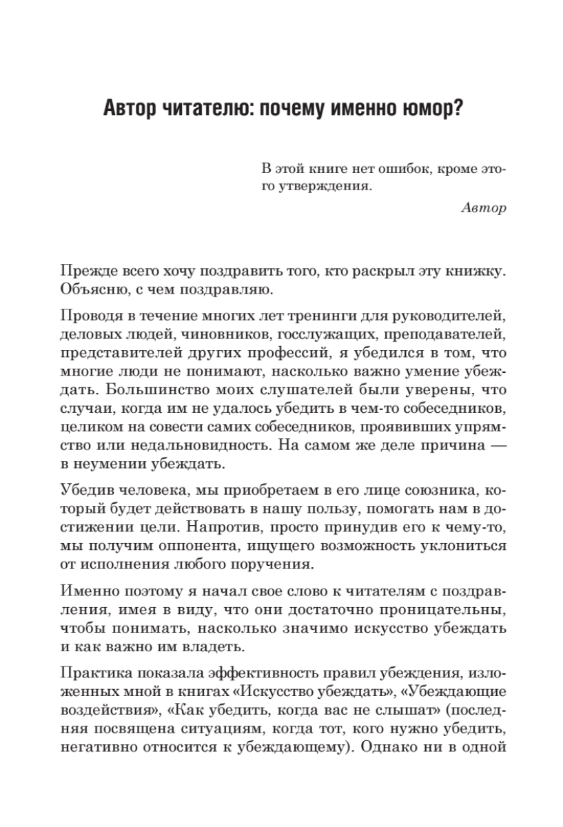 Лучшее средство убеждения — это юмор. C помощью удачной шутки или забавной истории удается склонить на свою сторону самого грозного оппонента и с честью выйти из любой трудной ситуации. Люди обычно благодарны тем, кто поднял им настроение, более доброжелательно к ним относятся, готовы пойти навстречу во многом. А кроме того, при смехе активизируются отделы мозга, отвечающие за творческие решения, человек шире смотрит на ситуацию и быстрее находит удачное решение проблемы.Эта замечательная книга научит вас применять юмор как средство влияния и защиты. В ней есть все — психологические приемы, хитроумные подсказки, а также шутки и смешные истории, вооружившись которыми, вы сможете с успехом не только убеждать людей, но и защищаться от самых умелых манипуляций.