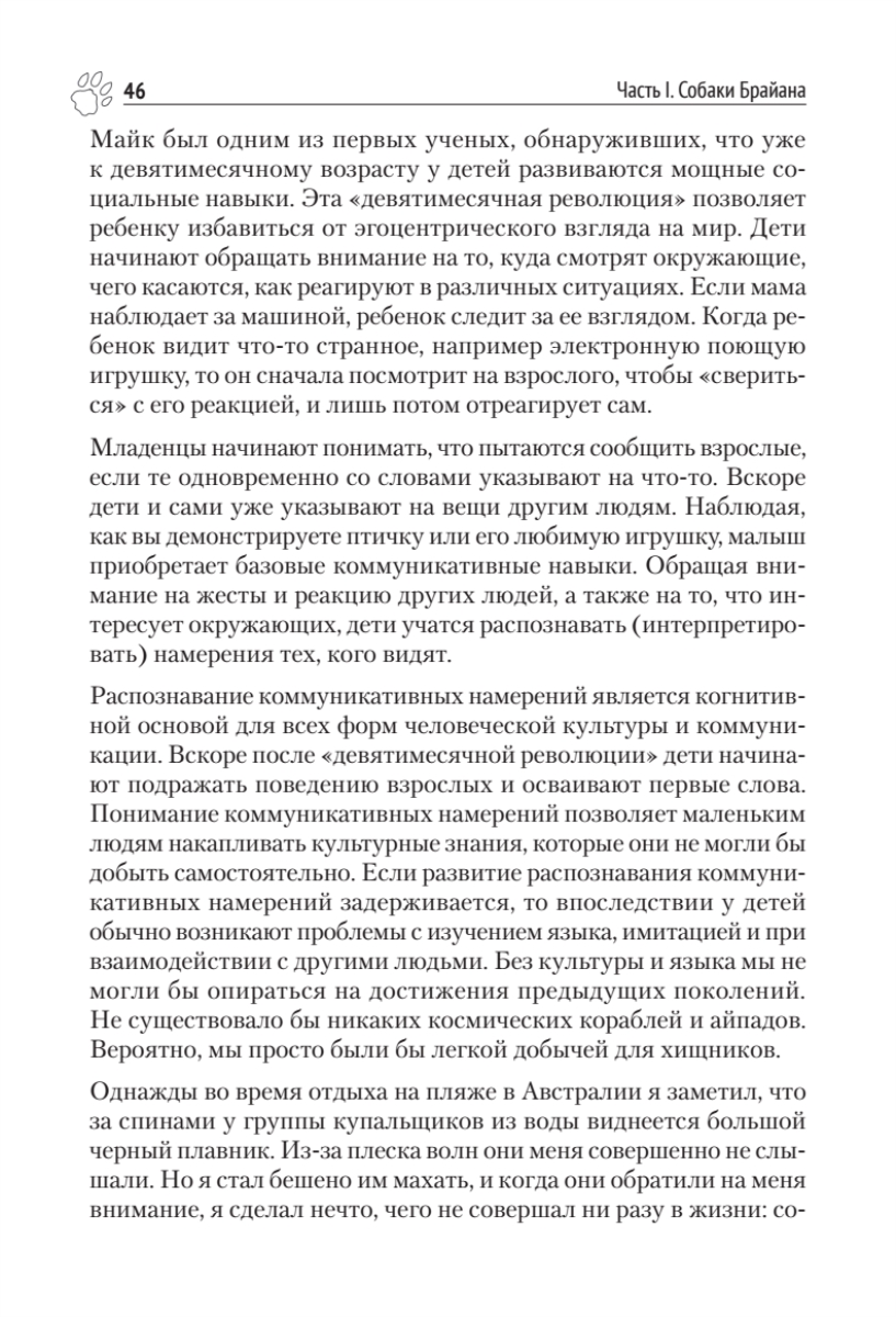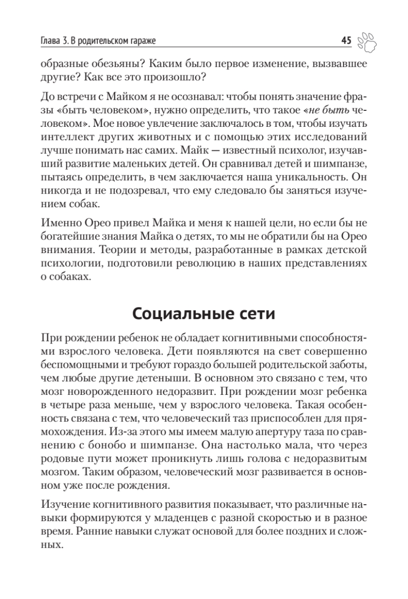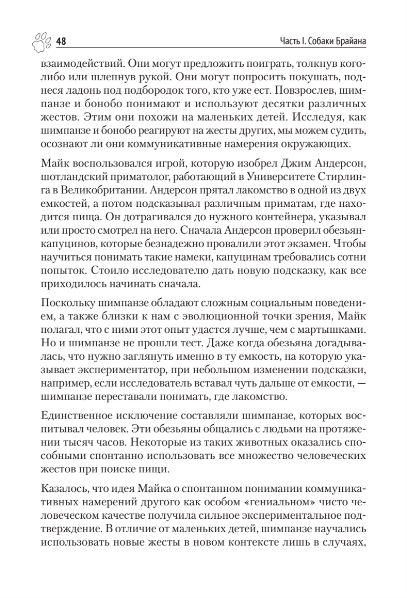 Брайан Хэйр, исследователь собак, эволюционный антрополог, основатель Duke Canine Cognition Center, и Ванесса Вудс предлагают совершенно новое понимание интеллекта собаки и внутреннего мира наших самых умных домашних животных.За последние 10 лет мы узнали о собачьем интеллекте больше, чем за прошлое столетие. Прорывы в когнитивистике, введенной впервые Брайаном Хэйром, доказали, что у собак есть своего рода способность для общения с людьми — совершенно уникальная в животном мире. Ошеломляющее открытие Брайана Хэйра — как собаки себя одомашнили более 40 000 лет назад. Они стали намного больше похожи на человеческих младенцев, чем на своих предков — волков. Приручение дало собакам совершенно новый вид интеллекта. Это открытие меняет наше представление о собаках и их дрессировке.