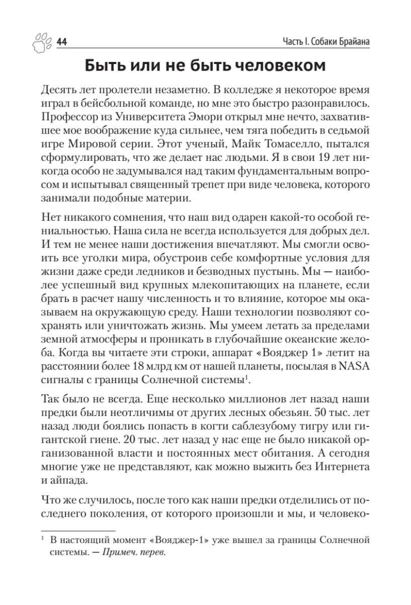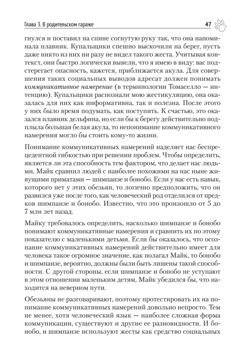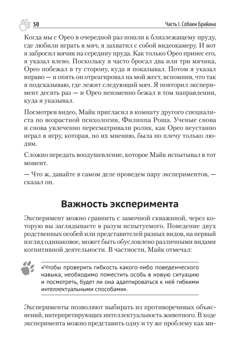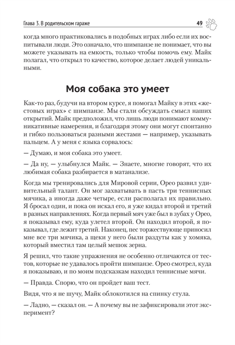 Брайан Хэйр, исследователь собак, эволюционный антрополог, основатель Duke Canine Cognition Center, и Ванесса Вудс предлагают совершенно новое понимание интеллекта собаки и внутреннего мира наших самых умных домашних животных.За последние 10 лет мы узнали о собачьем интеллекте больше, чем за прошлое столетие. Прорывы в когнитивистике, введенной впервые Брайаном Хэйром, доказали, что у собак есть своего рода способность для общения с людьми — совершенно уникальная в животном мире. Ошеломляющее открытие Брайана Хэйра — как собаки себя одомашнили более 40 000 лет назад. Они стали намного больше похожи на человеческих младенцев, чем на своих предков — волков. Приручение дало собакам совершенно новый вид интеллекта. Это открытие меняет наше представление о собаках и их дрессировке.