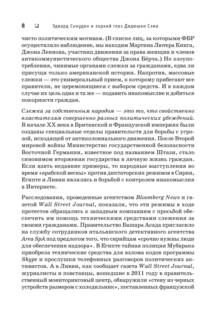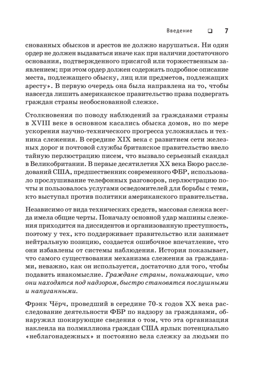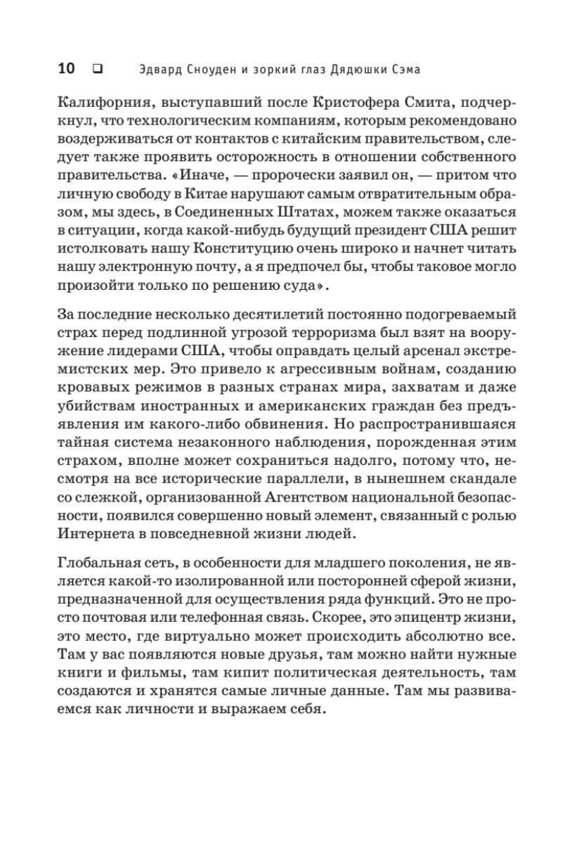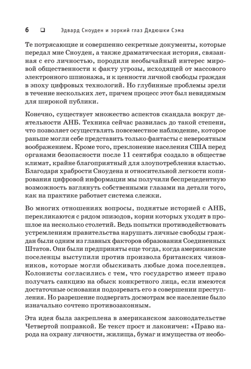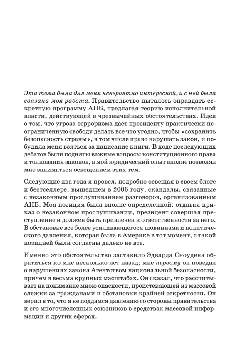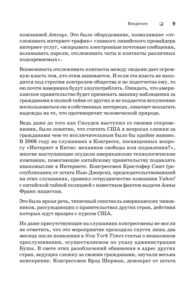 Добро пожаловать в реальный мир! Скрытое наблюдение больше не миф. Бывший сотрудник ЦРУ и АНБ Эдвард Сноуден раскрывает тайны, вызывающие шок и трепет. Оказывается, частной жизни нет. Всюду и везде за нами наблюдает Большой Брат. Беспрецедентную глобальную электронную слежку осуществляет Агентство национальной безопасности, а конфиденциальное общение между людьми перестает быть возможным.Эта книга — не просто поток ценной информации, она читается как настоящий детективный роман и дает исчерпывающие ответы на множество разных вопросов.В чем сенсационность разоблачений Эдварда Сноудена?Какова подлинная мотивация его откровений? Почему Эдвард Сноуден поделился секретными материалами именно с Гленном Гринвальдом?Насколько безопасна Сеть и можно ли скрыться от зоркого глаза Дядюшки Сэма? Как именно осуществляется сбор секретной информации по всему миру?Является ли вторжение в частную жизнь необходимостью?Как отражается слежка на нашем психическом здоровье?И наконец…Приведет ли цифровая эпоха к формированию глобальной системы контроля, о которой тиранам прошлого приходилось только мечтать?..