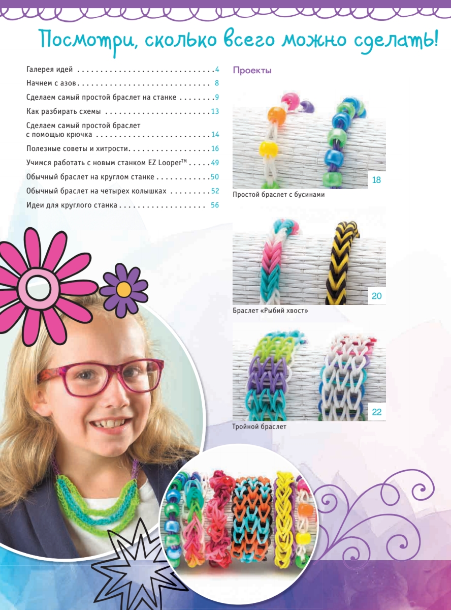 Книга «Радужные браслеты и аксессуары Rainbow Loom! 100 идей для творчества!», а также станок Rainbow Loom® научат тебя создавать потрясающие штучки — стильные браслеты, ожерелья, серьги и другие милые вещицы.