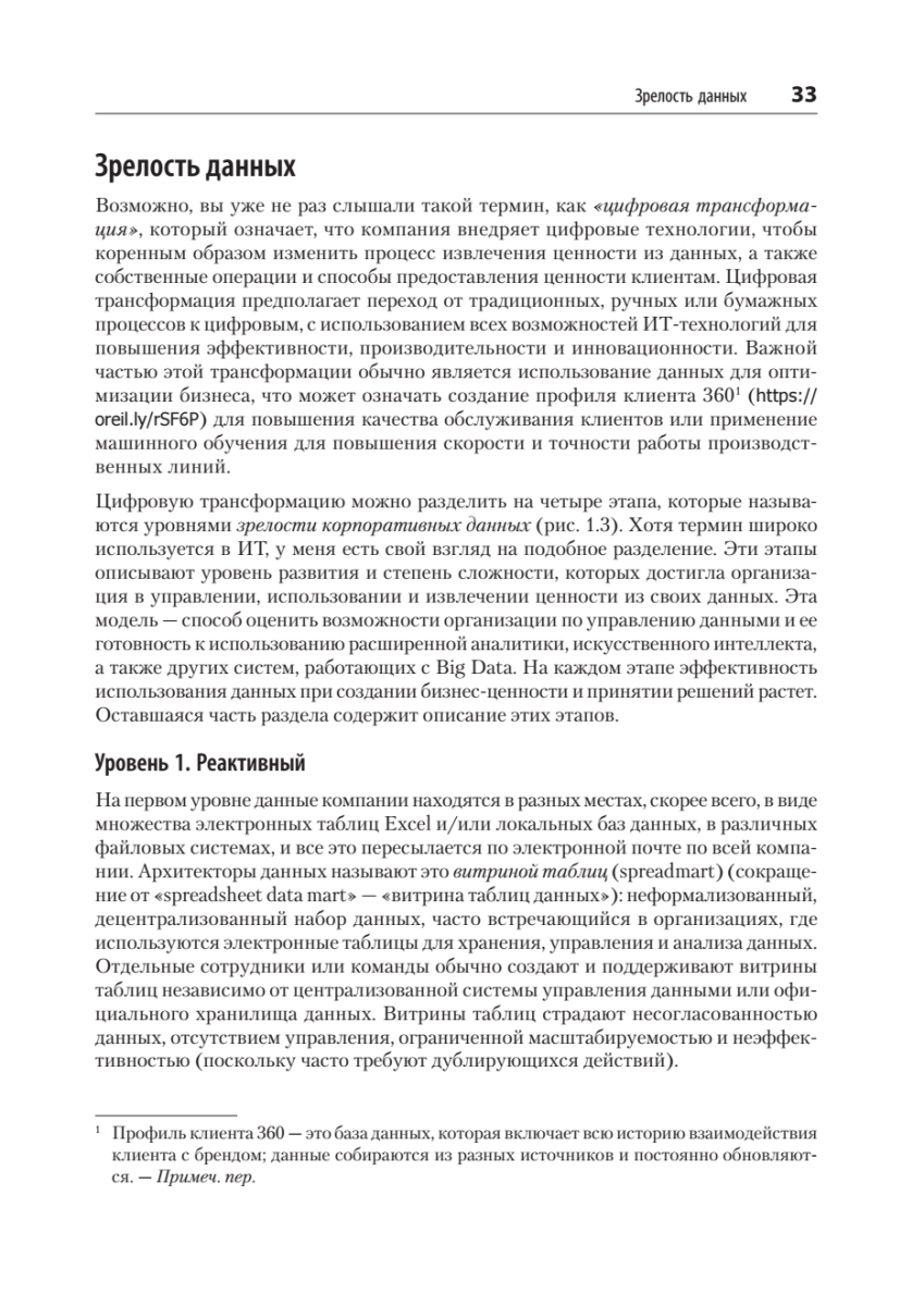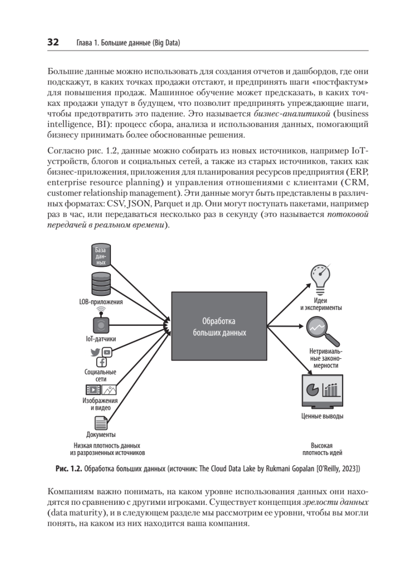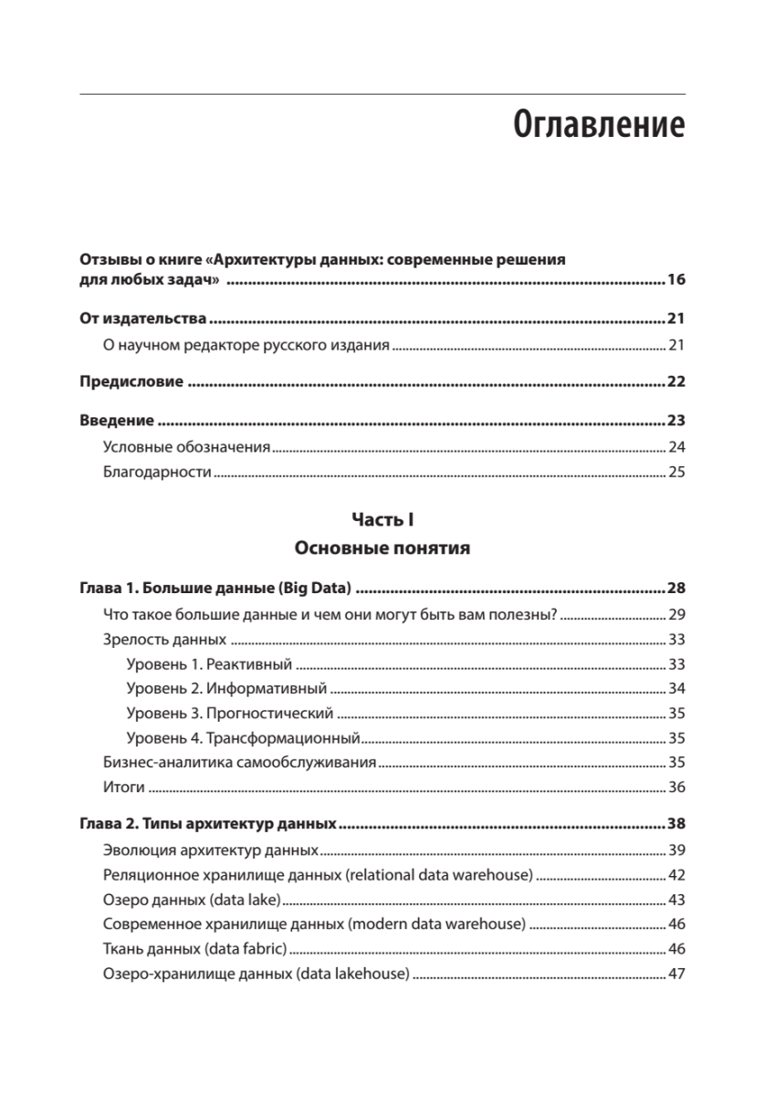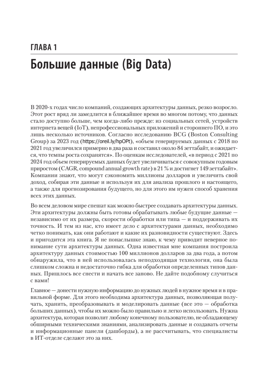 Ткань данных, озеро данных и сетка данных появились относительно недавно и стали рассматриваться как конкурентные альтернативы современному хранилищу данных. У новых архитектур действительно есть весомые преимущества, но, помимо этого, они окружены ореолом предубеждений и мифов. Книга содержит практический обзор архитектур данных, который поможет специалистам в области обработки данных понять преимущества и недостатки каждой из них.Джеймс Серра, архитектор решений Big Data и хранилищ данных, работающий в Microsoft, рассматривает общие концепции архитектур данных, в том числе то, как хранилищам данных пришлось эволюционировать, чтобы работать с функциями озер данных. Вы узнаете, чем хороши озера-хранилища данных, а также как отличить раздуваемый вокруг сеток данных ажиотаж от их реальных возможностей. А самое главное, вы научитесь определять наиболее подходящую архитектуру данных для своих нужд.