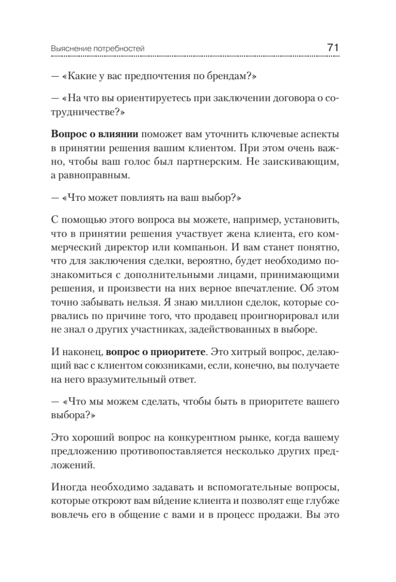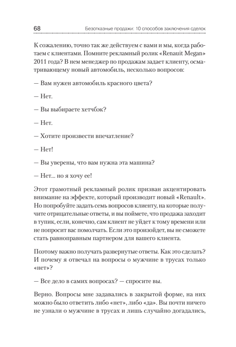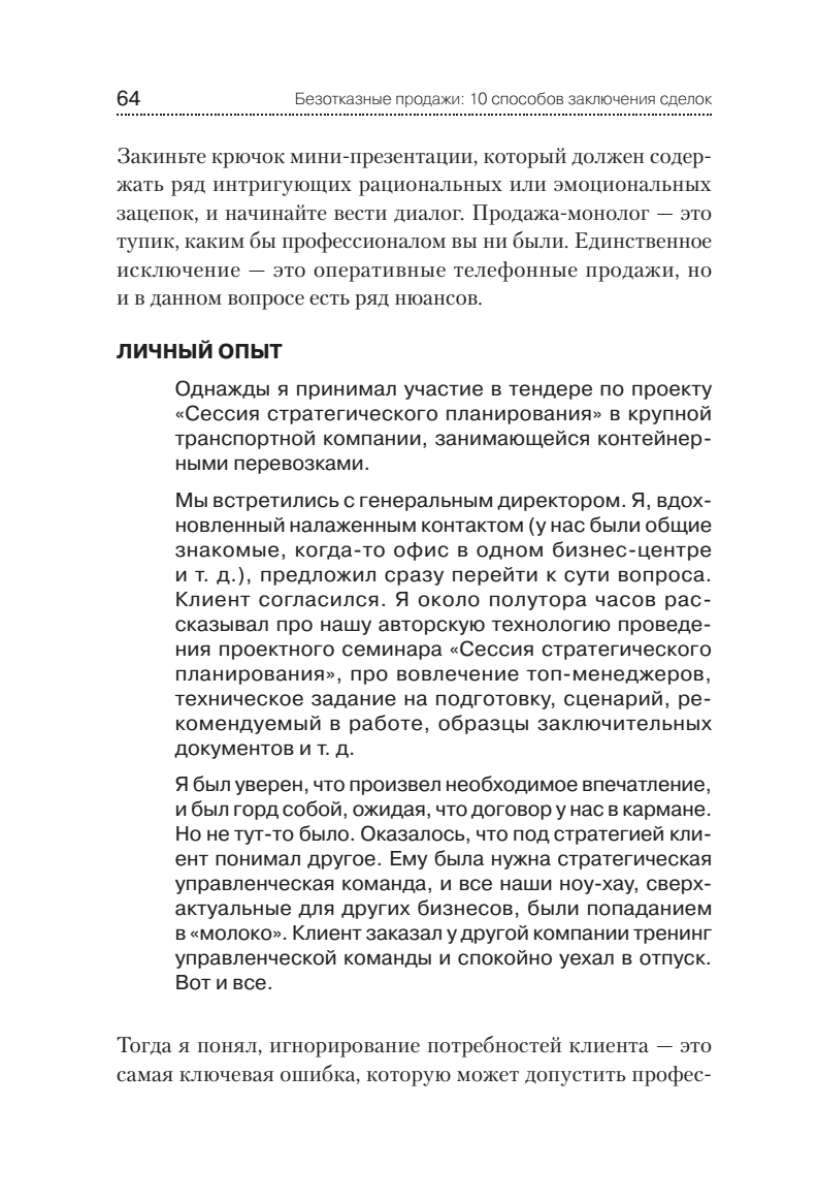 Впервые представлена уникальная авторская методика Fi.S.E.Q., запатентованная в России, от Дениса Нежданова, одного из ведущих бизнес-тренеров. В книге раскрываются секреты достижения результата в продажах всех уровней: от розничных продаж до комплексных В2В-продаж. Пятишаговая технология автора включает в себя подготовку продаж, постановку целей на каждую сделку, установление контакта с клиентами, выяснение их интересов, презентацию товаров и услуг. Отдельно рассмотрены методы работы с возражениями и 10 способов заключения сделок.Основываясь на личном опыте и примерах уже реализованных проектов, автор покажет вам, как вести бизнес, чтобы никогда не проигрывать!