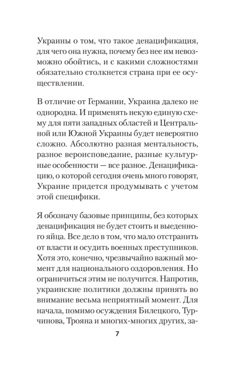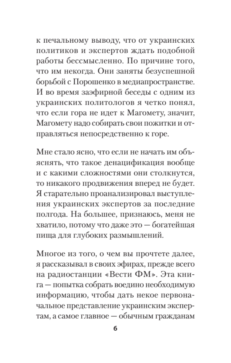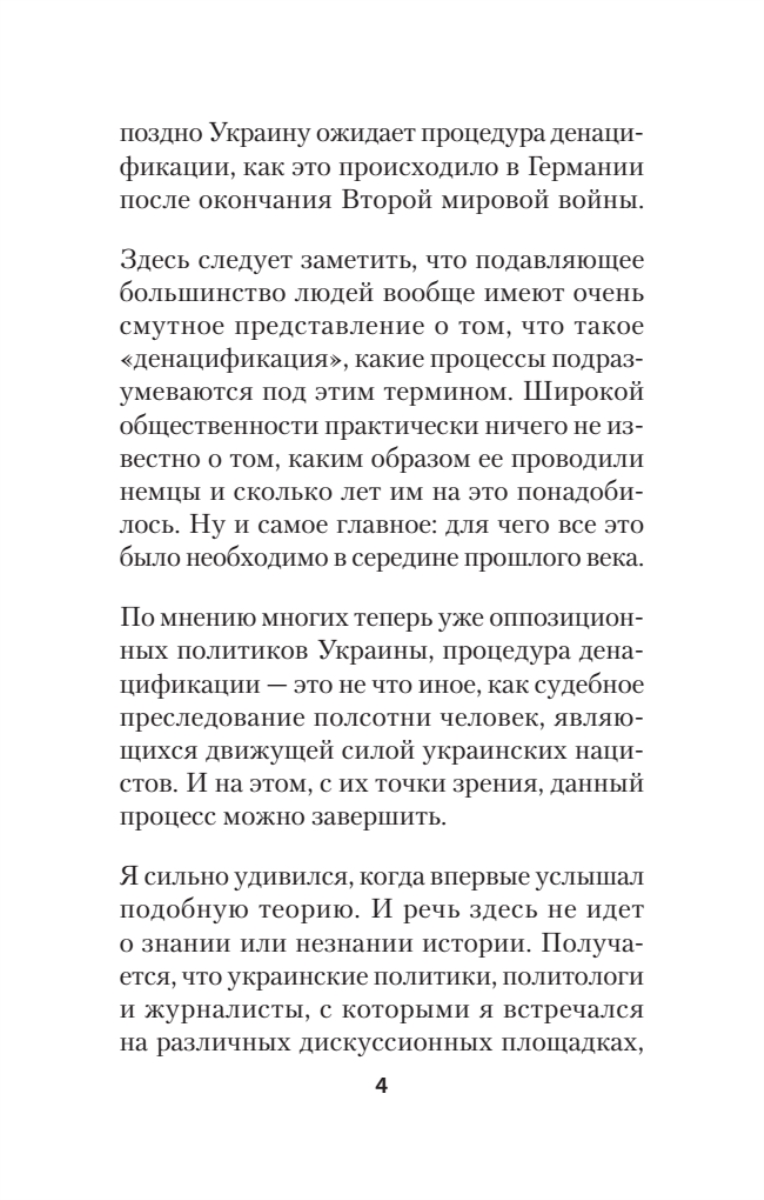 События, произошедшие на Украине в феврале — марте 2014 года, до сих пор зачастую оцениваются совершенно неверно. Это была не революция достоинства, а установление диктатуры украинских националистов. По уровню массовой ненависти и истерии Украина уже обогнала Третий рейх. И не только потому, что нынешняя Украина существует больше 25 лет, а Третьему рейху было отпущено историей всего 12, а потому что у Гитлера не было такого богатого разнообразия ресурсов для оболванивания людей. Ведь не было тогда ни Интернета, ни социальных сетей, ни массового телевещания. В сложившихся обстоятельствах без проведения денацификации никакого развития украинского государства быть не может. Оно просто развалится, не выдержав ненависти, которую испытывают одни граждане страны к другим. Если украинские политики хотят сохранить свое собственное государство, им надо заниматься разработкой программы денацификации уже сейчас, чтобы в момент, когда на Украине очередной Майдан сметет Порошенко, Турчиновых и всех прочих, уже иметь четкий план действий. Еще не поздно начать изучать тему, которая непременно в какой-то момент станет главенствующей во внутриполитической жизни Украины. О том, что должна представлять собой программа денацификации, а также об историческом опыте проведения этого процесса в Германии в послевоенные годы, рассказывает известный российский писатель, журналист и историк Армен Гаспарян.