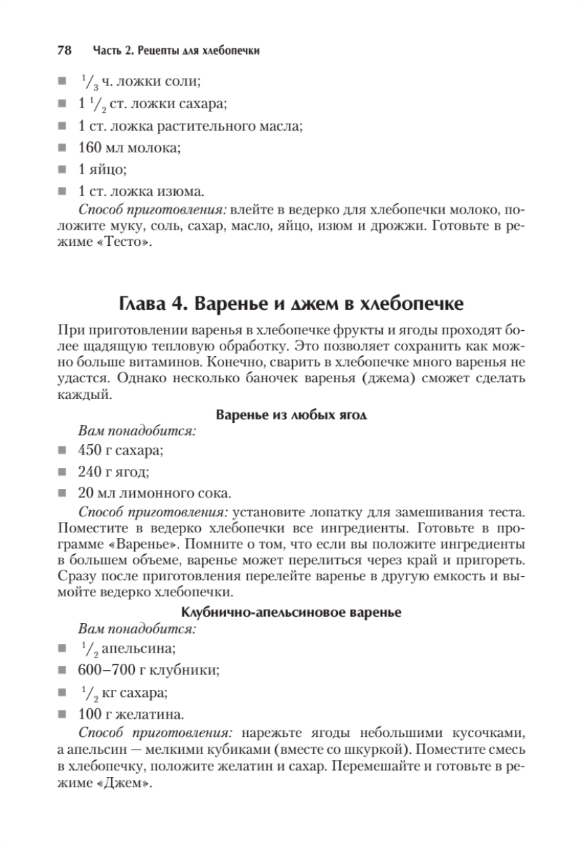 Купили хлебопечку? Поздравляем, это ценнейшее приобретение для любого дома! Теперь вы сможете каждый день радовать своих домашних горячим хлебом и ароматной выпечкой! А книга подскажет простые, но оригинальные рецепты! Вы узнаете, как приготовить полезный цельнозерновой хлеб, а также безглютеновый, показанный даже диабетикам, научитесь печь французский хлеб с хрустящей корочкой и итальянский с травами и оливками. Множество рецептов посвящено хлебу с добавками: сухофруктами, орехами, отрубями, семечками, овощами, сырами. А сладкая сдоба с медом, фруктами, цукатами, шоколадом, ягодами не оставит равнодушными ваших детей. Одна из глав рассказывает о приготовлении теста для пиццы, пельменей, вареников, оладий, печенья и булочек.В книге рассказано, как грамотно подобрать ингредиенты, добиться хорошего подъема теста и того, чтобы хлеб отлично пропекся, как не испортить его цвет и вкус несвоевременной добавкой фруктов или ягод, сделать корочку золотистой, как сохранить хлеб свежим надолго.