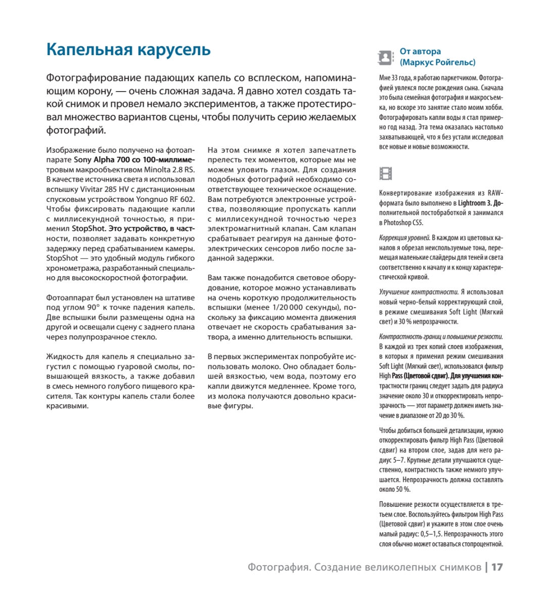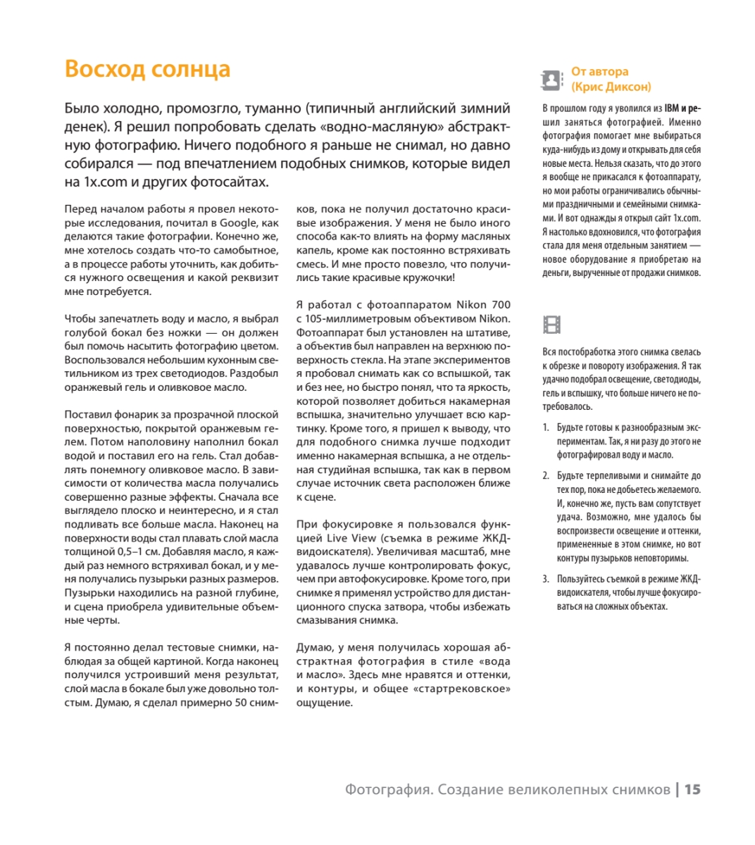 Фотограф – одна из наиболее увлекательных профессий на свете. Она даёт возможность выразить мысли, чувства и отношение к окружающему миру через фотографию, разговаривать и быть услышанным, минуя языковые барьеры. Редкий любитель не размышляет о том, чтобы жить за счёт своего хобби, но он сталкивается с первой серьёзной проблемой: знакомых профессиональных фотографов, тем более успешных, не так много, а знающие «волшебное слово» вовсе не торопятся открыть перед неофитом все свои карты. Автор книги — известный петербургский фотограф — делится секретами построения фотографического бизнеса и организации процесса работы фотографа-фрилансера.