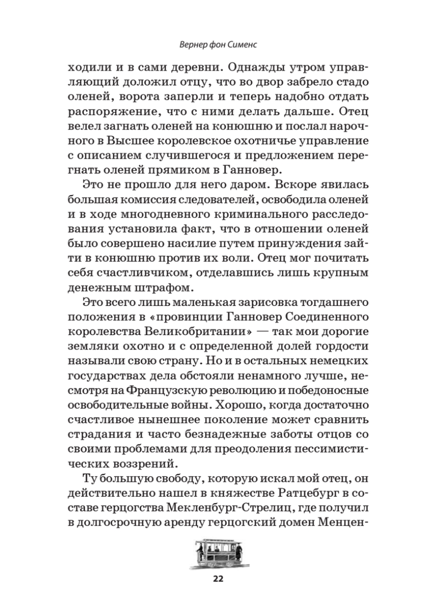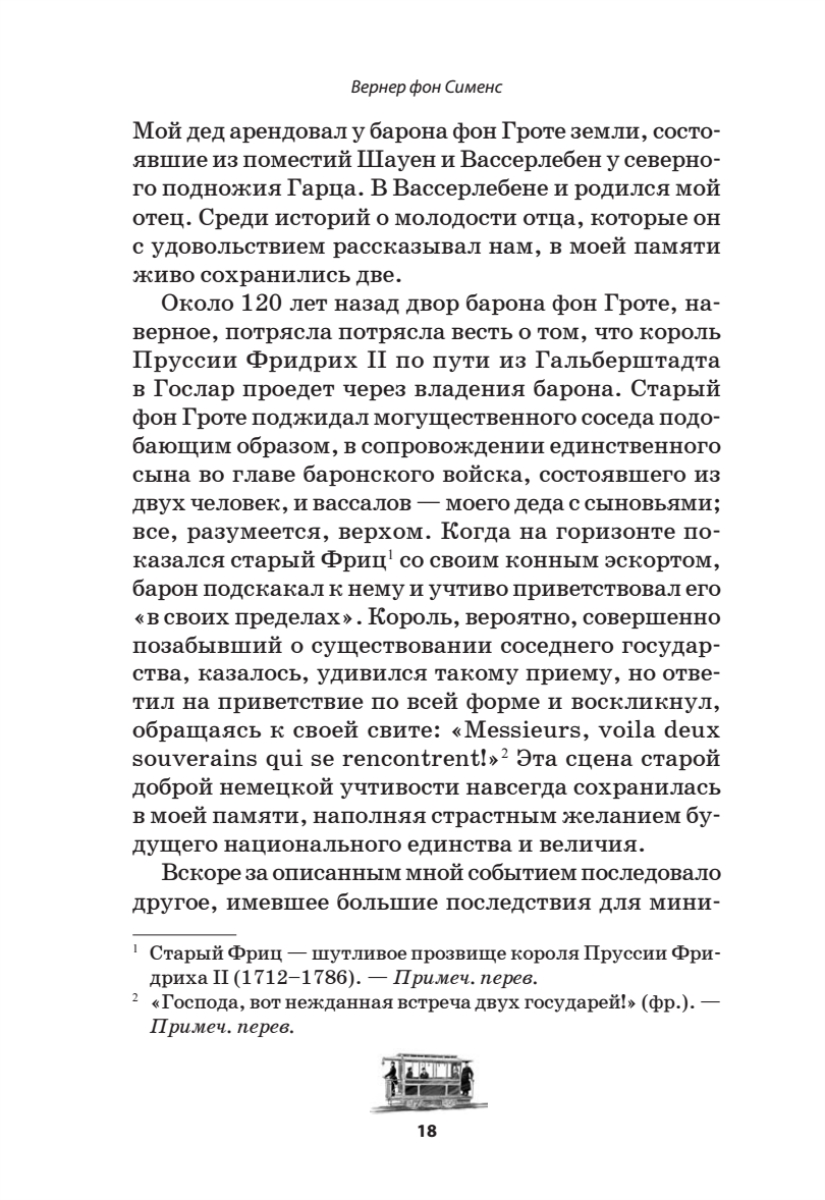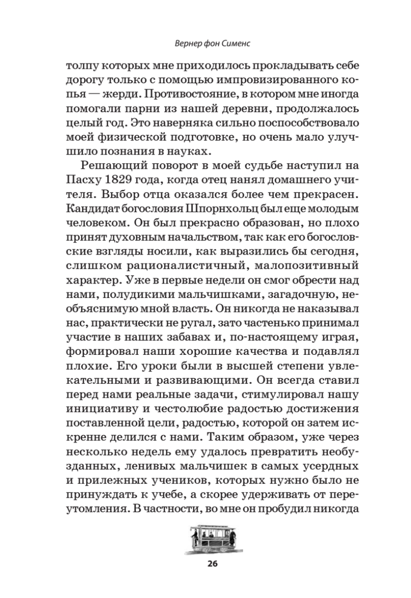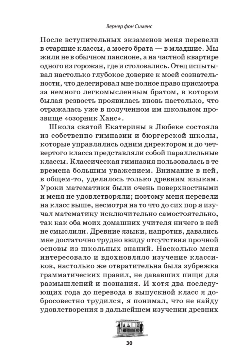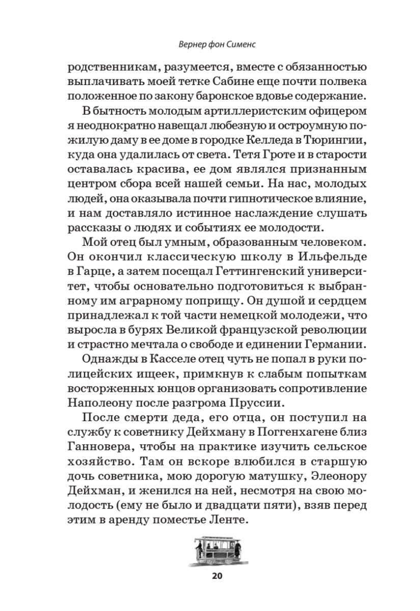 Воспоминания Вернера фон Сименса (1816 - 1892) - драгоценная находка для исследователей научно-технической истории мира, инженеров, конструкторов, изобретателей, студентов и преподавателей технических учебных заведений, рационализаторов, предпринимателей, руководителей всех рангов. Книга подарит немало приятных часов и тем, кто увлекается изучением биографий крупномасштабных личностей. Читая эти мемуары, можно услышать голос представителя великой эпохи, соединившей фантастику и реальность. Особый интерес к личности Вернера фон Сименса, изобретателя электролокомотива, трамвая, троллейбуса, электролифта, прокладчика трансконтинентальных телеграфных линий, вызывает тот факт, что именно он протянул между крупнейшими городами России провода первого электрического телеграфа. Взгляд на николаевскую Россию иностранного очевидца - необычайно любопытный и ценный материал - в полной мере запечатлен в этом издании. Сознание современного человека прочно связало фамилию Сименс с названием известной германской компании. Однако прежде чем мир увидел и запомнил логотип SIMENS, состоялась бурная, насыщенная взлетами и падениями жизнь, которая и отразилась на страницах этой книги.