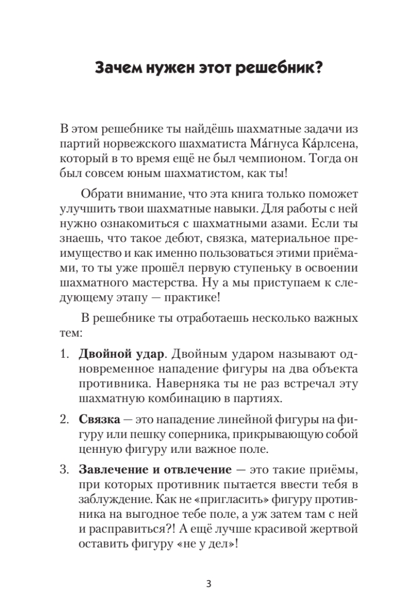 Ты держишь в руках шахматный задачник, составленный по играм Магнуса Карлсена, - чемпиона мира по шахматам! Здесь собраны самые интересные шахматные позиции из партий будущего гроссмейстера. Твоя задача - сходить так же, как это делает непревзойдённый Магнус! Дерзай, великие победы ждут тебя!