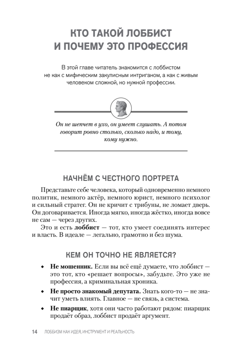 Что отличает успешный лоббизм от коррупции? Как превратить запросы бизнеса в реальные решения власти? В книге «Лоббизм. Искусство влияния» представлен глубокий анализ механизмов влияния на принятие государственных решений. Автор раскрывает ключевые компетенции профессионального лоббиста, описывает стратегии работы с органами власти и показывает, как различные группы интересов — от компаний до целых регионов — могут эффективно продвигать свои инициативы. Издание содержит практические рекомендации по выстраиванию конструктивного диалога с властью и демонстрирует, как лоббизм может стать инструментом развития общества, а не просто способом получения выгоды.