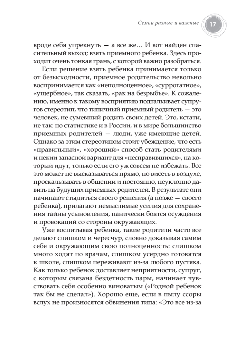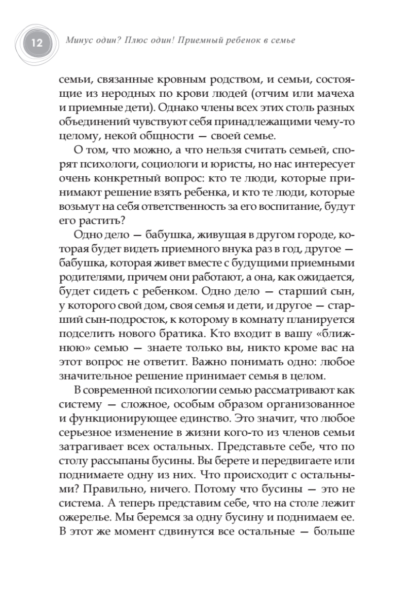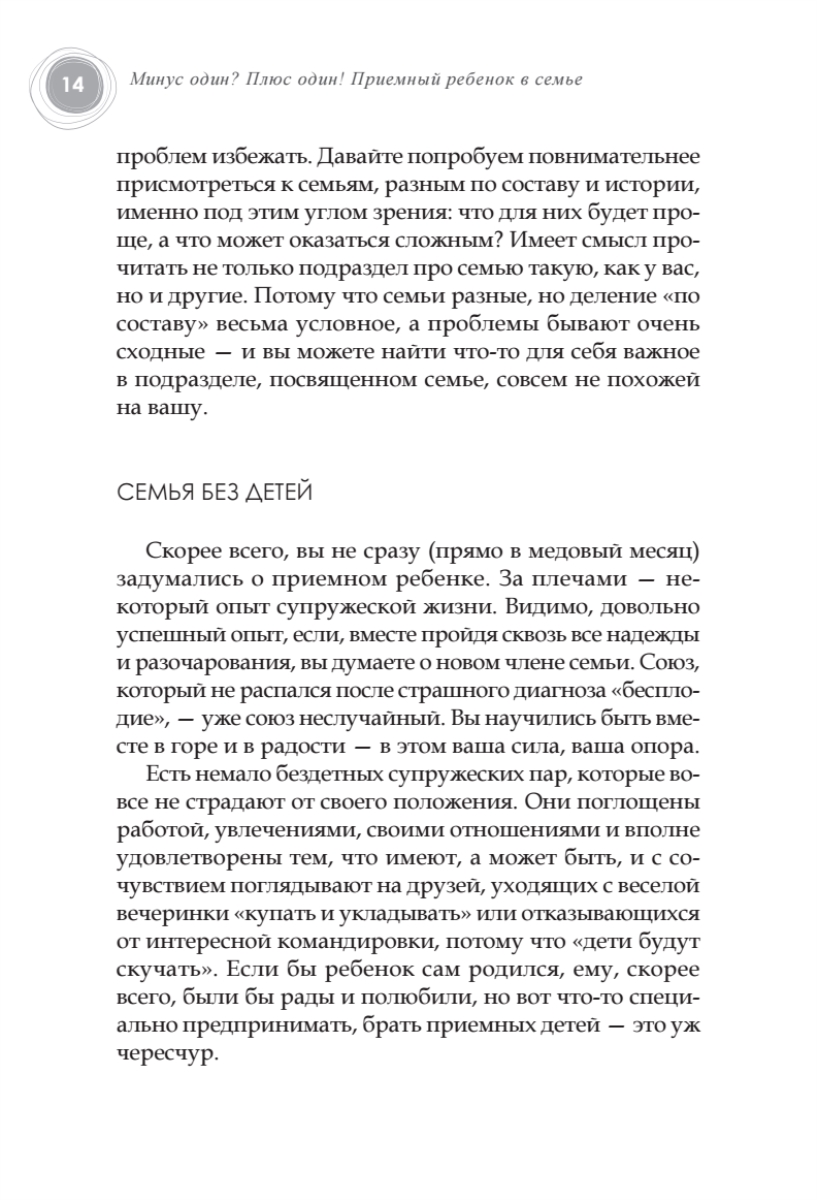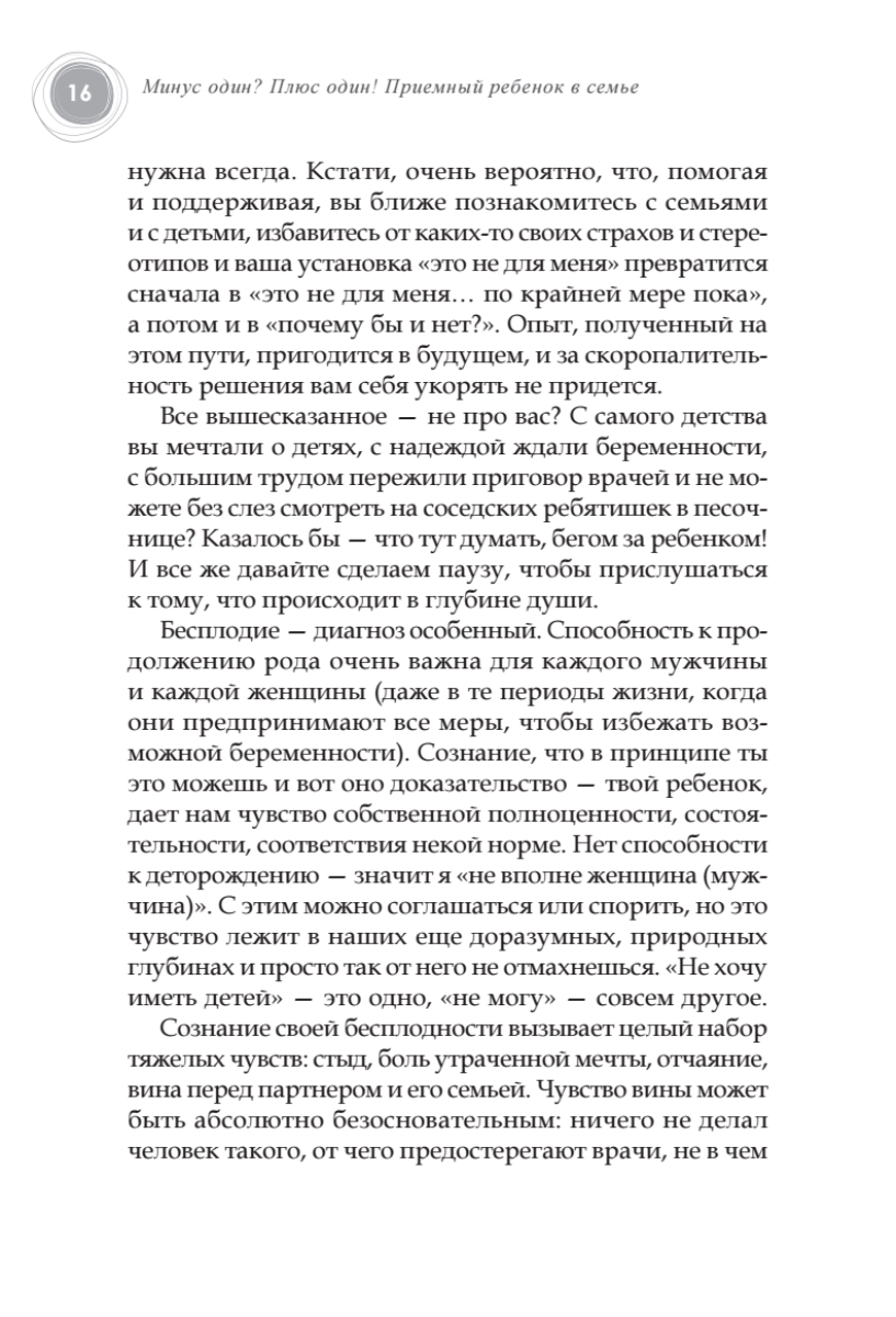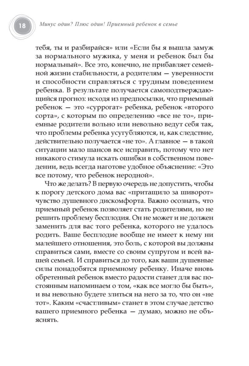 «Минус один!» — это значит на одного сироту меньше. «Плюс один!» — это значит ваша семья стала больше на одного человека. Это слова, за которыми стоит так много: и радость за этого ребенка, и чувство вины перед всеми теми детьми, кто еще не обрел семью, и надежда когда-нибудь все же «вычерпать море». О том, чтобы эта простая арифметика стала счастливой жизнью, и написана книга замечательного психолога Людмилы Петрановской. В своей книге автор рассказывает, как подготовиться к этому непростому решению, пройти весь путь, не теряя надежды, увеличить свою семью на одного замечательного ребенка. Книга даст почувствовать, что вы не одиноки на своем пути.