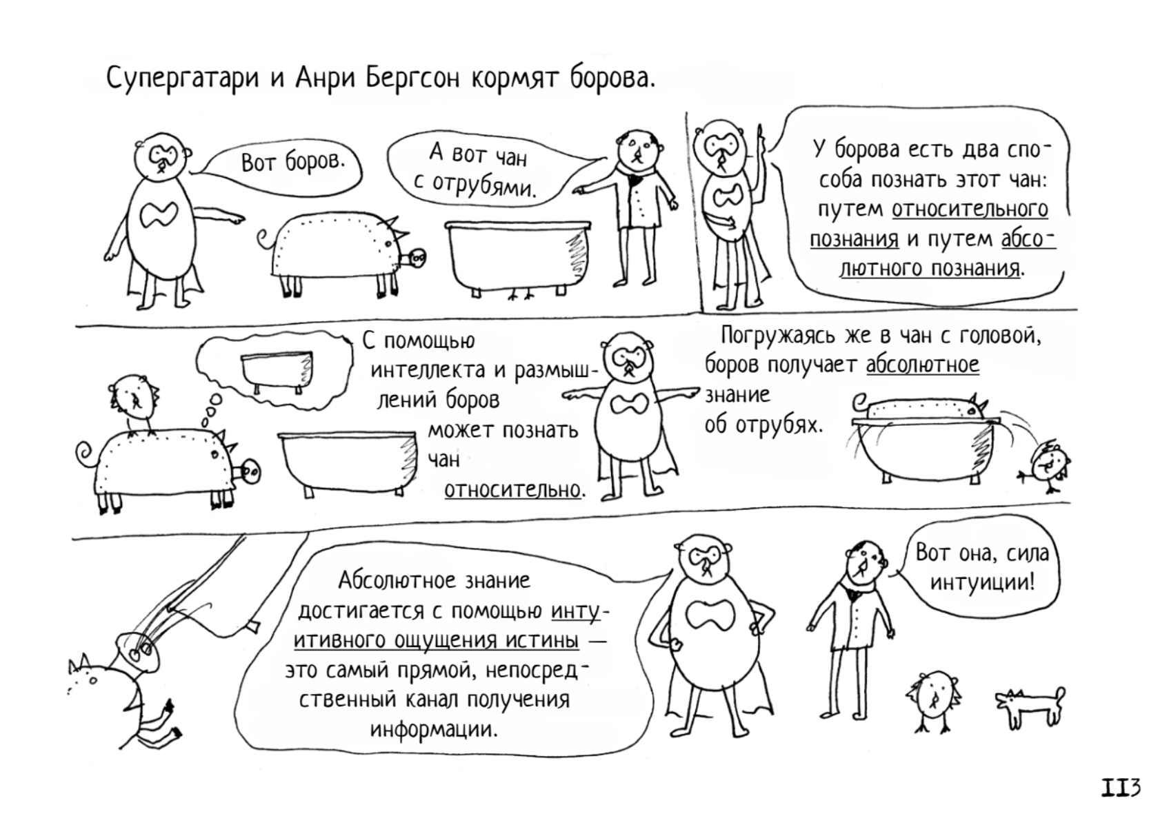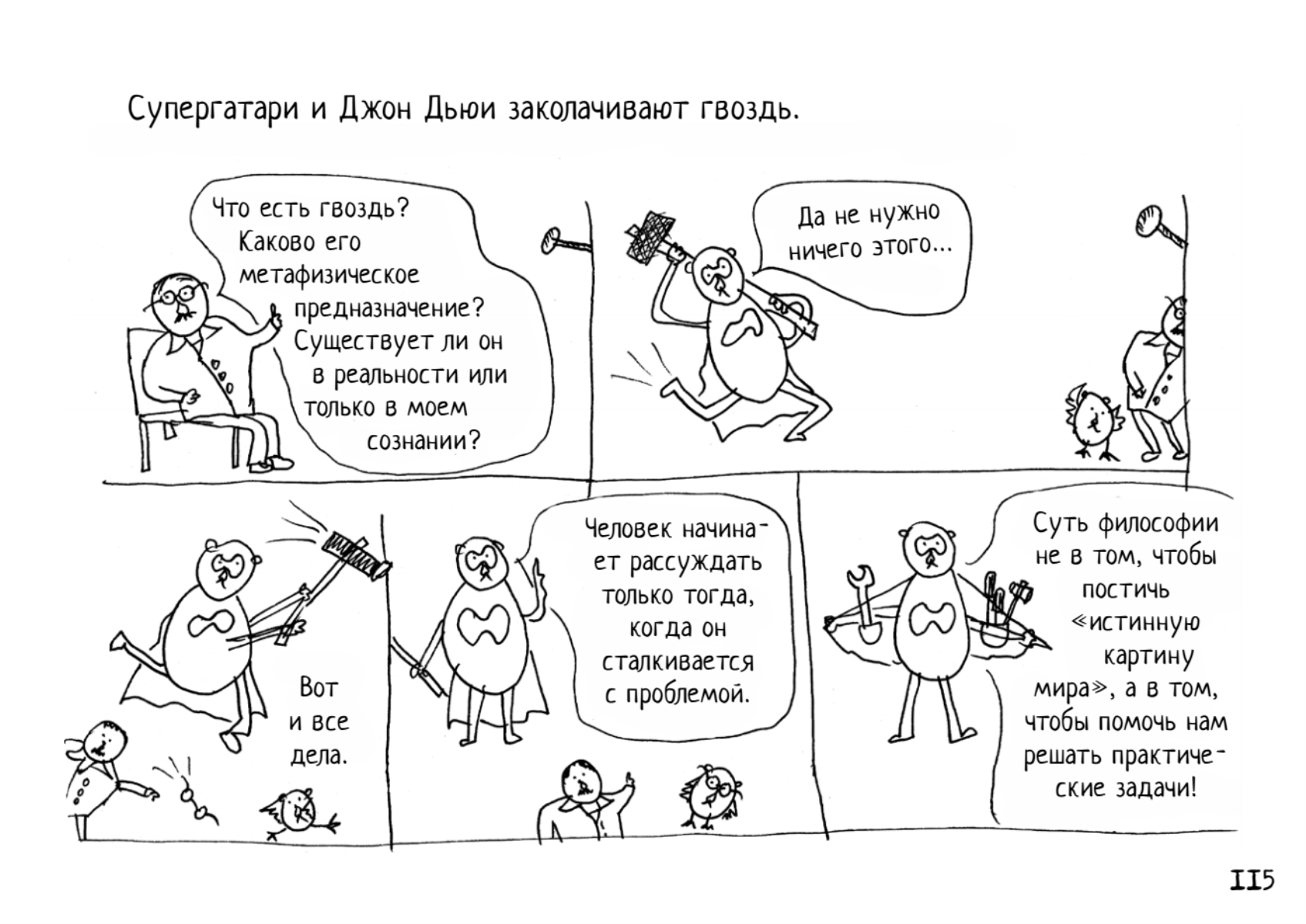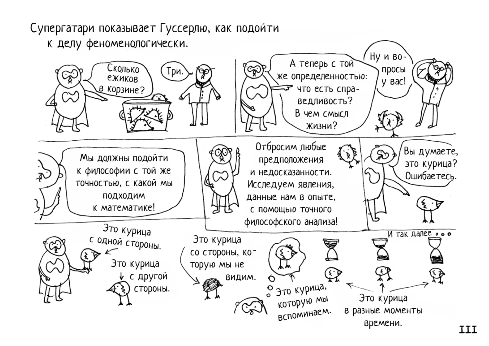 Философия — это просто, быстро и очень смешно. Не верите? Проверьте. Вам понадобится не более дня, чтобы узнать все самое важное о мировых философах и их учениях и заодно от души повеселиться.Отзывы«Есть нечто непреодолимо притягательное в том, чтобы представлять наиболее сложные идеи философии в простой графической форме... Главную роль в комиксе „Неформальная философия в картинках“ играет супергерой Супергатари, который преодолевает пространственно-временной континуум, чтобы встретиться и пообщаться с наиболее влиятельными философами человечества. Прыгая вместе с Кьеркегором с крыши, чтобы продемонстрировать ему головокружение от свободы; занимаясь археологическими раскопками с Фуко, чтобы докопаться до сути человеческой природы; блуждая в лесу с Вильямом Джеймсом, проверяя влияние сознания на реальность, Супергатари не оставляет ни одного философского камня не перевернутым в своем стремлении понять наше предназначение и место в жизни».Мария Попова — создатель одного их самых влиятельных интеллектуальных блогов «Brain Pickings». «Один из пяти комиксов, которые сделают вас умнее!»BBC CultureОб автореМиша Гертельман — художник, который так плохо рисует, как не каждому дано. Сила его таланта заключается в способности разрешить себе быть художником.«Если ты чего-то очень хочешь, значит — можешь это сделать», — говорит художник, и из-под его нетвердой руки выходит первый в мире супергерой с интеллектуальными суперсилами по имени Супергатари. Эта книга имеет прикладное назначение. Из нее вы сможете почерпнуть знания обо всех самых важных философах человечества и их учениях. Автор также надеется, что в таком непростом деле, как постижение смысла жизни, Супергатари поможет вам сохранить и даже преумножить радость бытия.За новыми приключениями Супергатари следите в твиттере @supergatari.