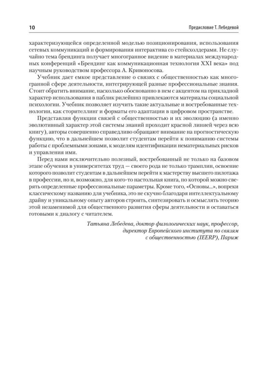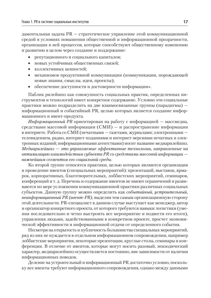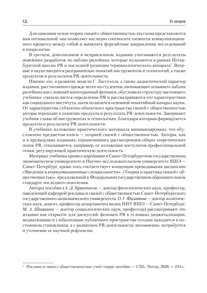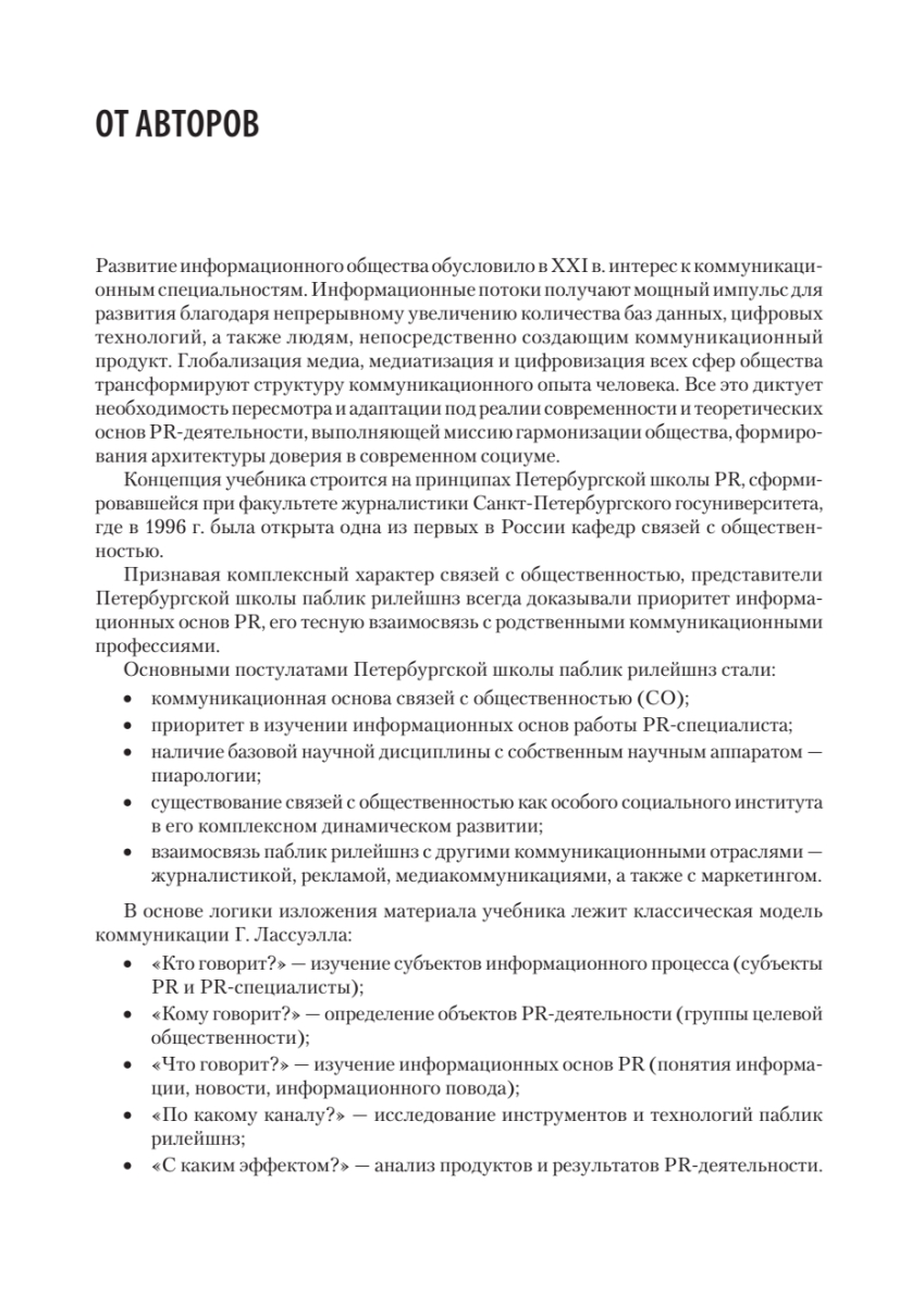 Третье издание представляет собой дополненный и исправленный текст предыдущего издания учебника "Основы теории связей с общественностью" 2018 года выпуска.В книге представлены основополагающие понятия теории связей с общественностью в соответствии с классической моделью коммуникационного процесса. Подробно рассмотрены такие вопросы, как субъекты и объекты PR-деятельности, наука о связях с общественностью, инструменты и технологии, продукты и результаты PR.Адресовано студентам вузов, обучающихся по направлению 42.03.01 "Реклама и связи с общественностью", а также для магистров, преподавателей, аспирантов социогуманитарных и экономических специальностей.