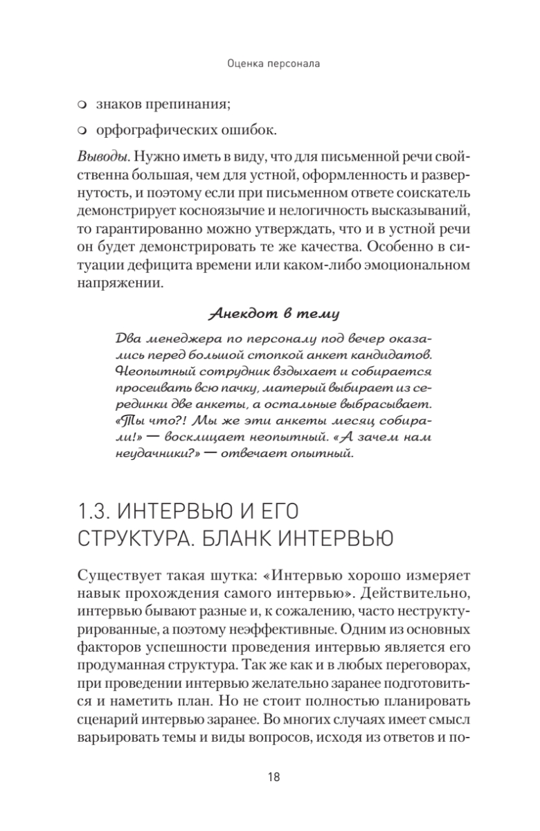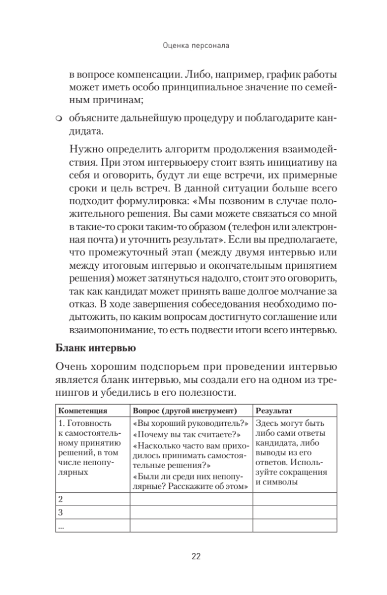 Часто HR-менеджеры и руководители, столкнувшись с необходимостью оценить персонал, не знают, с чего начать, как организовать оценку, какие методы использовать и, вообще, что оценивать. Книга предлагает максимально полное и четкое представление о том, как организовать систему оценки персонала в компании, какие инструменты, процедуры и методы стоит применять в первую очередь.В издании представлено детальное описание организации оценки персонала. Вы познакомитесь с тем, как обеспечить ее эффективность при подборе, увидите изнутри такой сложный метод, как ассессмент-центр, поймете, как разработать модель компетенций и построить систему оценки и развития персонала в компании, а также изучите другие методы оценки, их преимущества и ограничения.Книга содержит интерактивные практические упражнения и кейсы, позволяющие закрепить и освоить навыки оценки. В качестве бонуса предлагается раздел, посвященный вопросам эффективной коммуникации и правильного личного настроя HR-менеджера. Даны образцы упражнений, отчетов по результатам оценки, тестов и даже HR-кроссворд.Книга подойдет HR-специалистам, а также руководителям HR-подразделений и компаний — выстраивайте или перестраивайте существующие в компании процедуры, внедряйте простые и эффективные технологии, облегчающие каждодневный труд. Издание будет полезно менеджерам, руководителям и собственникам бизнеса — осваивайте алгоритмы работы, получив детальное представление о процедуре оценки.