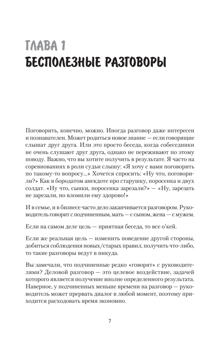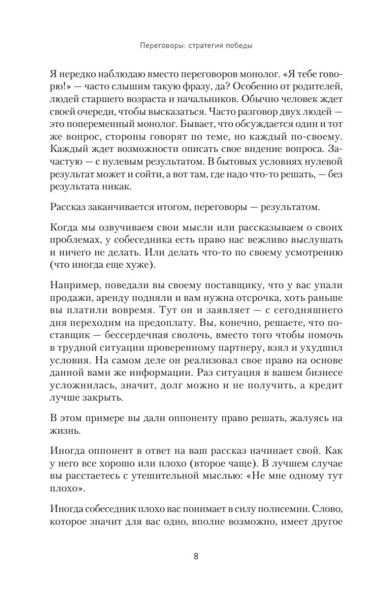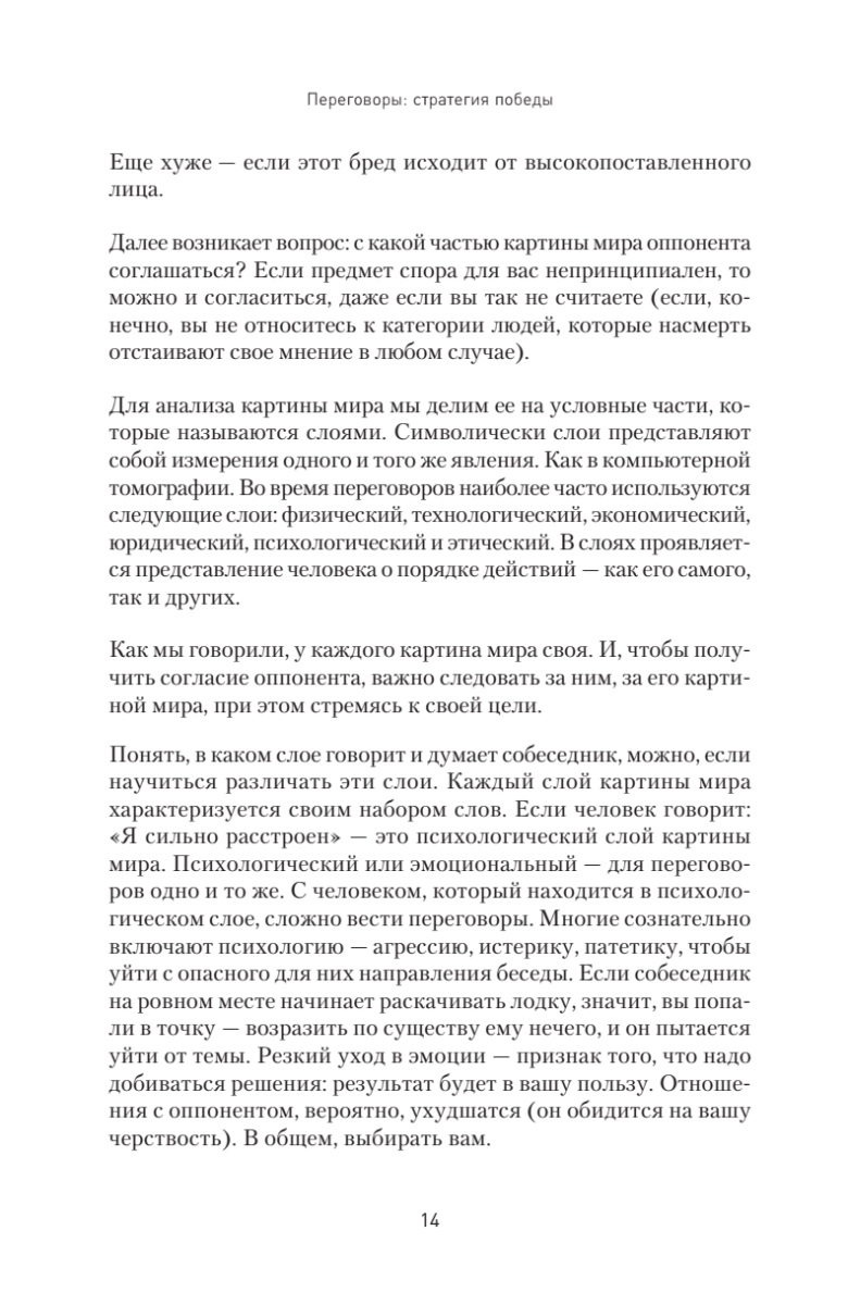 Мы все получаем не то, чего заслуживаем, а только то, о чем сможем договориться. Большинство наших потерь, ошибок и упущенных возможностей — это результат того, что кто-то оказался быстрее или точнее (не обязательно умнее) либо просто лучше устроился. Лучше сумел договориться. Так почему бы не научиться договариваться самим? Все равно мы каждый день ведем переговоры, даже если и не называем их так. Эта книга поможет превратить Ваши договорные навыки в систему победителя.Итоги переговоров ежедневно влияют на нашу жизнь. Круг общения, бизнес, карьера, быт — везде можно улучшить ситуацию, достигая большего путем переговоров. Автор предлагает применить собственную систему анализа переговорных ситуаций, которая научит вас и ваших сотрудников побеждать в них в два раза чаще. И делать это так, чтобы оппоненты добровольно выполняли принятые на себя обязательства. Книга основана на личном управленческом опыте автора и учитывает все нюансы ведения переговоров в российском бизнесе. Издание подойдет руководителям и собственникам компаний, менеджерам по продажам и специалистам, участвующим в переговорном процессе и решающим реальные бизнес-задачи. Также книга будет полезна всем, кому приходится договариваться с другими людьми и кто желает освоить приемы убеждения.