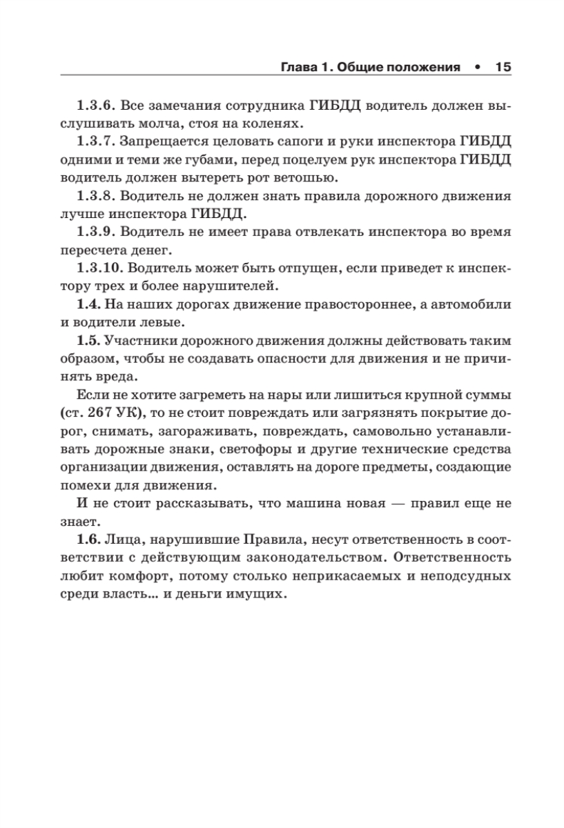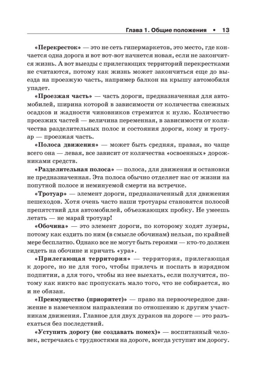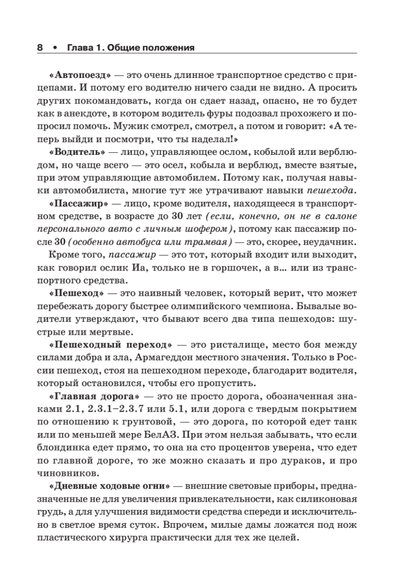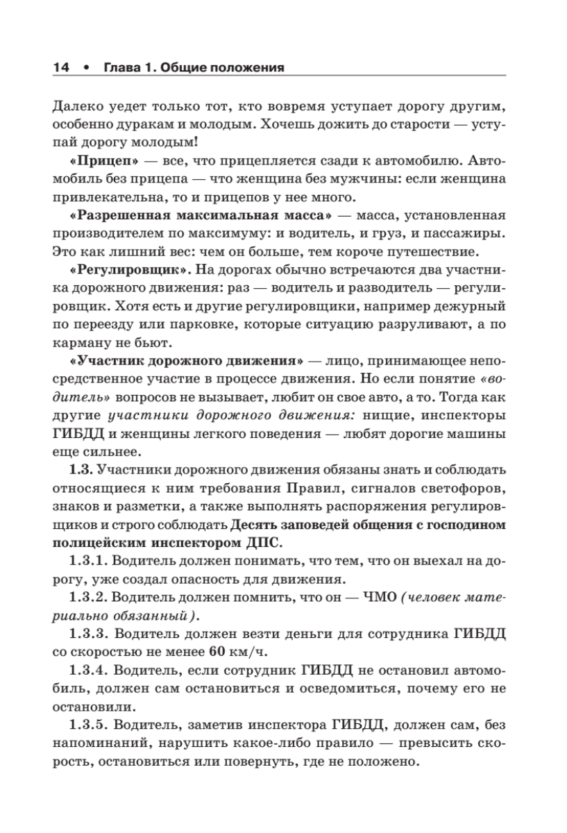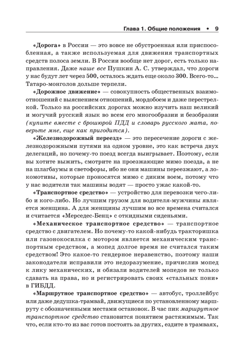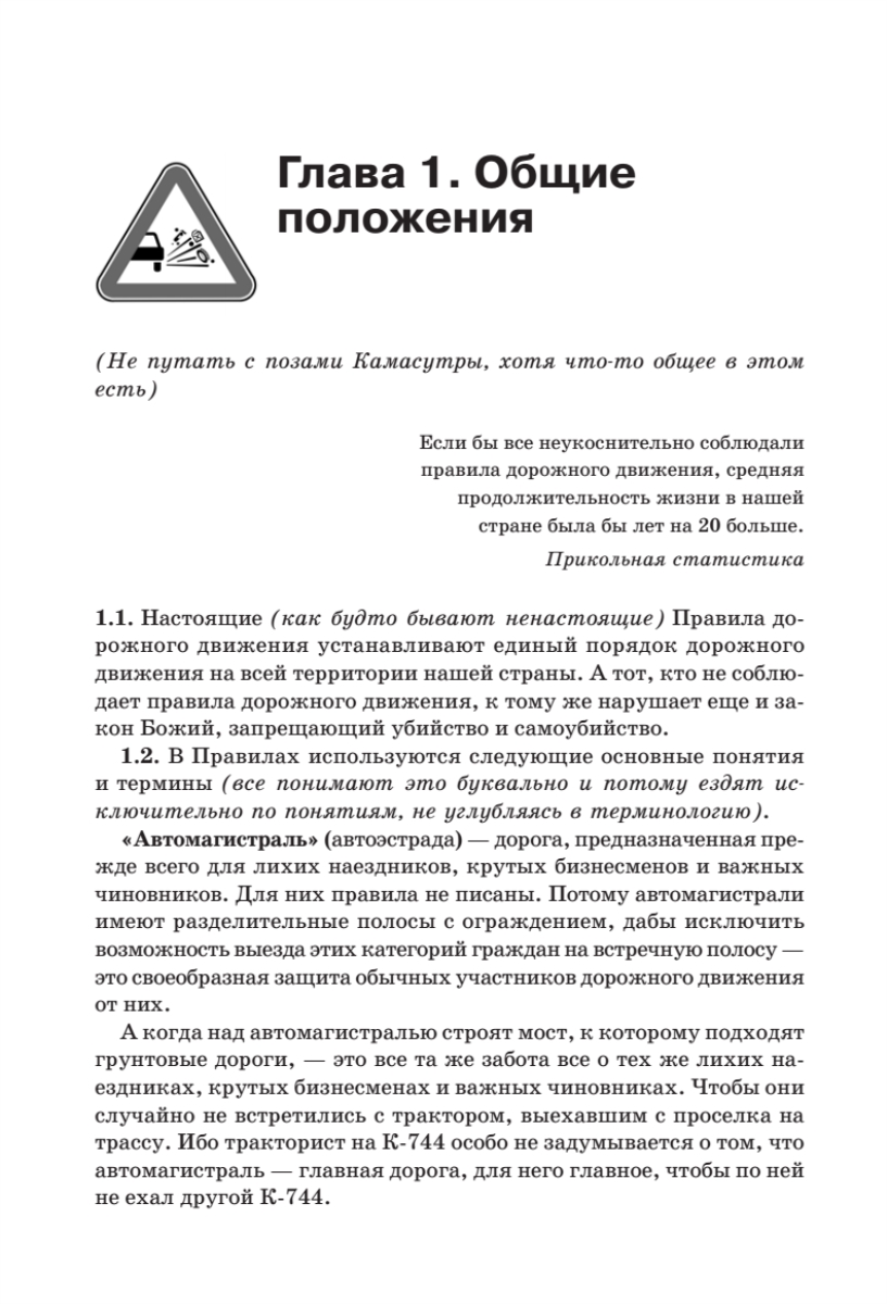 «Человечество выжило, потому что смеялось!» — утверждал Марк Твен. Он еще не знал, как это актуально для жителей нашей страны, особенно для тех, кто ежедневно выезжает на большую дорогу, в прямом и переносном смысле. Поэтому, чтобы не пропасть на дороге, нужно читать не только официальный документ ПДД, но и наши прикольные правила, так как они ближе к народу и помогут вам лучше понять и запомнить правила дорожного движения, ведь без чувства юмора на дороге просто не выжить.