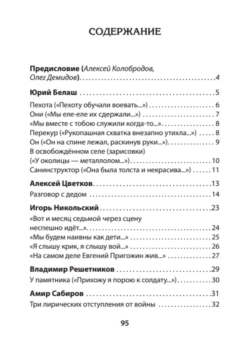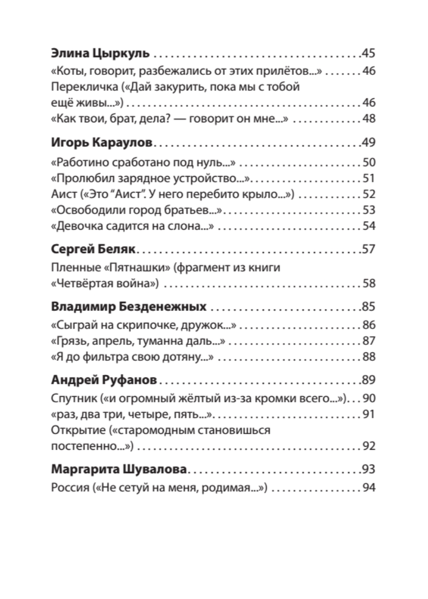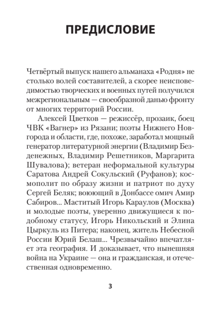 Алексей Цветков — режиссёр, прозаик, боец ЧВК «Вагнер» из Рязани; поэты Нижнего Новгорода и области (где рождается мощная литературная энергия) — Владимир Безденежных, Владимир Решетников, Маргарита Шувалова; ветеран неформальной культуры Саратова Андрей Сокульский (Руфанов); космополит по жизни и патриот по духу Сергей Беляк; воюющий в Донбассе омич Амир Сабиров... Маститый Игорь Караулов из Москвы и молодые поэты Игорь Никольский и Элина Цыркуль из Питера; житель Небесной России Юрий Белаш — география чрезвычайно впечатляет и доказывает, что война на Украине одновременно и гражданская, и отечественная.