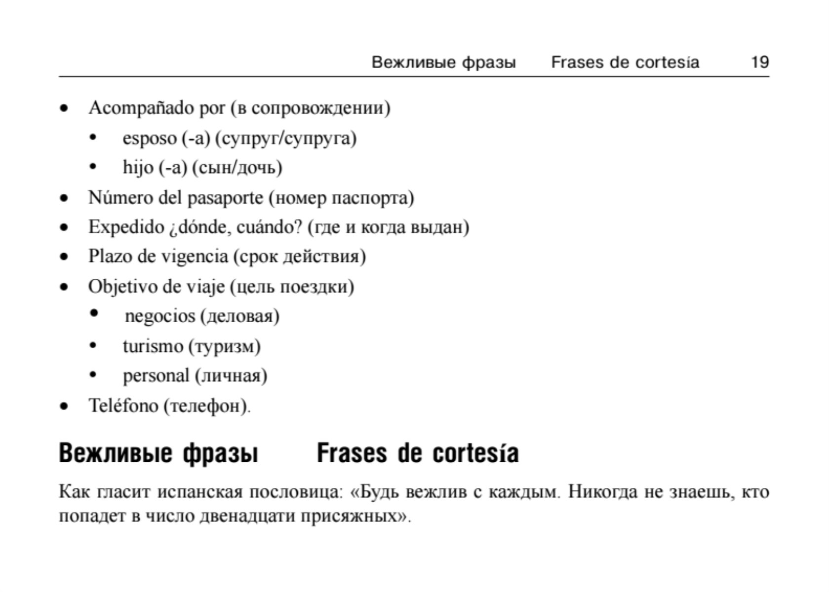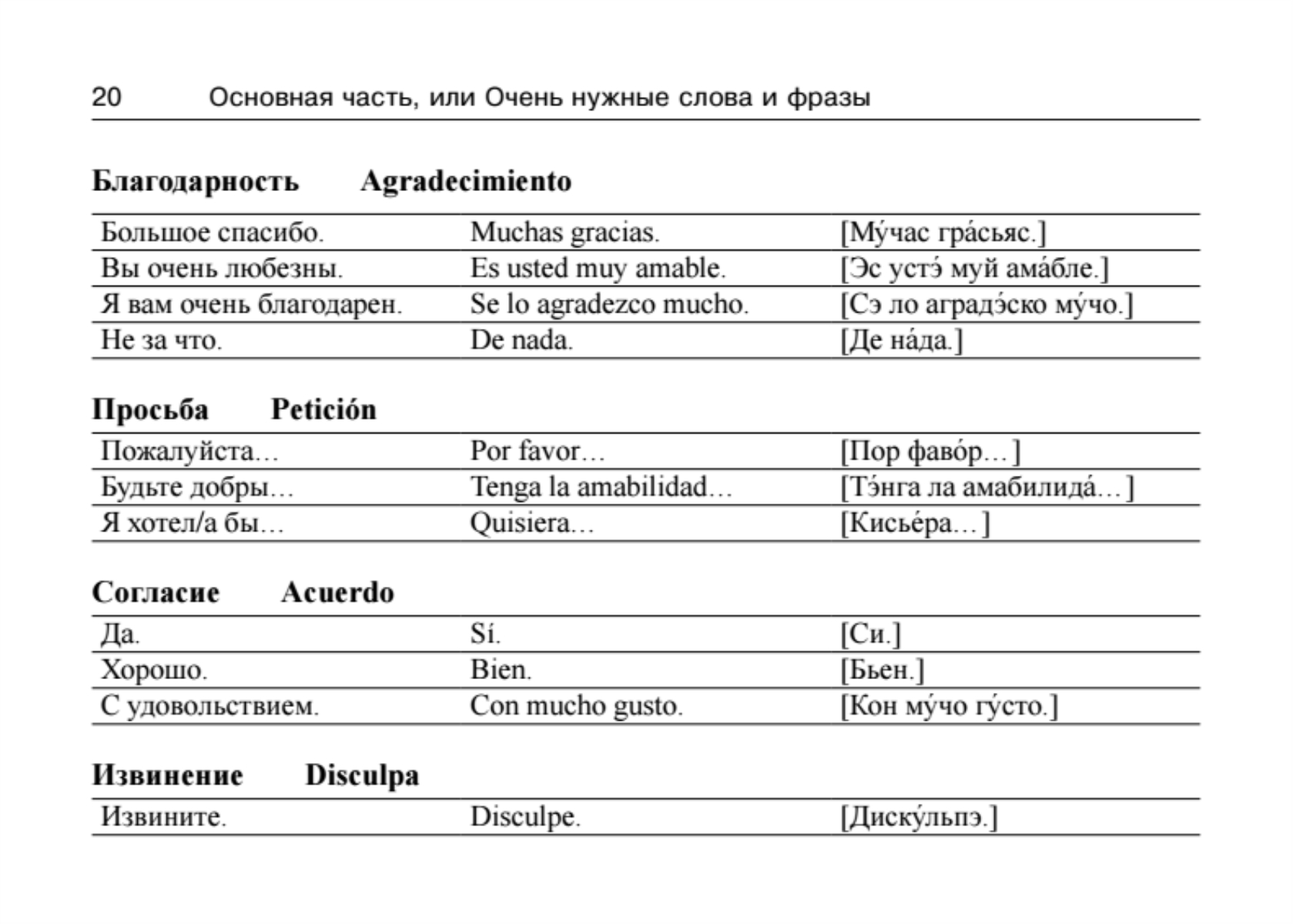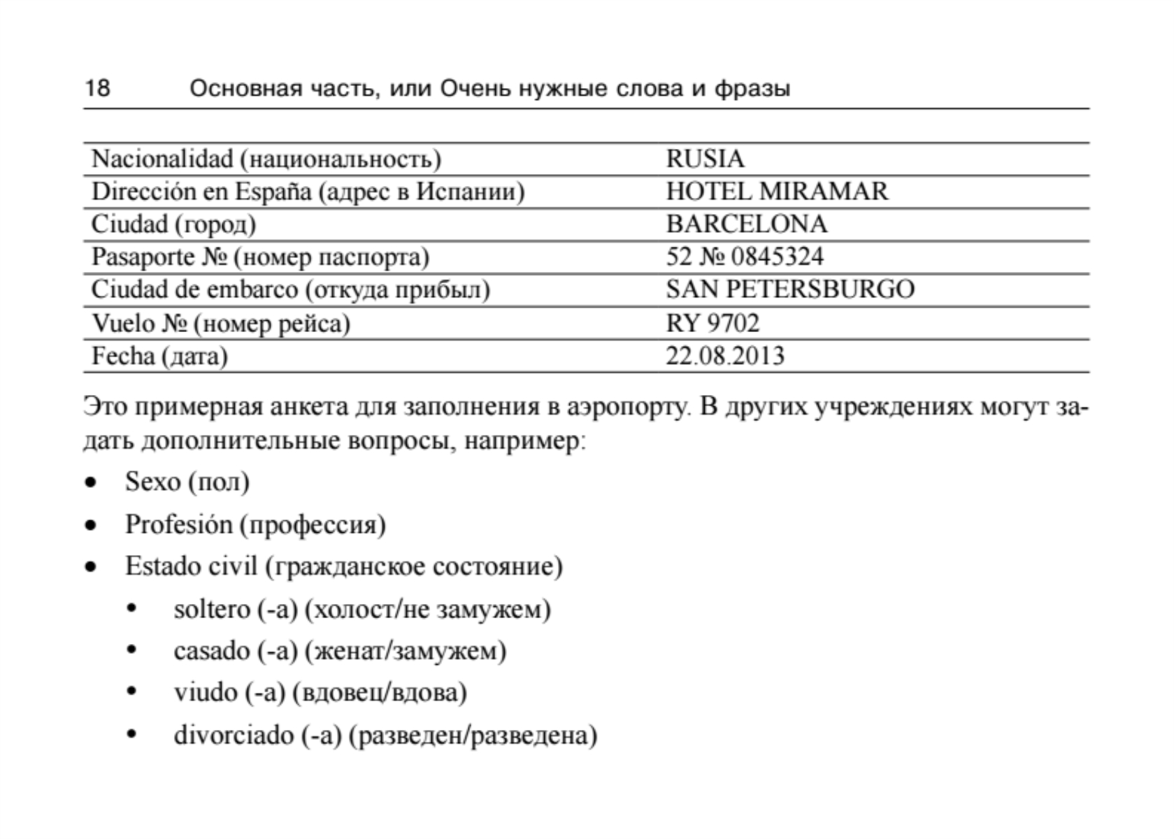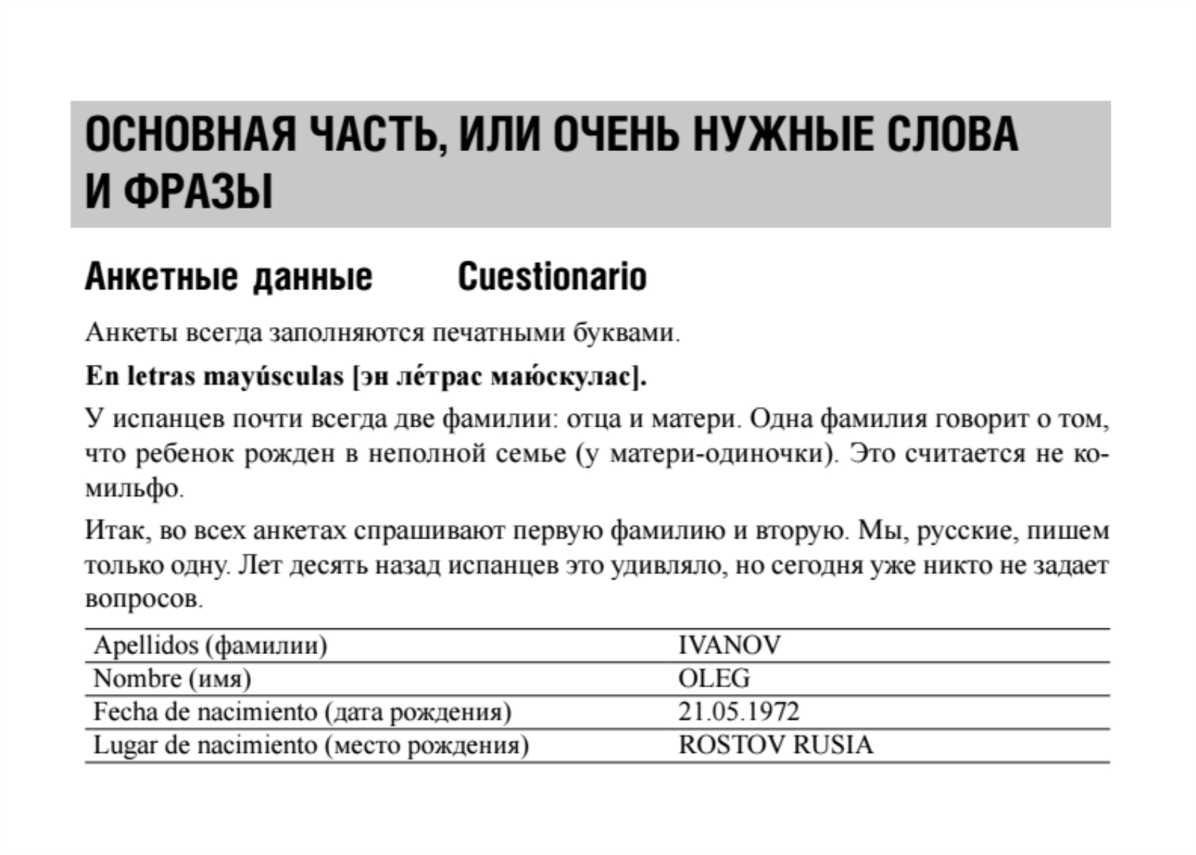 Воспользуйтесь кратким разговорником. В нем вы не только найдете наиболее употребимые слова и выражения на разные темы, но и познакомитесь с настоящим живым испанским языком. В каждом разделе — небольшой тематический словарик и анекдоты. Да-да, не удивляйтесь! Именно анекдот способен в нескольких фразах передать характер целой нации. Так считает автор разговорника Светлана Белоконева, которая уже много лет живет в Испании. Ее неформальный подход поможет вам быстро овладеть испанским языком и свободно говорить на многие темы.