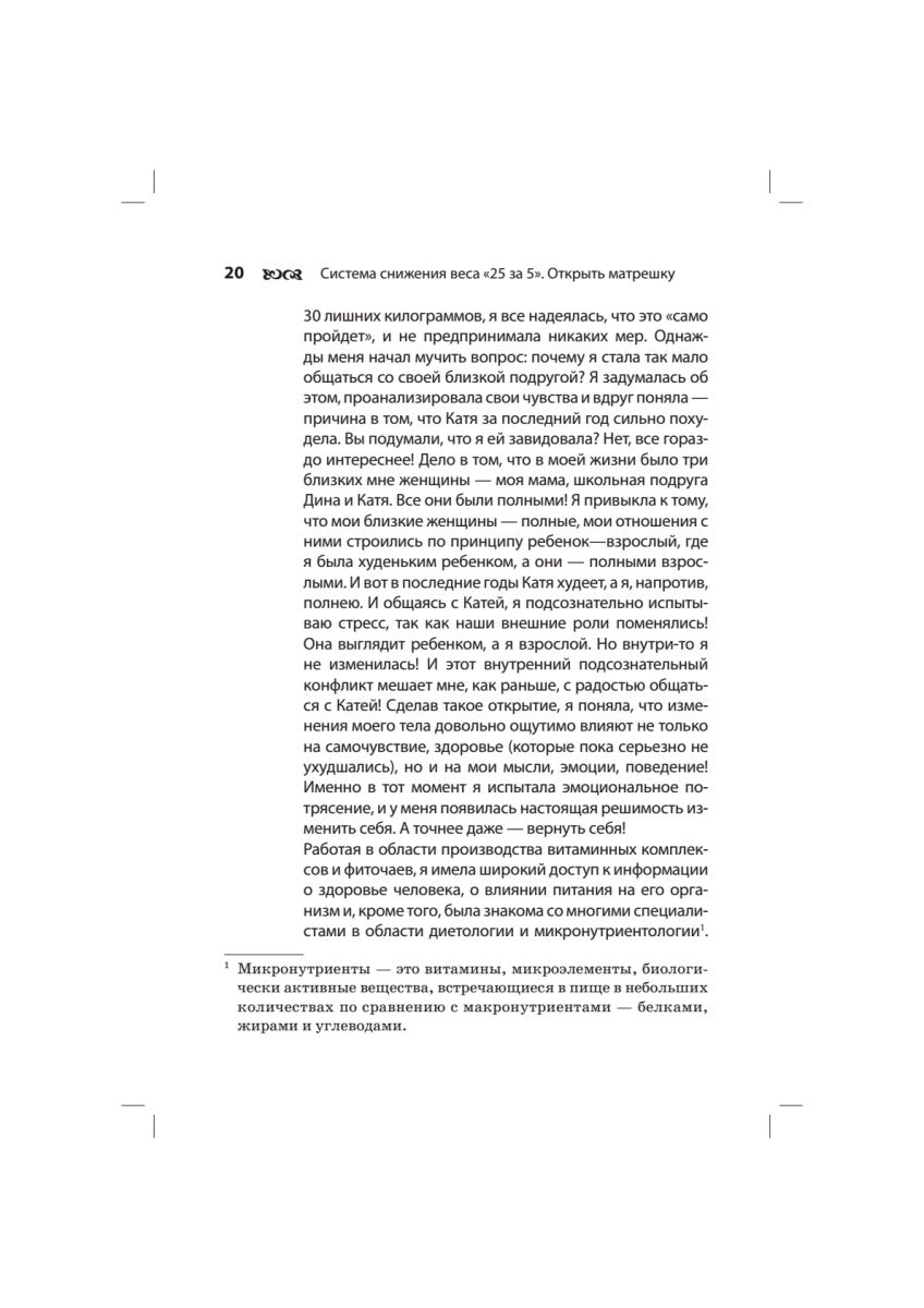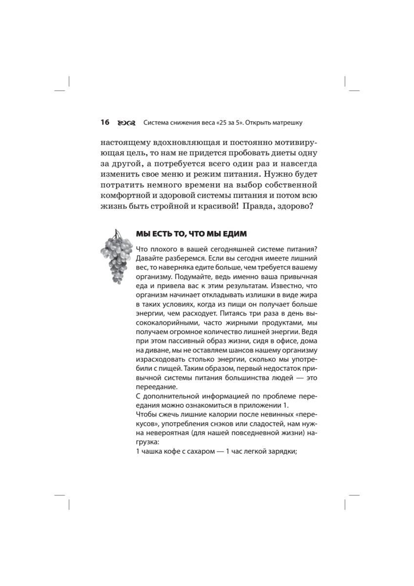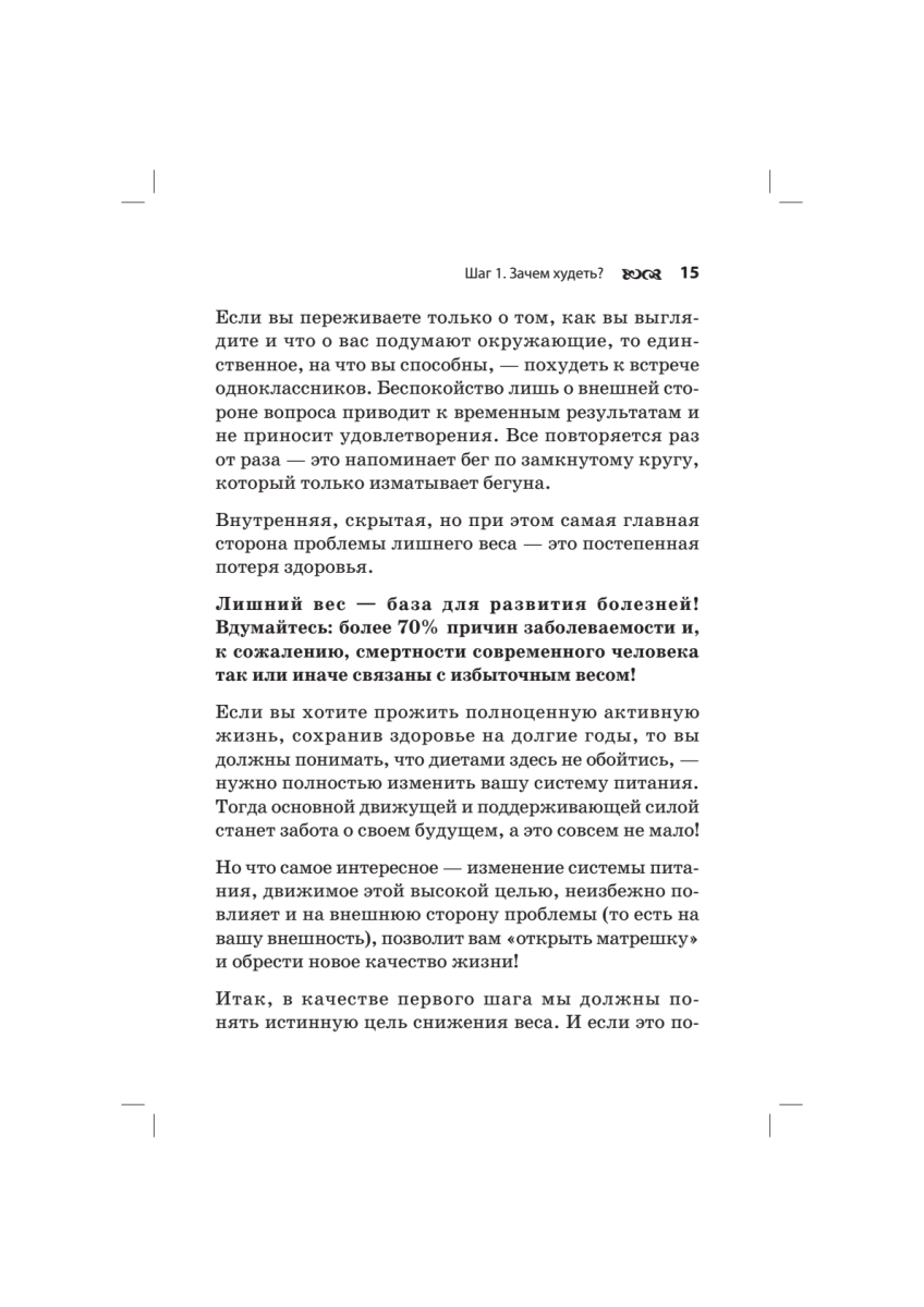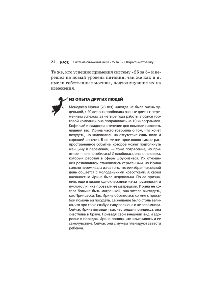 Оксана Филонова — директор компании «Натурофарм», производящей натуральные витаминно-минеральные препараты. Но в этой книге речь пойдет вовсе не о «волшебной таблетке», которая позволяет худеть и при этом не отказывать себе в бутербродах на ночь!До недавнего времени Оксана была типичной современной женщиной, больше заботящейся о своей семье и ответственной работе, чем о здоровье. Неудивительно, что Оксана, как и многие российские женщины, в определенном возрасте столкнулась с проблемой лишнего веса. Популярные диеты не помогли ей похудеть. Тогда Оксана выработала свою систему — и всего за 5 месяцев она потеряла 25 килограммов!«Прямо в эту минуту миллионы женщин ведут борьбу с избыточным весом, но лишь немногие смогут окончательно избавиться от лишних килограммов. Я хочу поделиться своим успешным опытом снижения веса с помощью здорового питания. Надеюсь, что мой пример поможет вам изменить отношение к еде, научиться уважать свой организм и, самое главное, — укрепить здоровье. Я знаю, что уже через три месяца каждая из вас может стать стройнее и здоровее. Я верю, что те женщины, которые последуют моему примеру, уже через год будут выглядеть как настоящие принцессы! О том, как этого добиться, я и расскажу на страницах этой книги».