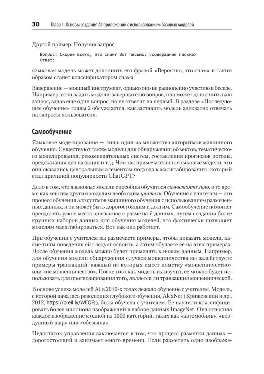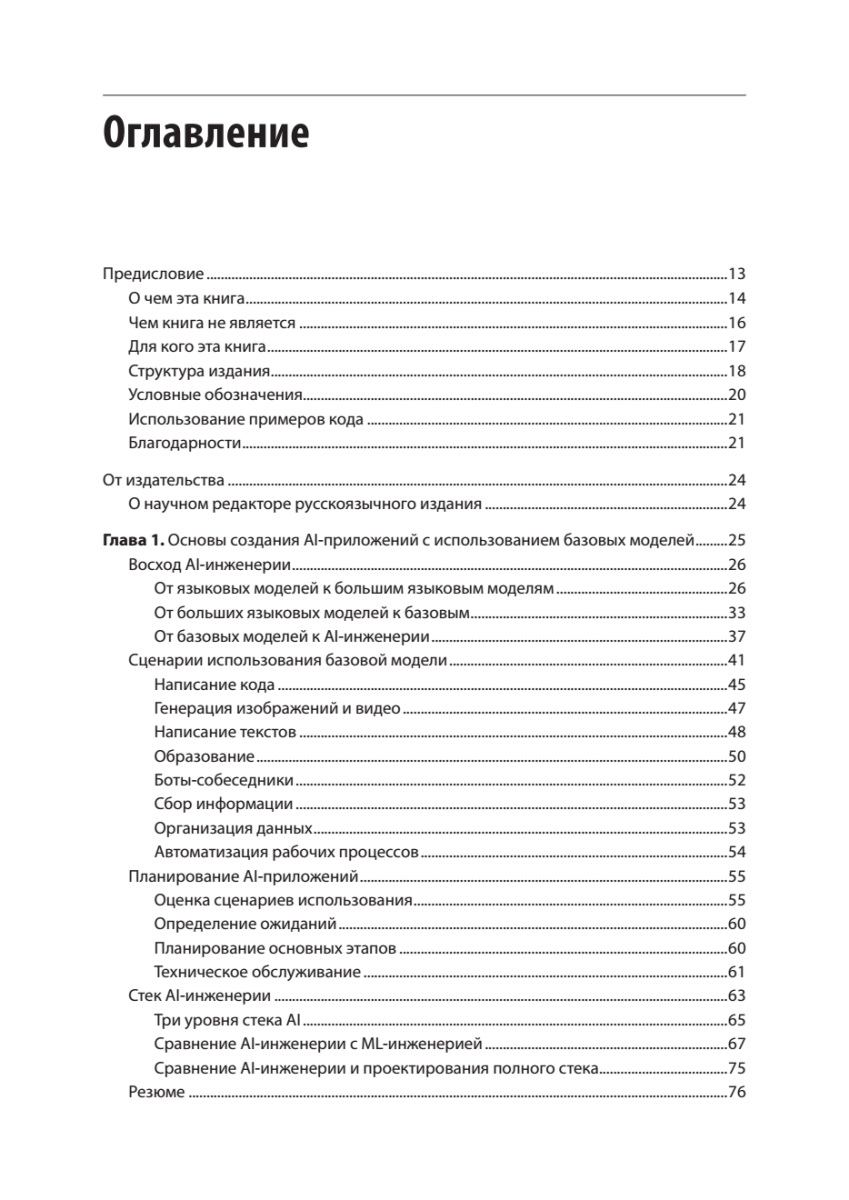 Базовые модели открыли путь множеству новых сценариев применения AI, одновременно снизив входной порог для создания продуктов на основе искусственного интеллекта. Так AI из тайного учения превратился в мощный инструмент разработки, доступный каждому — даже тем, у кого еще нет опыта работы с ним.В этом практическом руководстве Чип Хьюен рассказывает об AI-инженерии — процессе создания приложений на основе готовых базовых моделей. Разработчики таких приложений узнают, как ориентироваться на огромных просторах искусственного интеллекта: научатся разбираться в типах моделей, наборах данных, эталонных тестах для их оценки и, на первый взгляд, бесконечном множестве шаблонов приложений. В книге также представлена практическая методика разработки приложения на основе AI и его эффективного развертывания.