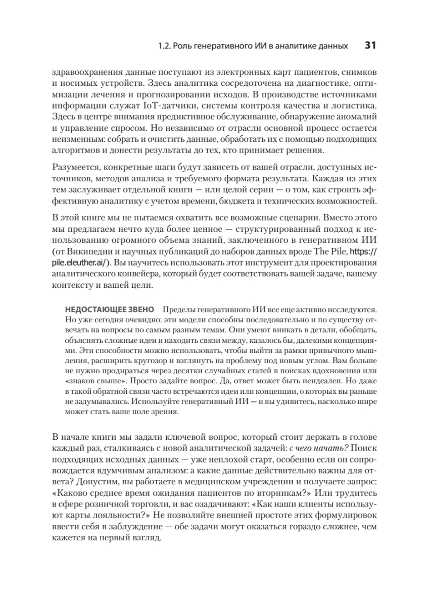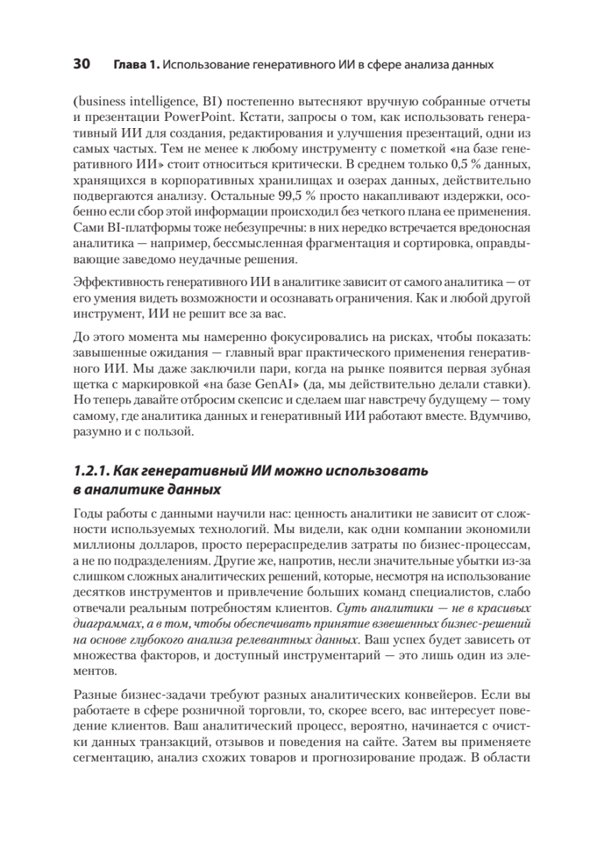 Эта книга — практическое руководство для тех, кто превращает данные в решения. Шаг за шагом вы разберетесь, как современные методы искусственного интеллекта помогают не просто интерпретировать массивы информации, но и находить скрытые закономерности, прогнозировать будущее и создавать конкурентные преимущества для бизнеса. Вы получите системное понимание инструментов анализа, узнаете о лучших практиках применения машинного обучения и научитесь интегрировать ChatGPT в ежедневные рабочие процессы.