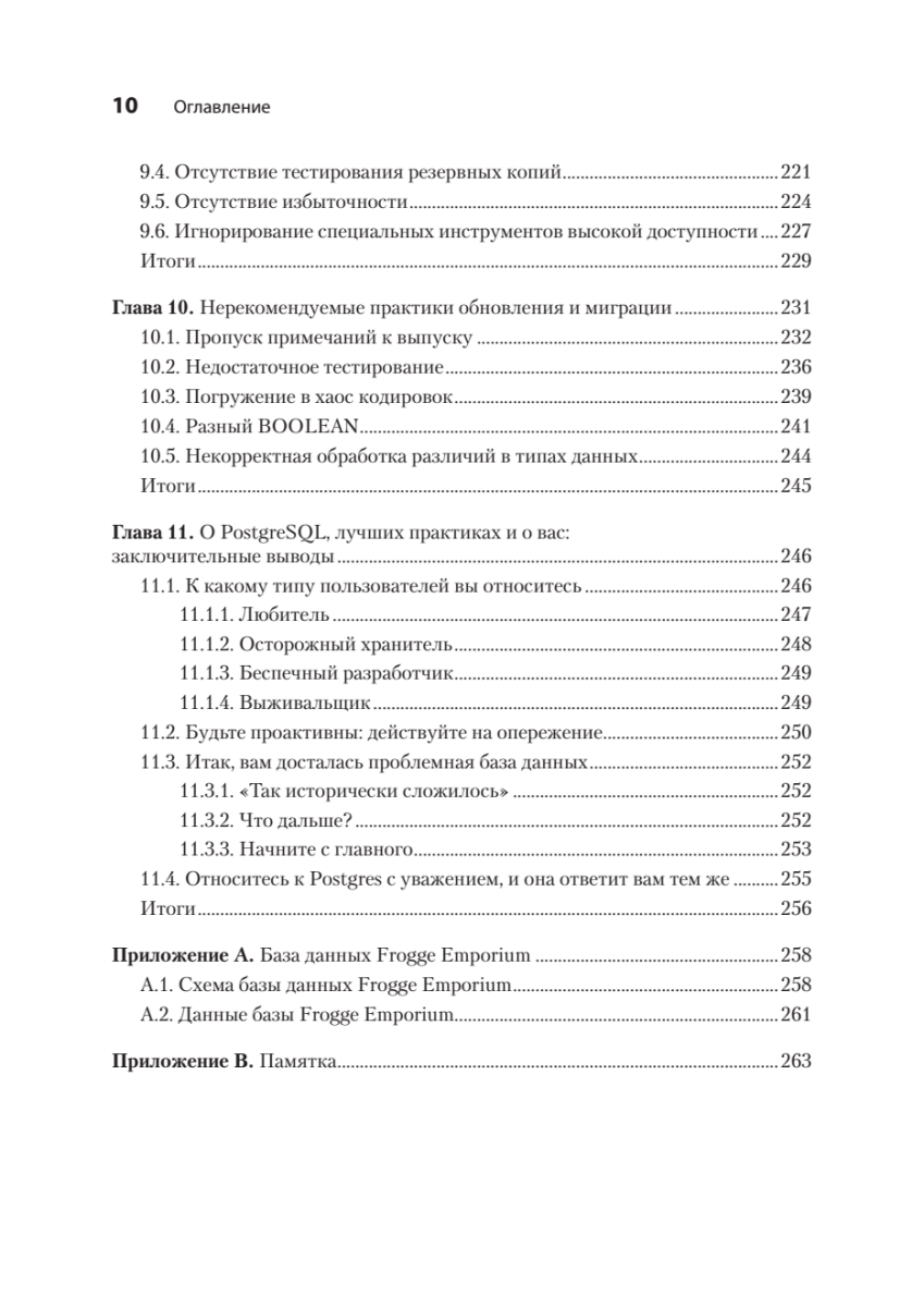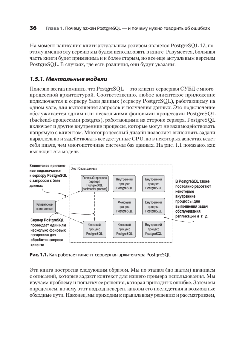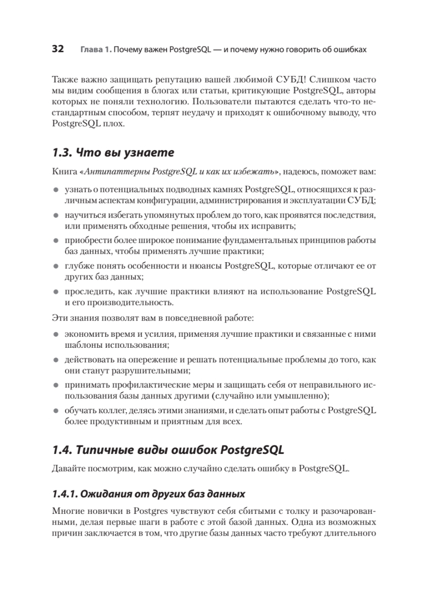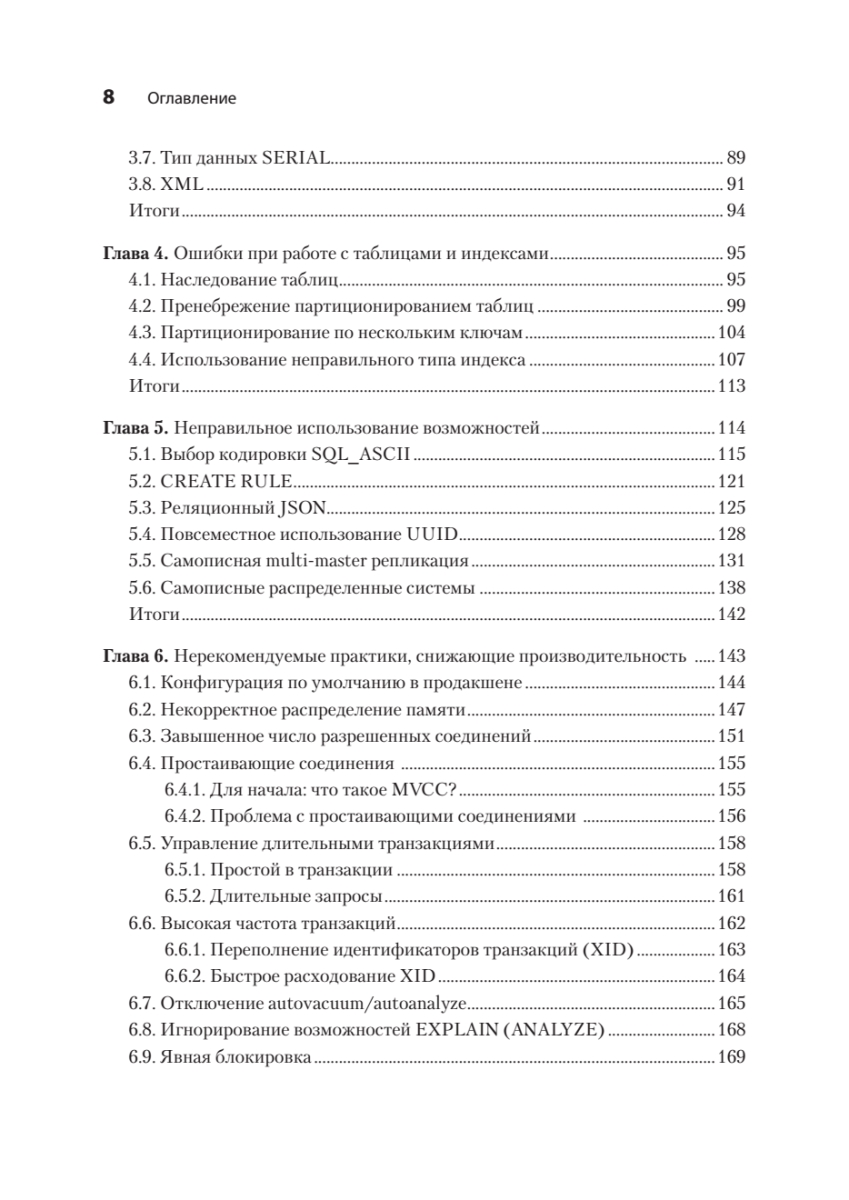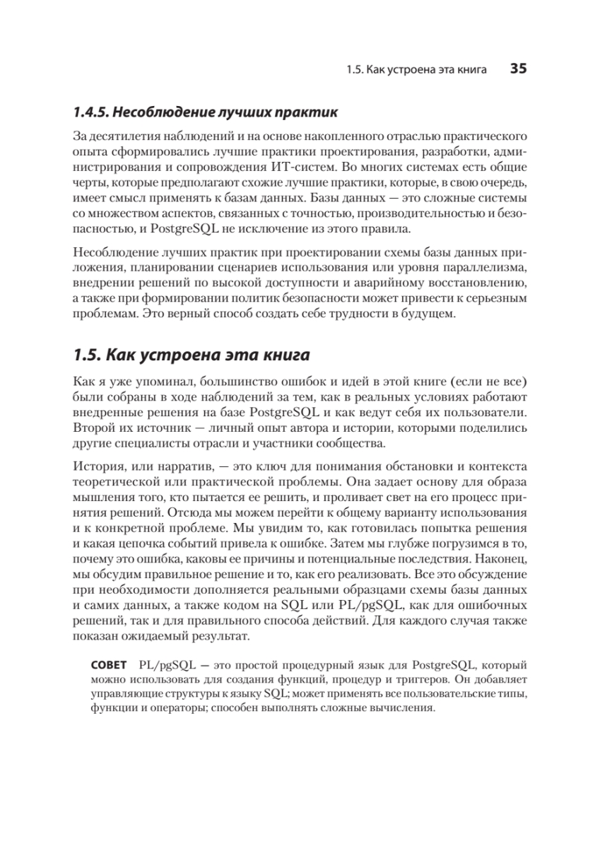 Исправление ошибок в базах данных PostgreSQL может быть трудоемким и рискованным процессом — особенно при внесении изменений в работающую систему в реальном времени. К счастью, можно учиться на ошибках, которые уже совершили другие! Автор подробно описывает, как выявлять и предотвращать самые распространенные, опасные и скрытые антипаттерны проектирования при работе с PostgreSQL. Узнайте, откуда берутся ошибки в таких ключевых областях, как типы данных, функции, безопасность и обеспечение высокой доступности СУБД. Для каждой ошибки вы найдете реальный кейс, иллюстрирующий истоки проблемы, и получите конкретные рекомендации по ее устранению. Особую ценность представляют наглядные примеры кода, схемы и сравнительные таблицы преимуществ и недостатков различных подходов.