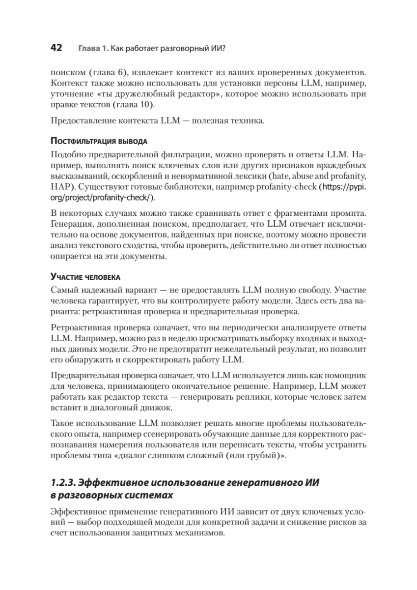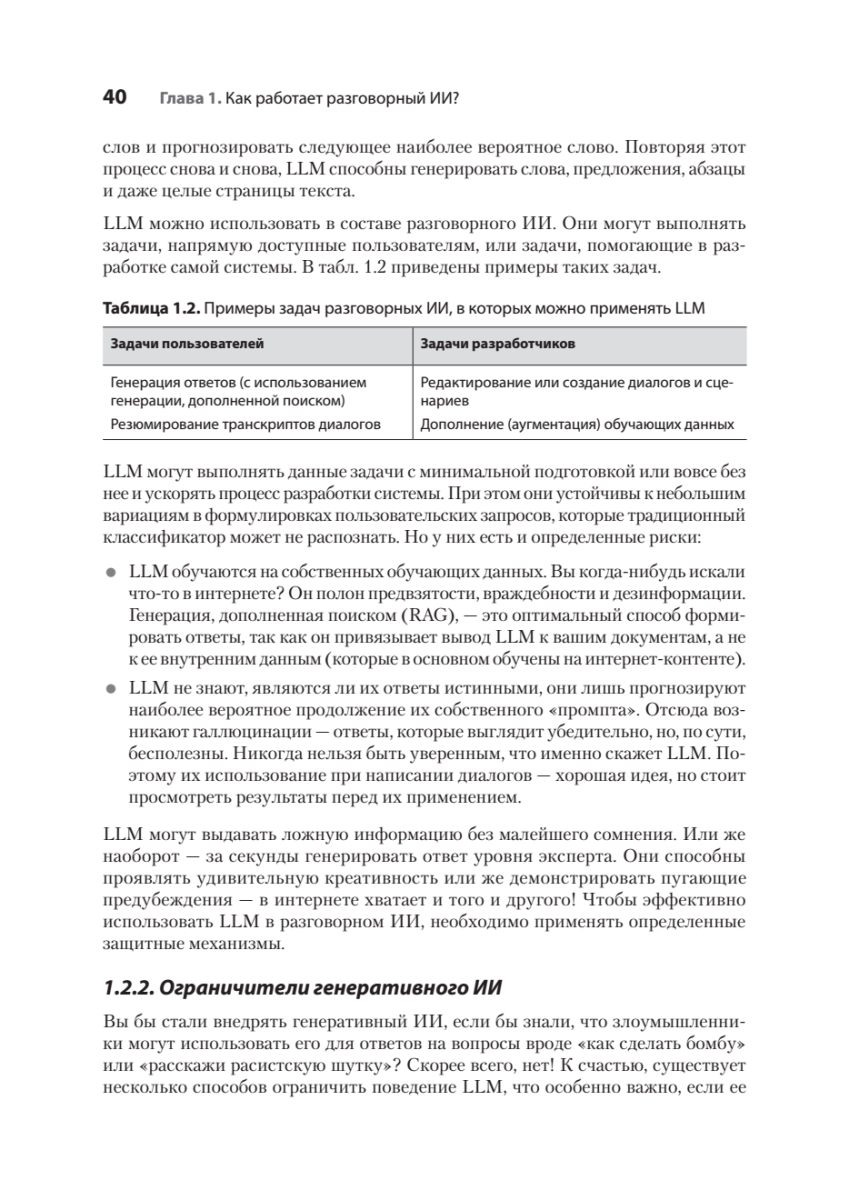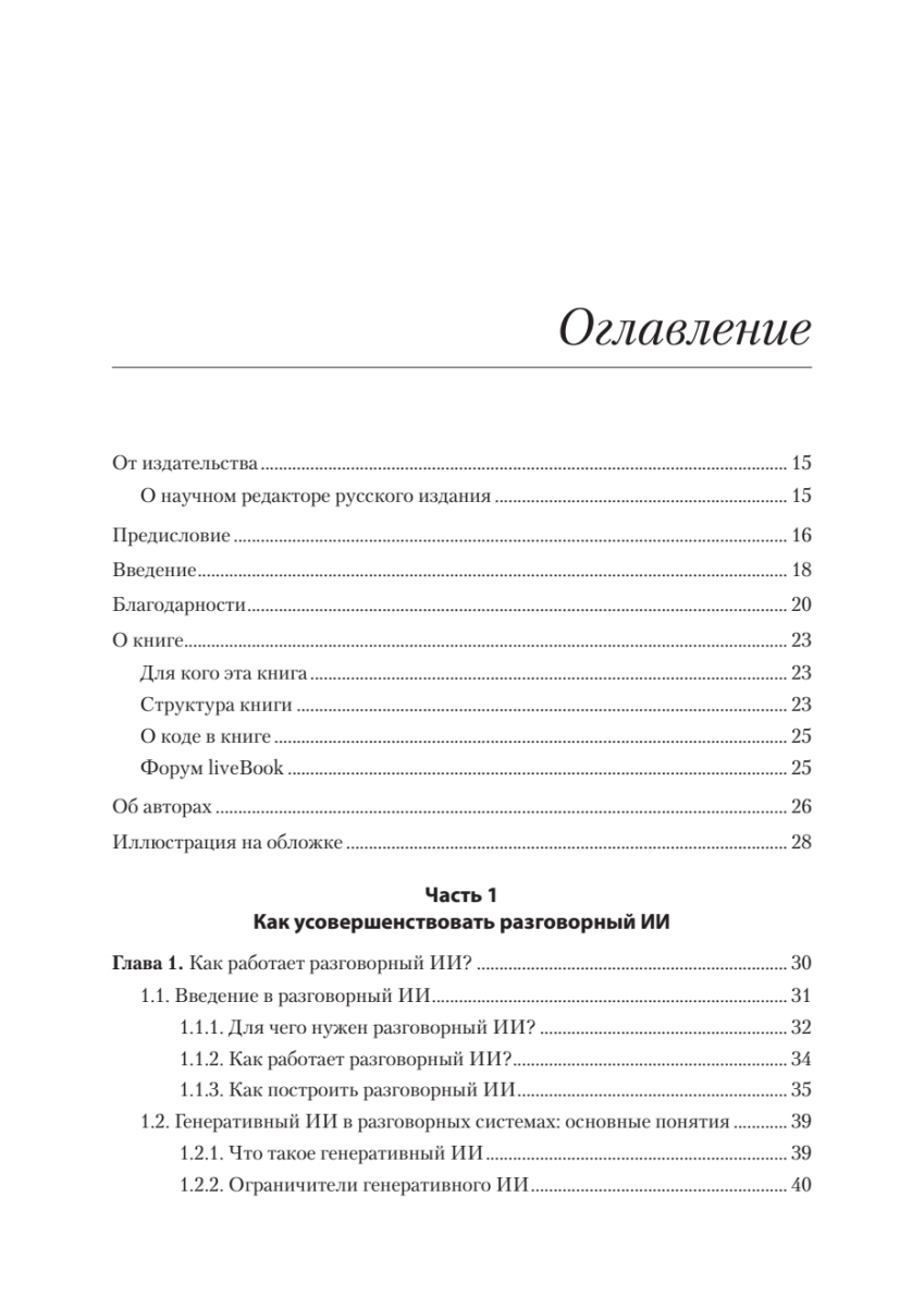 Новые мощные фреймворки для разработки чат-ботов и модели генеративного ИИ практически сняли ограничения, связанные с некорректным распознаванием намерений пользователя и генерацией бессодержательных ответов. Освойте разработку чат-ботов на основе больших языковых моделей (LLM) и других современных инструментов, а также проектирование разговорных систем, ориентированных на реальный пользовательский опыт.Книга «Эффективный разговорный ИИ» посвящена созданию надежных и масштабируемых чат-ботов, пригодных для использования в корпоративной среде. Вы узнаете, как уточнять пользовательские намерения с помощью LLM, корректно обрабатывать нестандартные запросы и применять генерацию, дополненную поиском (RAG), чтобы ответы бота всегда оставались актуальными и релевантными. По мере прочтения разберетесь, как построить систему обратной связи для непрерывного улучшения качества диалогов и освоите практики безопасной интеграции генеративного ИИ в существующие архитектуры.