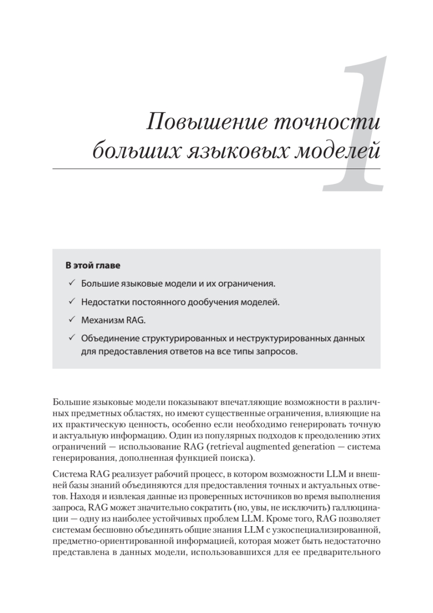 Система генерации ответа, дополненная результатами поиска (Retrieval Augmented Generation, RAG) автоматически выбирает и предоставляет контекст, характерный для конкретной предметной области, что значительно улучшает способность LLM генерировать точные ответы без искажений. Подход GraphRAG основывается на использовании графа знаний для структурирования входных данных и существующих в них связей, чтобы получить содержательные и релевантные промпты.Создайте и разверните систему GraphRAG производственного уровня. Научитесь извлекать структурированные знания из текста и комбинировать методы векторного поиска с поиском по графам. Книга богата практическими примерами: от создания инструмента поиска по векторному сходству и приложения Agentic RAG до оценки эффективности и точности результатов работы такого приложения.