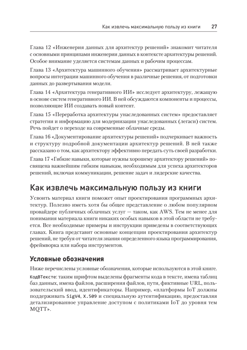 Овладейте искусством дизайна архитектур и станьте успешным архитектором решений. Книга, написанная опытными техлидами AWS Саурабхом Шриваставой и Ниланджали Шривастав, выходит за рамки традиционных руководств для подготовки к сертификации. В ней вы найдете подробную аналитику и передовые методы, предназначенные для удовлетворения конкретных потребностей клиентов и решения проблем, с которыми сталкиваются современные архитекторы решений.Издание описывает новые интересные возможности, которые позволят вам оставаться в авангарде этой стремительно развивающейся сферы. Большие языковые модели, генеративный ИИ, инновации в области глубокого обучения – все эти революционные достижения формируют будущее технологии. Такие темы, как облачно-ориентированные архитектуры, инженерия данных, облачная оптимизация, модернизация мейнфреймов и создание экономичных и безопасных архитектур, продолжают оставаться актуальными в современной технологической сфере. В книге рассматриваются эти перспективные и ключевые технологии, а также приводится пошаговое описание процесса проектирования архитектур решений, начиная с ключевых принципов. Она снабдит вас знаниями, необходимыми, чтобы стать успешным архитектором решений, а также поможет усовершенствовать гибкие навыки и тем самым получить возможность для развития карьеры.Раскройте потенциал передовых технологий, изучайте практические выводы на реальных сценариях и повышайте мастерство.